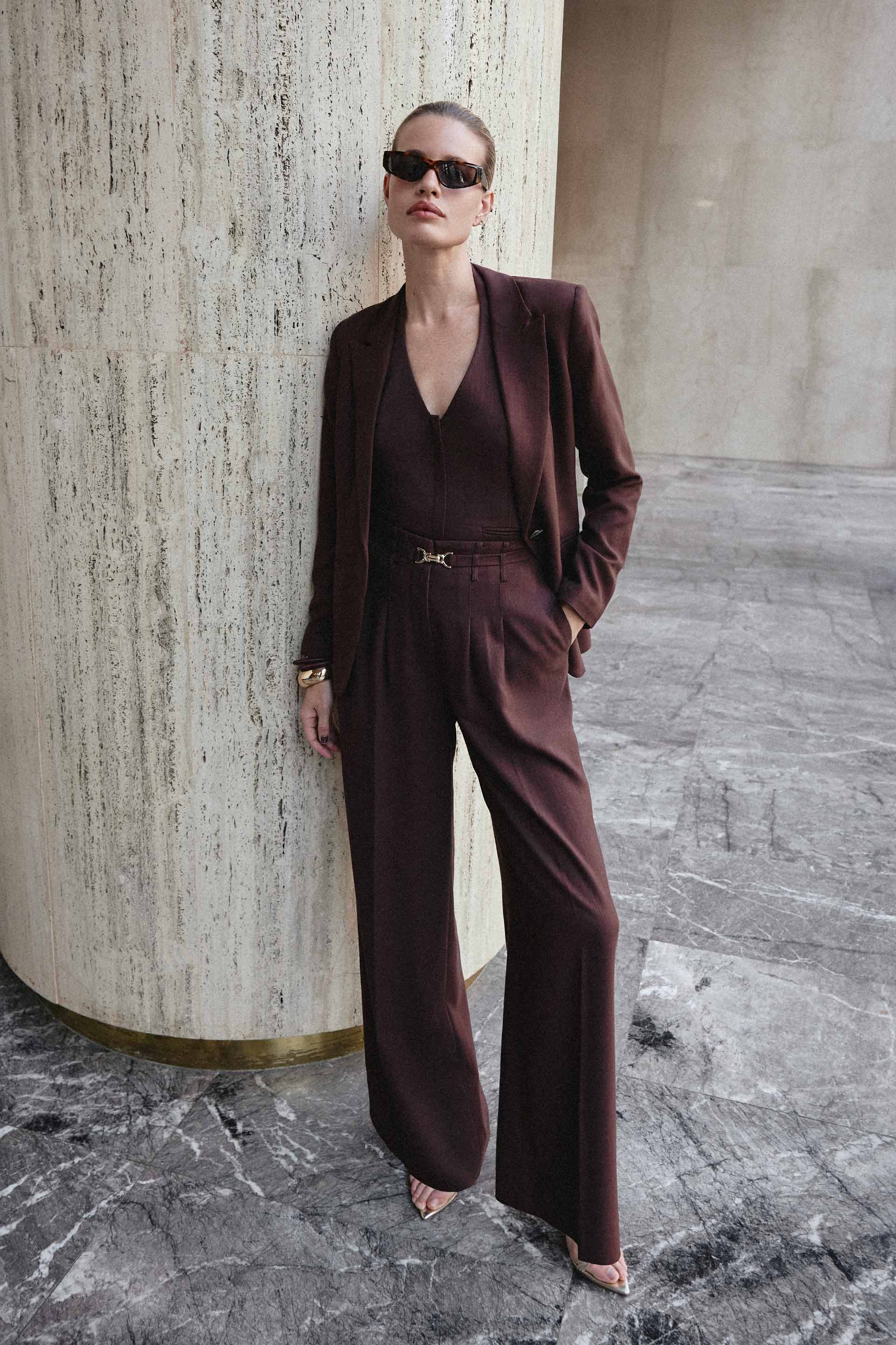 Pantalón de sastrería de viscosa efecto lino, tiro alto y pierna ancha. Con doble pinza frontal, cierre central y cinturón con hebilla metálica. Combinalo con el blazer o el chaleco Aquila para armar un total look moderno y elegante.