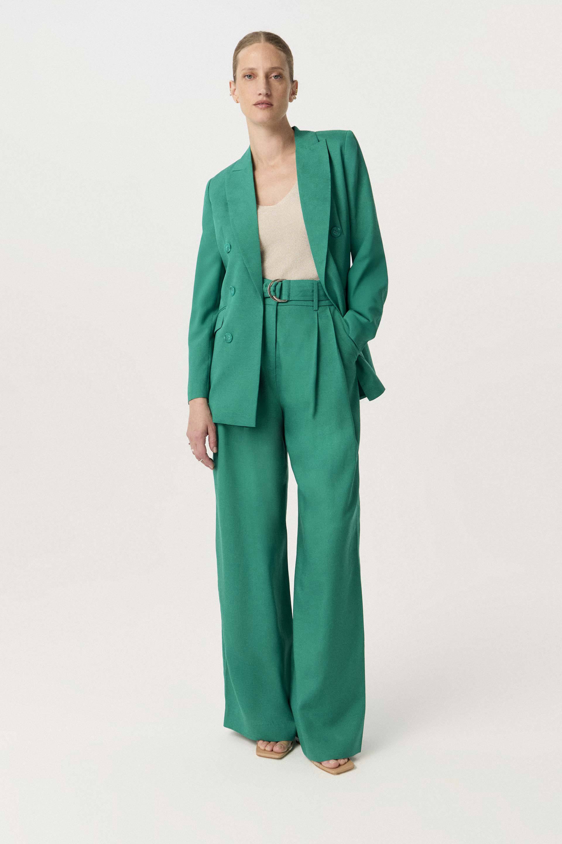 Pantalón de sastrería en lino tencel, tiro alto y pierna ancha. Posee acceso central, bolsillos diagonales y cinturón ancho con medialunas metálicas que aportan un toque moderno. Perfecto para eventos de día o salidas casuales. Combinalo con el blazer o el chaleco Ítalo y armá un total look moderno y relajado.