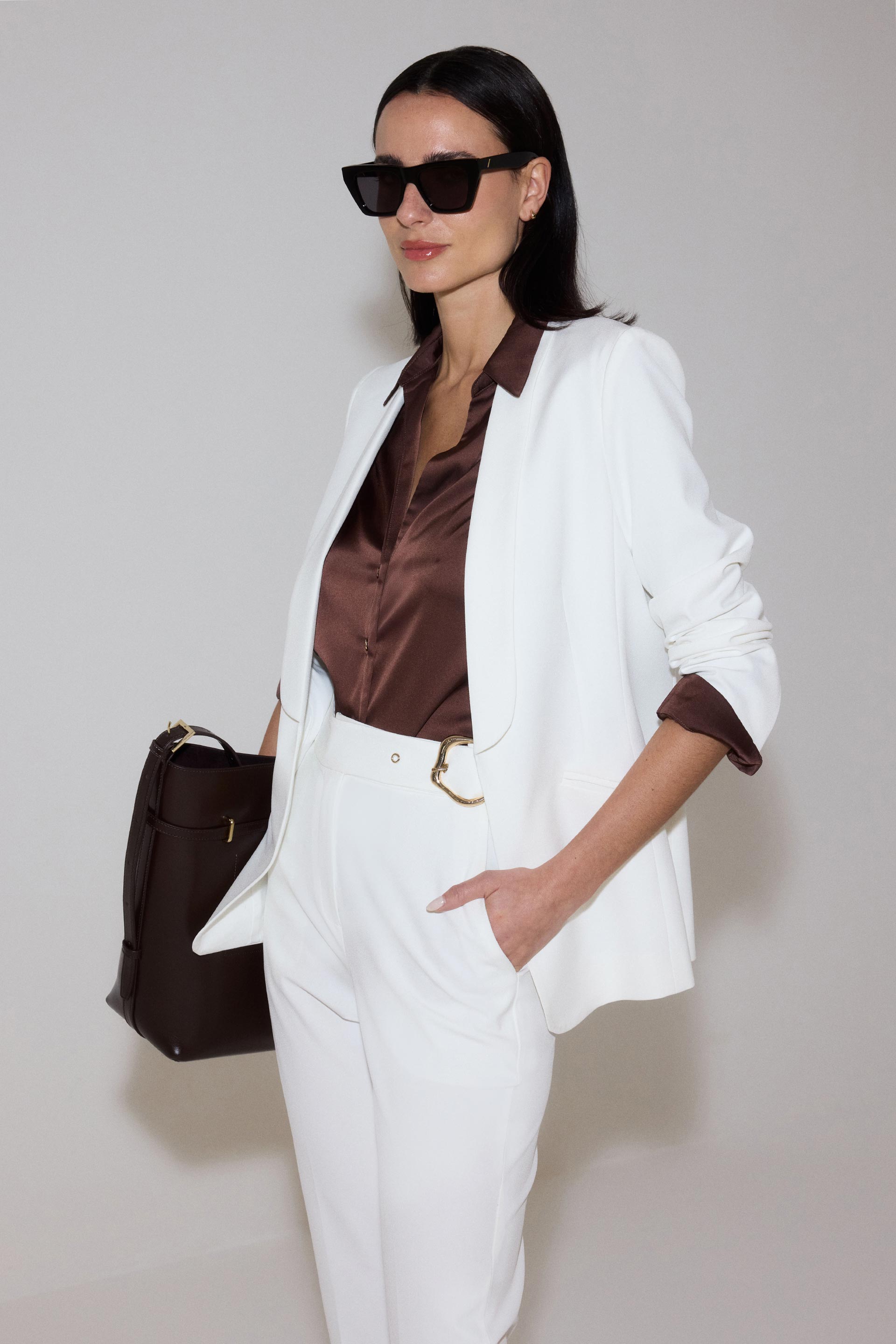 Pantalón sastrero de crepe elastizado, de tiro alto y pierna slim. Posee cintura cruzada con hebilla metálica de forma orgánica y bosillos laterales. Un clásico renovado con un detalle distintivo que lo hace único. Combinalo con el blazer Pascal y obtené un total look sofisticado ideal para ocasiones formales.