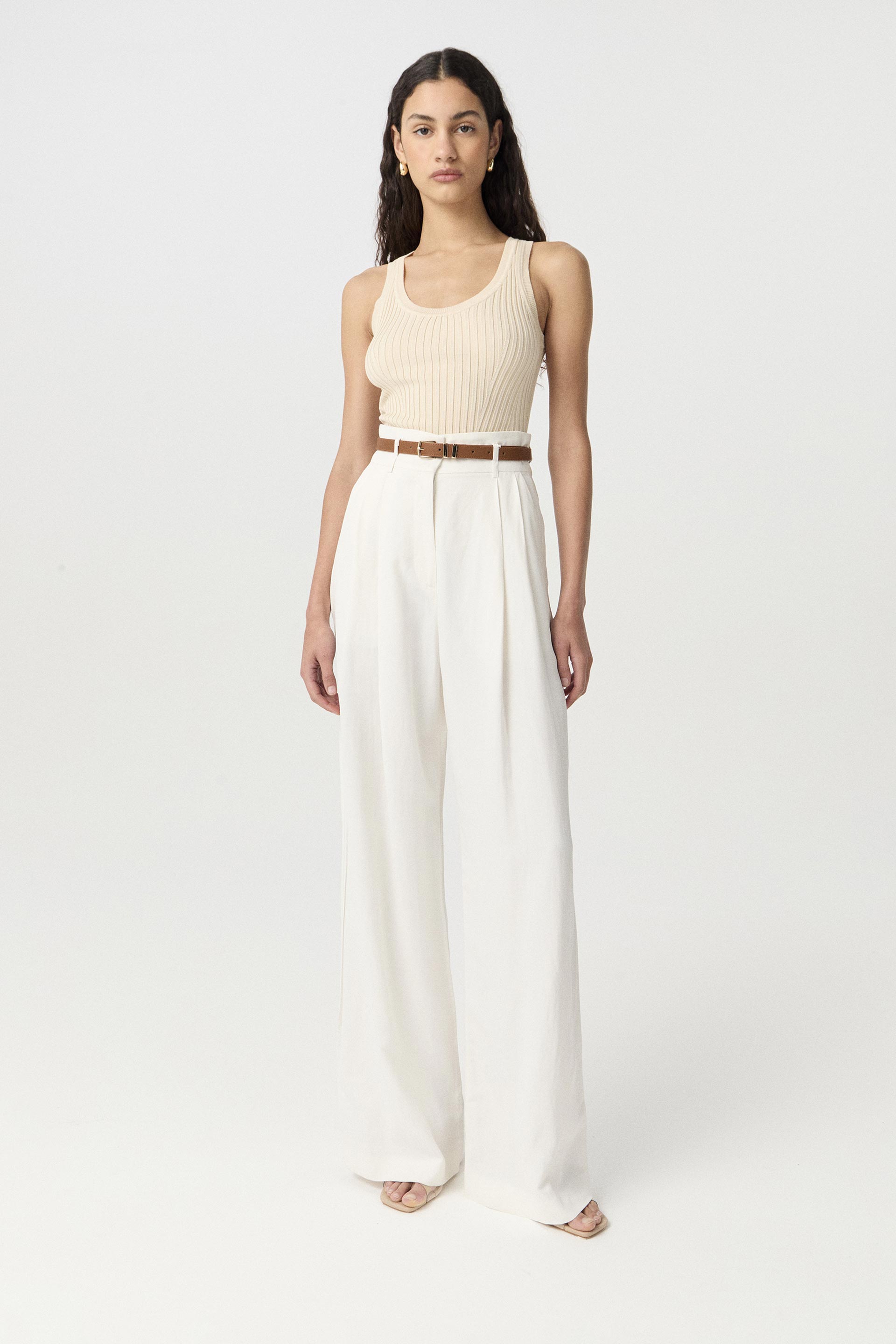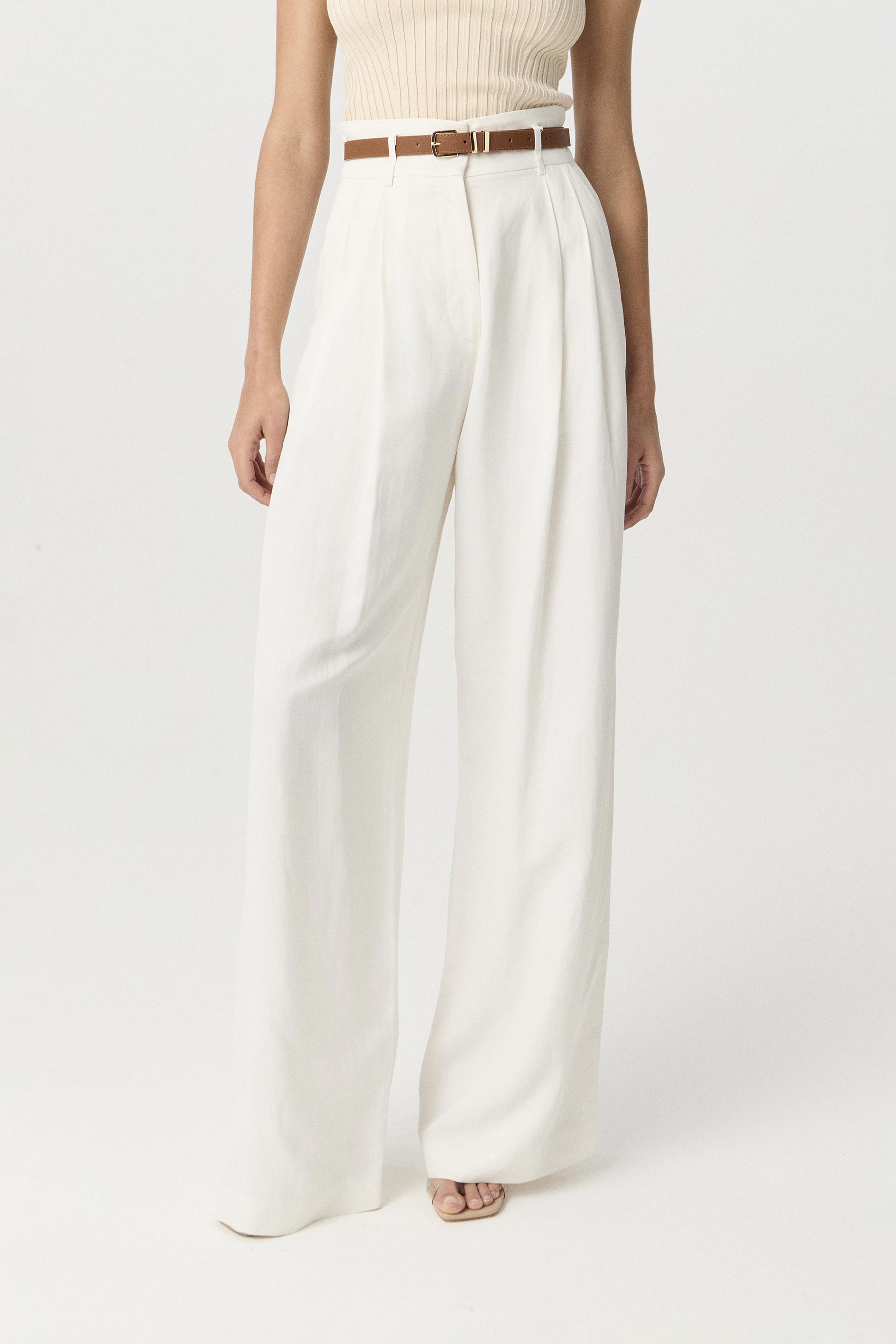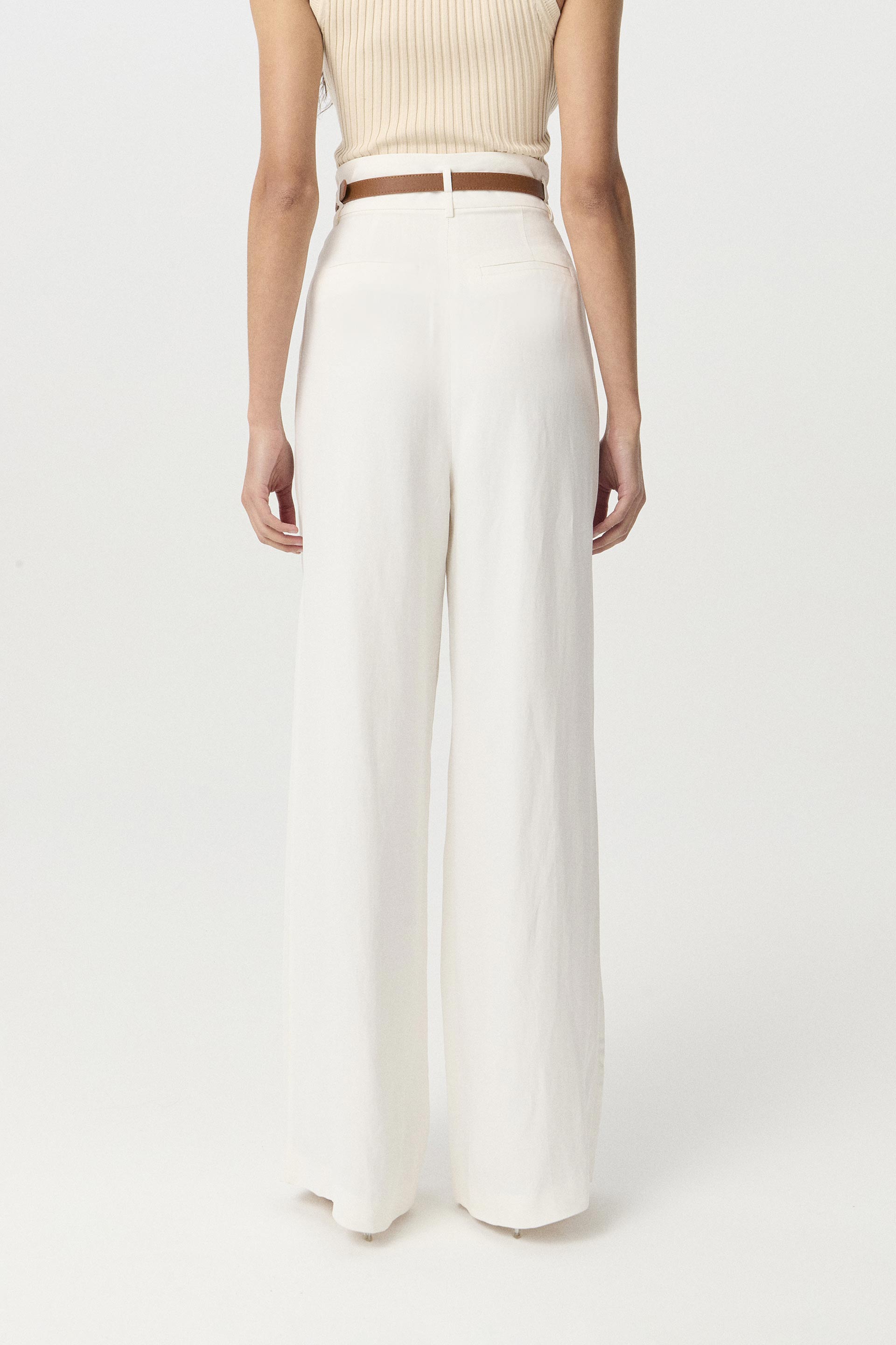 Pantalón de sastrería lino viscosa, de tiro alto y pierna ancha. Posee doble pinza en delantero, acceso central y presillas. Su silueta y su género premium hacen de esta prenda una pieza moderna que elevará todos tus looks. Combinalo con el blazer Corvus y sumale el cinturón Witt para un total look moderno y sofisticado, ideal para el verano.