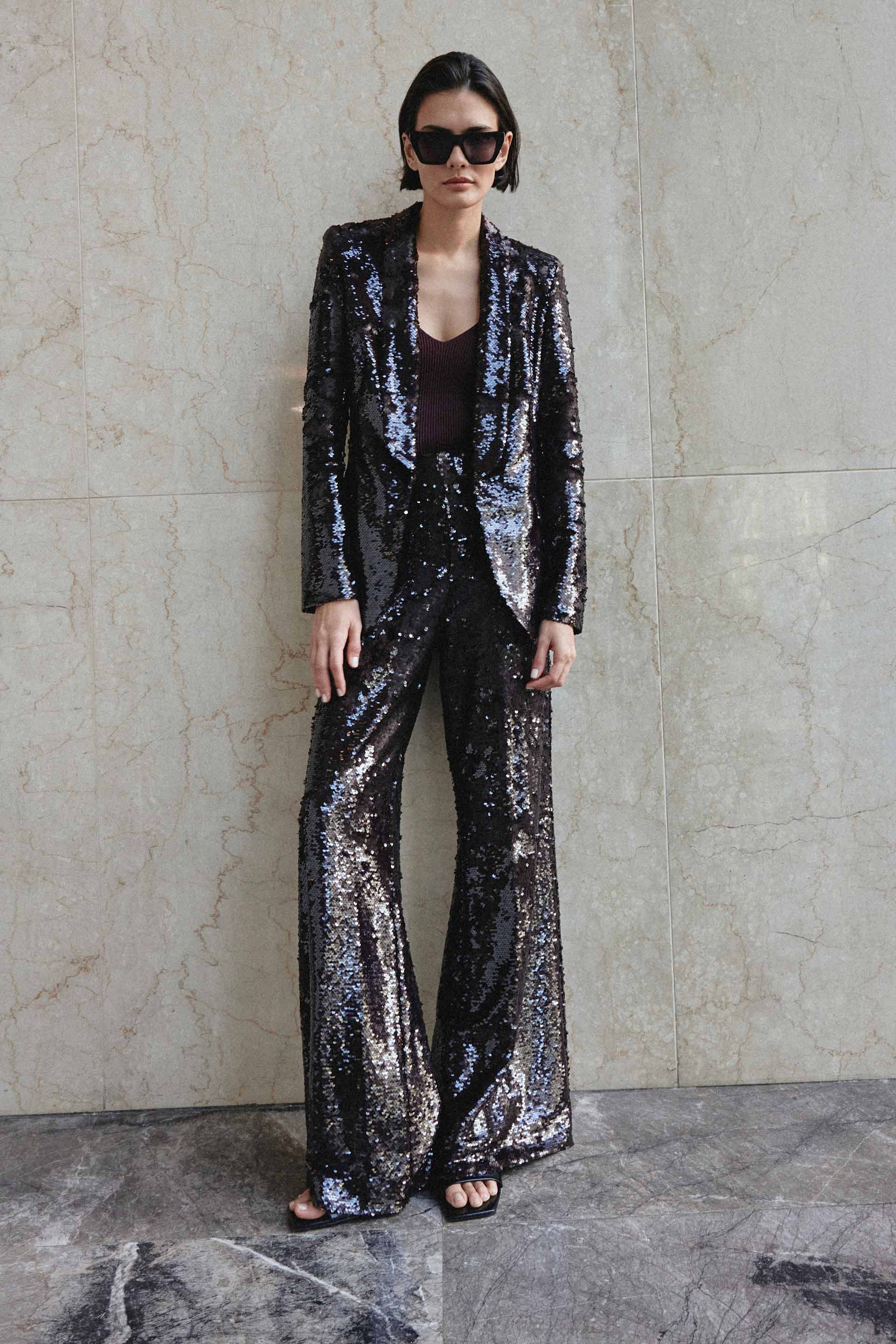 Pantalón sastrero de lentejuelas, de tiro alto y pierna ancha. Posee acceso en el lateral con cierre invisible. Combinalo con el blazer Michele y obtené un total look elegante y moderno ideal para un evento de noche.