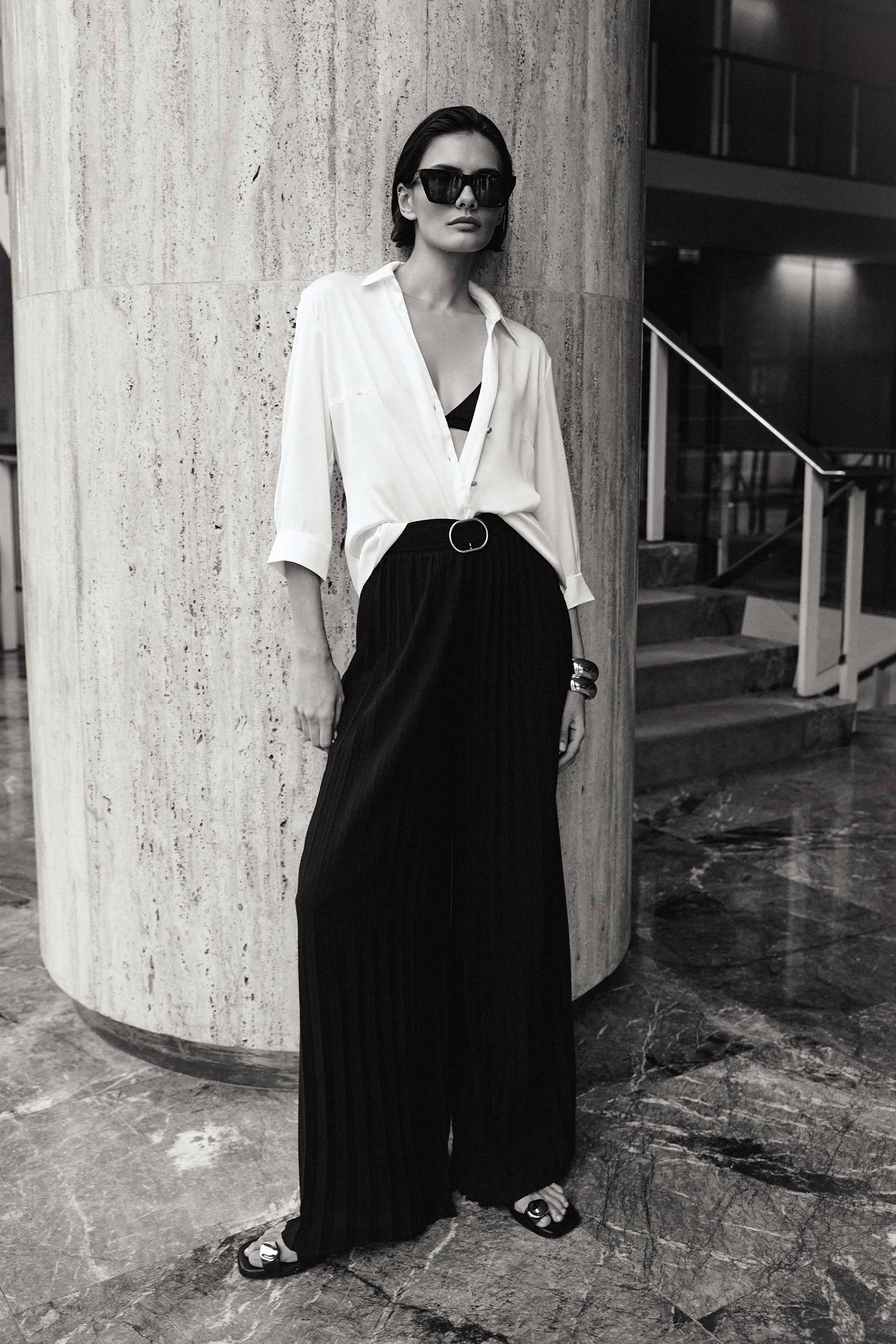 Pantalón de gasa plisado, tiro alto y pierna ancha. Posee cintura con detalle de hebilla metálica y acceso en el lateral con cierre invisible. Un ítem versátil ideal para componer distintos looks para eventos.