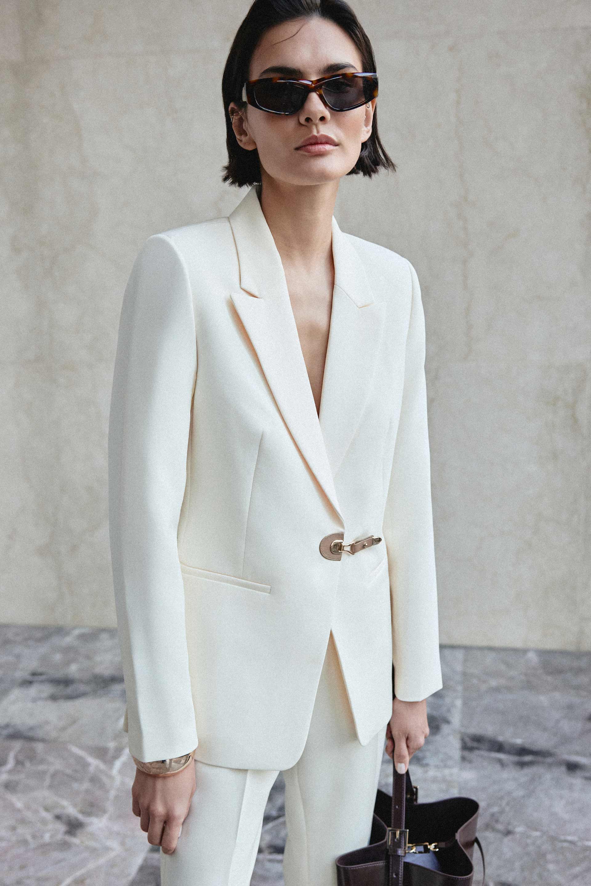Blazer largo de sastrería elastizada, de silueta entallada y manga larga. Posee solapa y acceso con alamar metálico. Su interior está forrado en acetato diagonal para otorgarle mayor estructura. Combinalo con el pantalón Taurus y armá un total look ideal para la oficina.