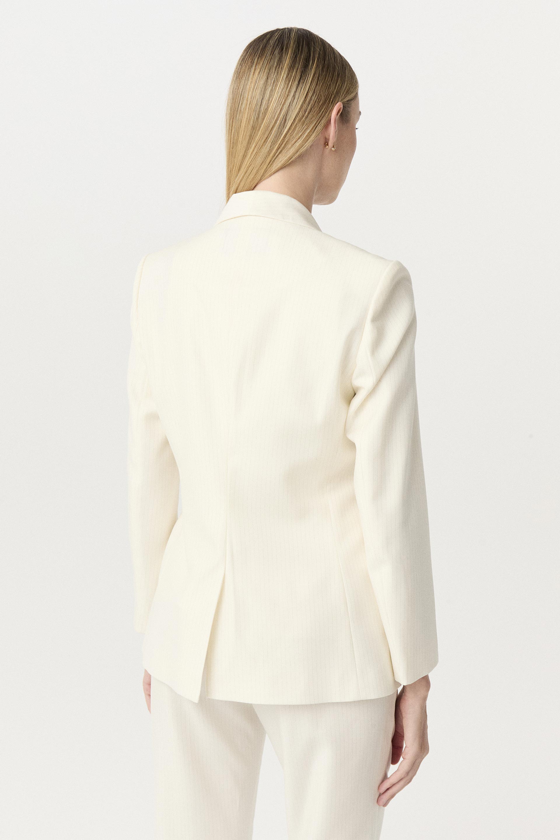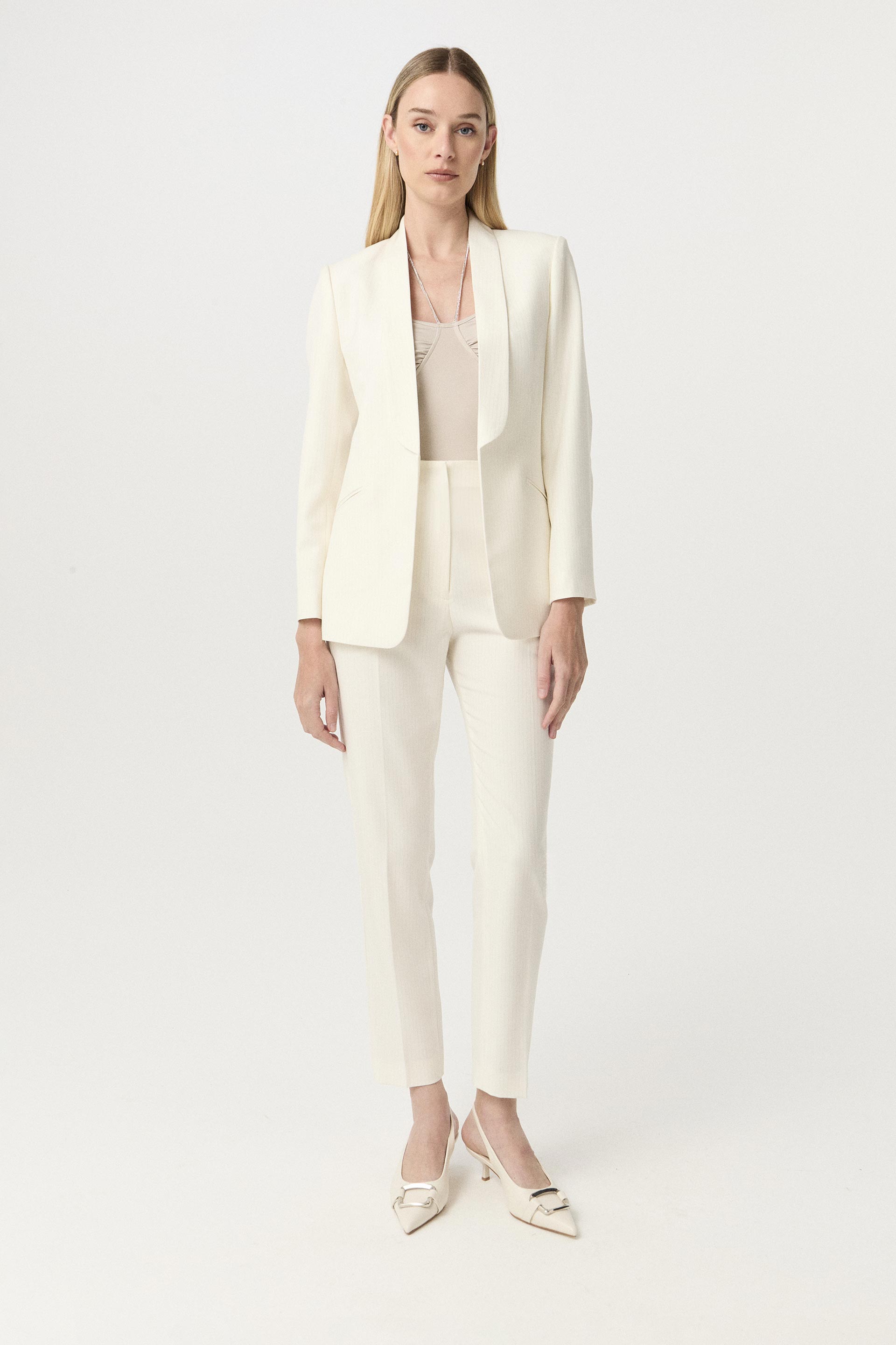 Blazer largo de sastrería viscosa tizada con lúrex, silueta entallada y manga larga. Su interior está forrado con satén elastizado generando extra confort. Su solapa tipo smoking, su género tizado y su calce hacen de esta prenda un ítem clásico y sofisticado. Combinalo con el pantalón y chaleco Feni y armá un total look.