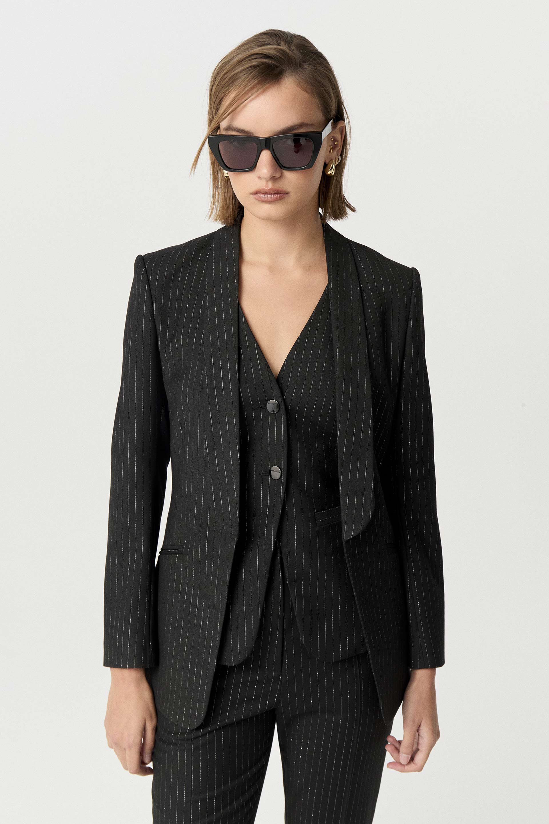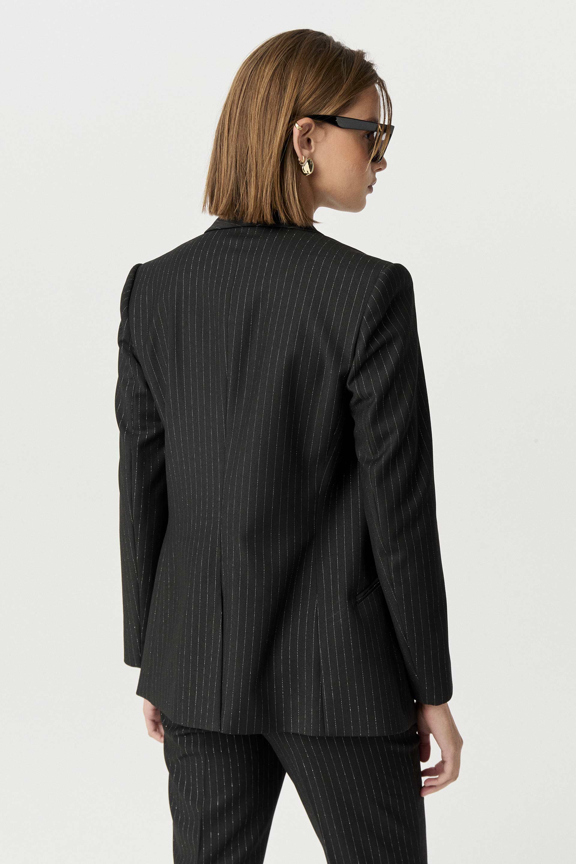 Blazer largo de sastrería viscosa tizada con lúrex, silueta entallada y manga larga. Su interior está forrado con satén elastizado generando extra confort. Su solapa tipo smoking, su género tizado y su calce hacen de esta prenda un ítem clásico y sofisticado. Combinalo con el pantalón y chaleco Feni y armá un total look.