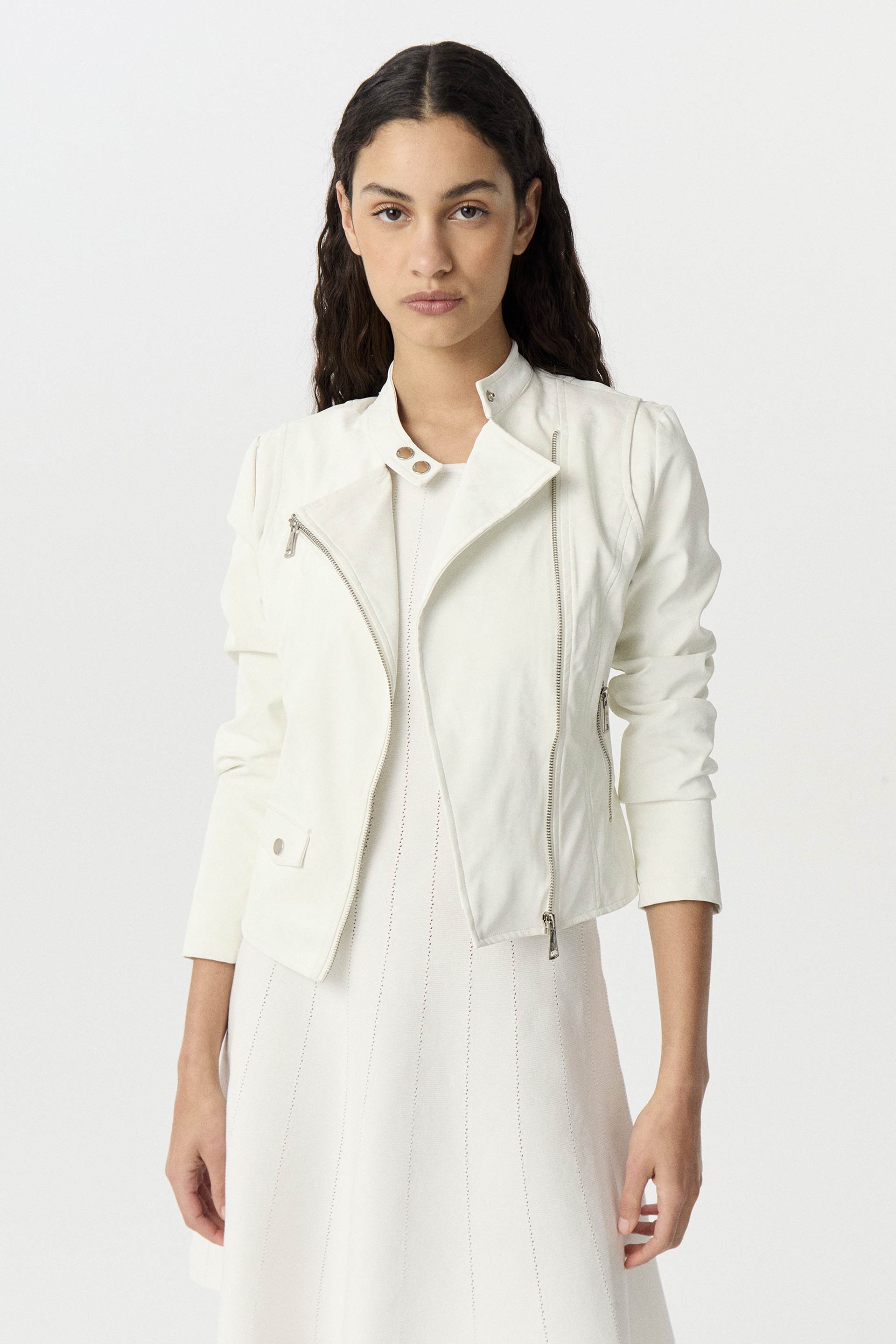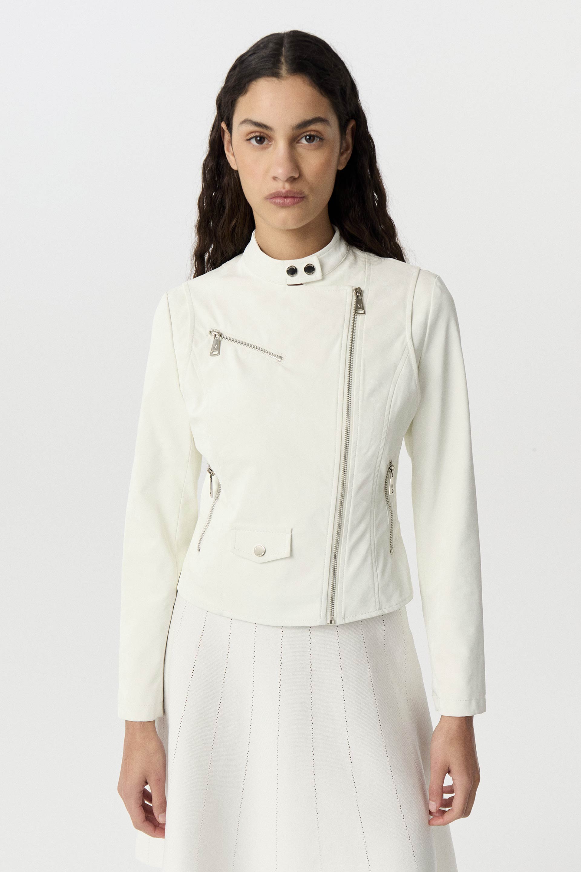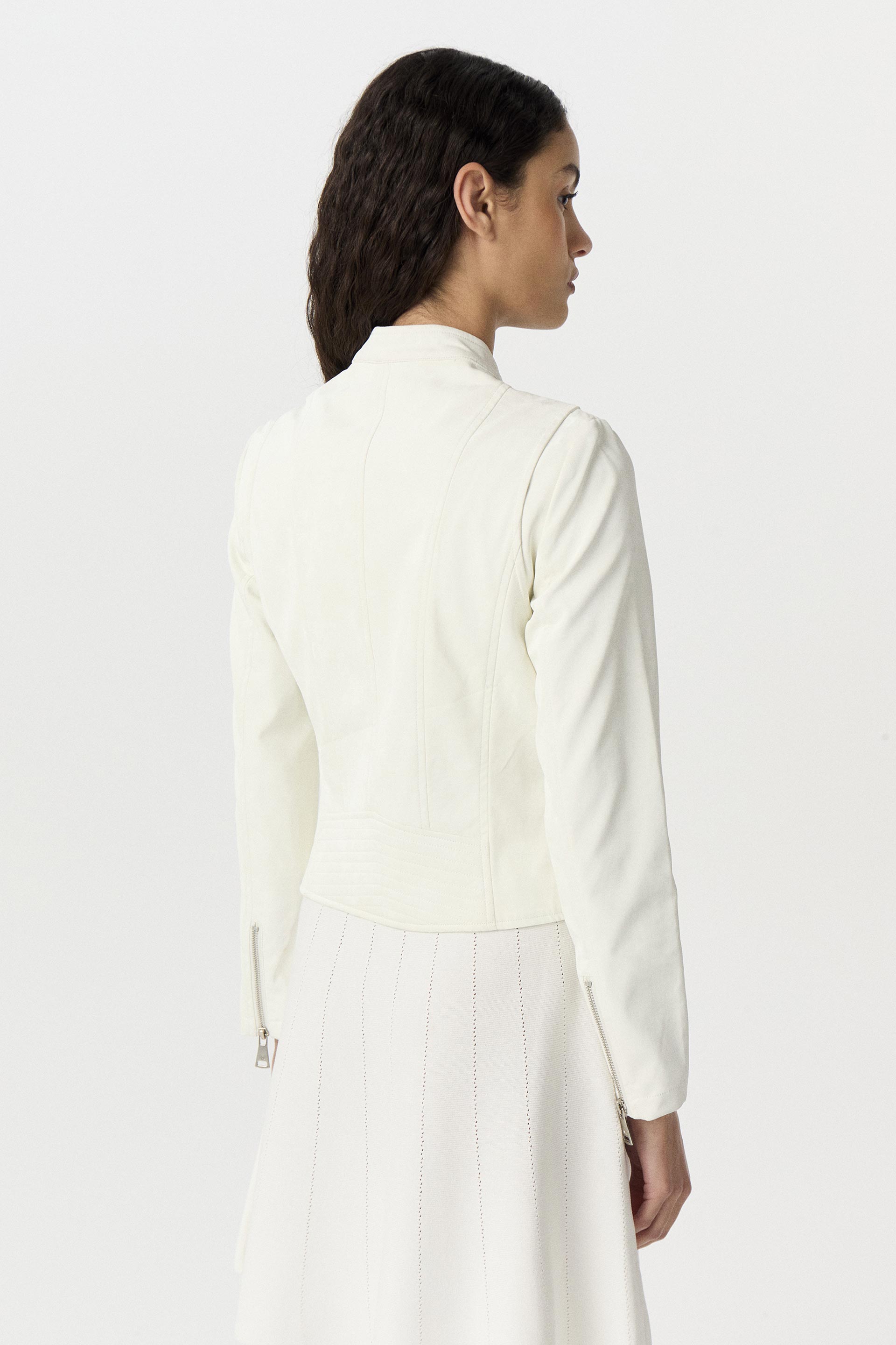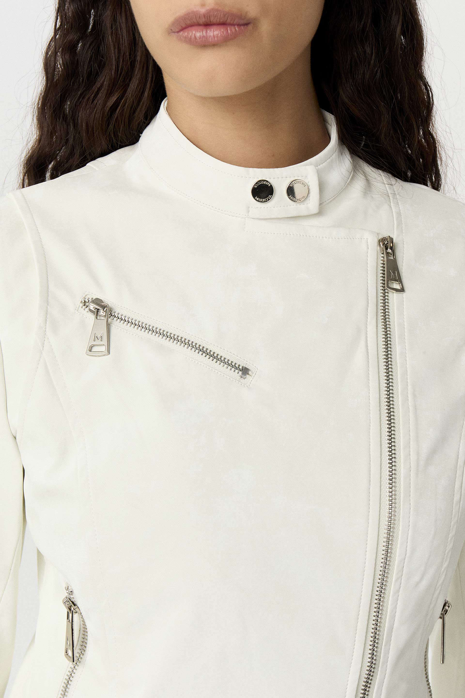 Chaqueta biker efecto gamuza, de silueta entallada y manga larga. Posee acceso con cierre metálico y doble broche personalizado MKV. Su interior está forrado con tafeta diagonal. Combinala con jeans para un look más urbano o con vestidos y prendas de vestir para un estilo más formal.
