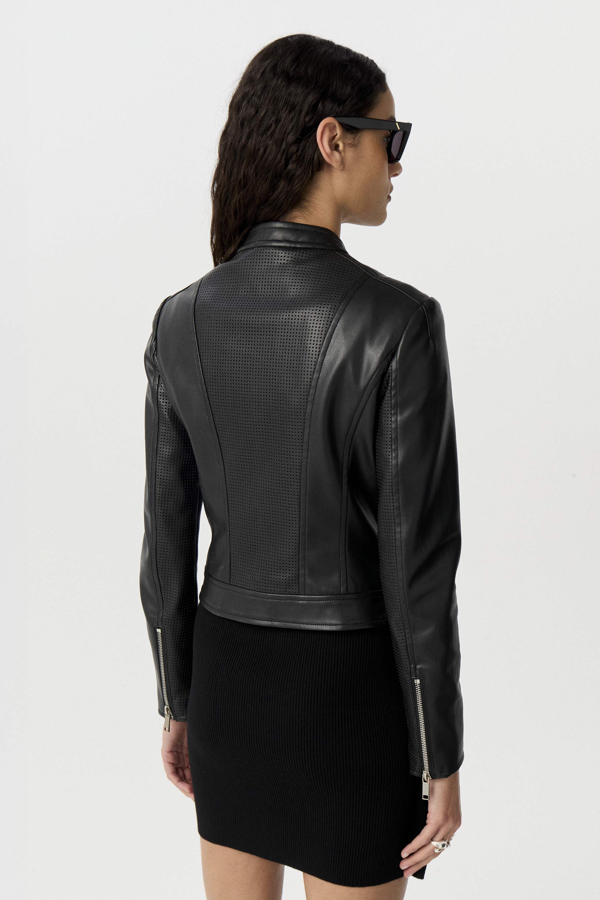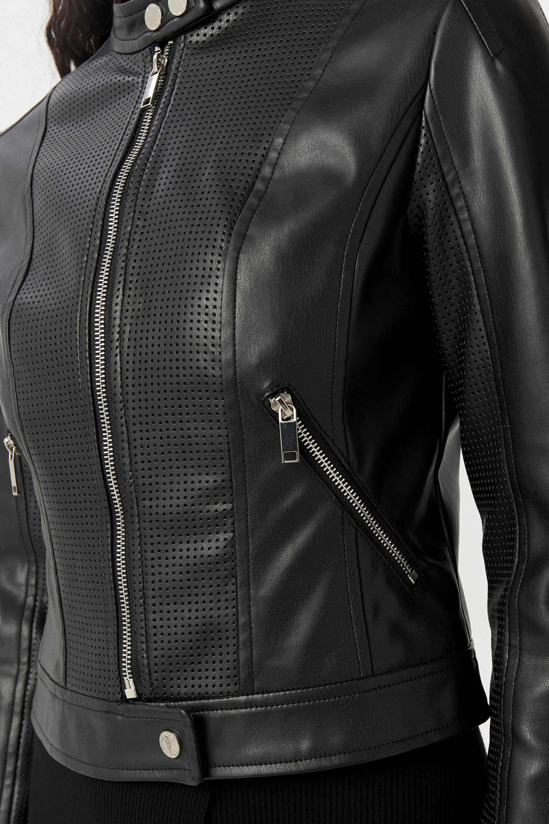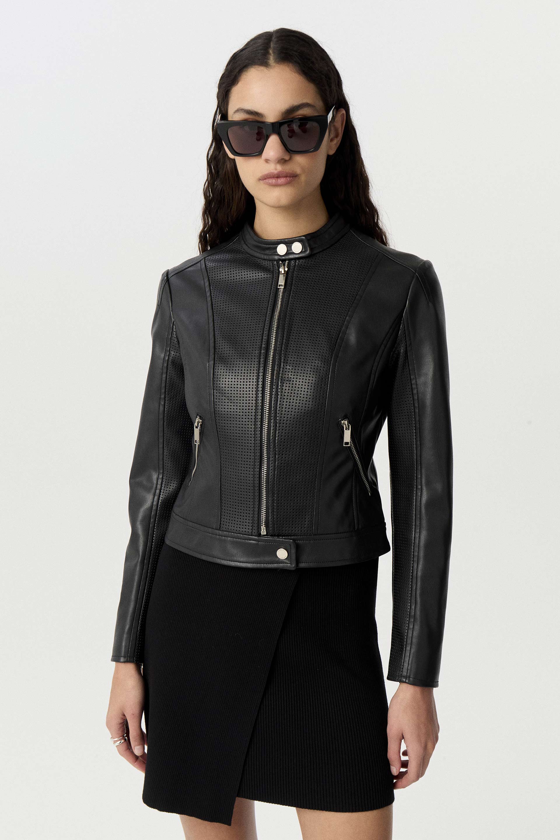 Chaqueta efecto cuero premium, de silueta entallada y manga larga. Posee acceso con cierre, broche metálico en cuello personalizado MKV y cierres en bolsillos. Una chaqueta clásica y moderna que no puede faltarte en tu guardarropas, ideal tanto para el día como para la noche.