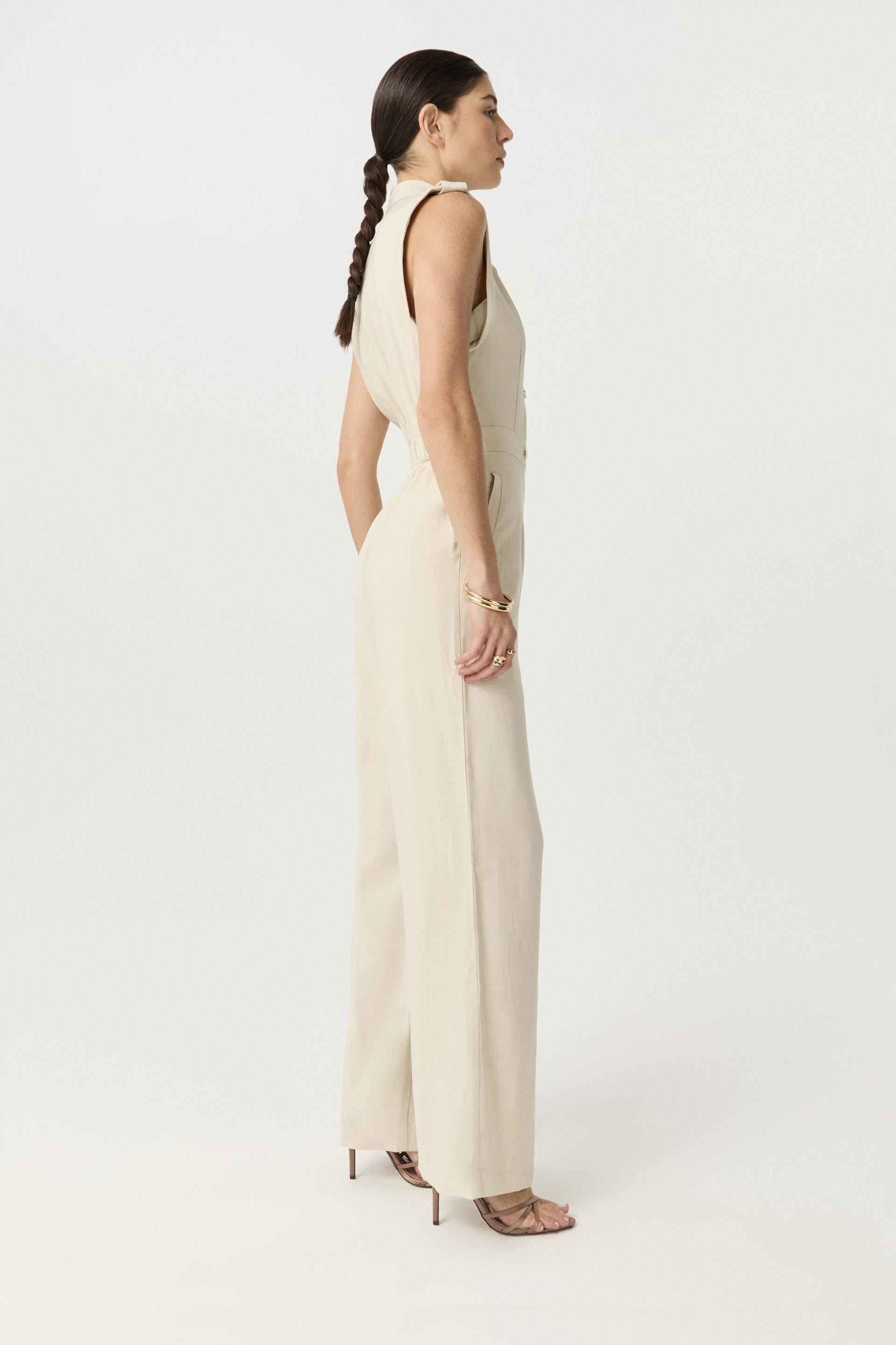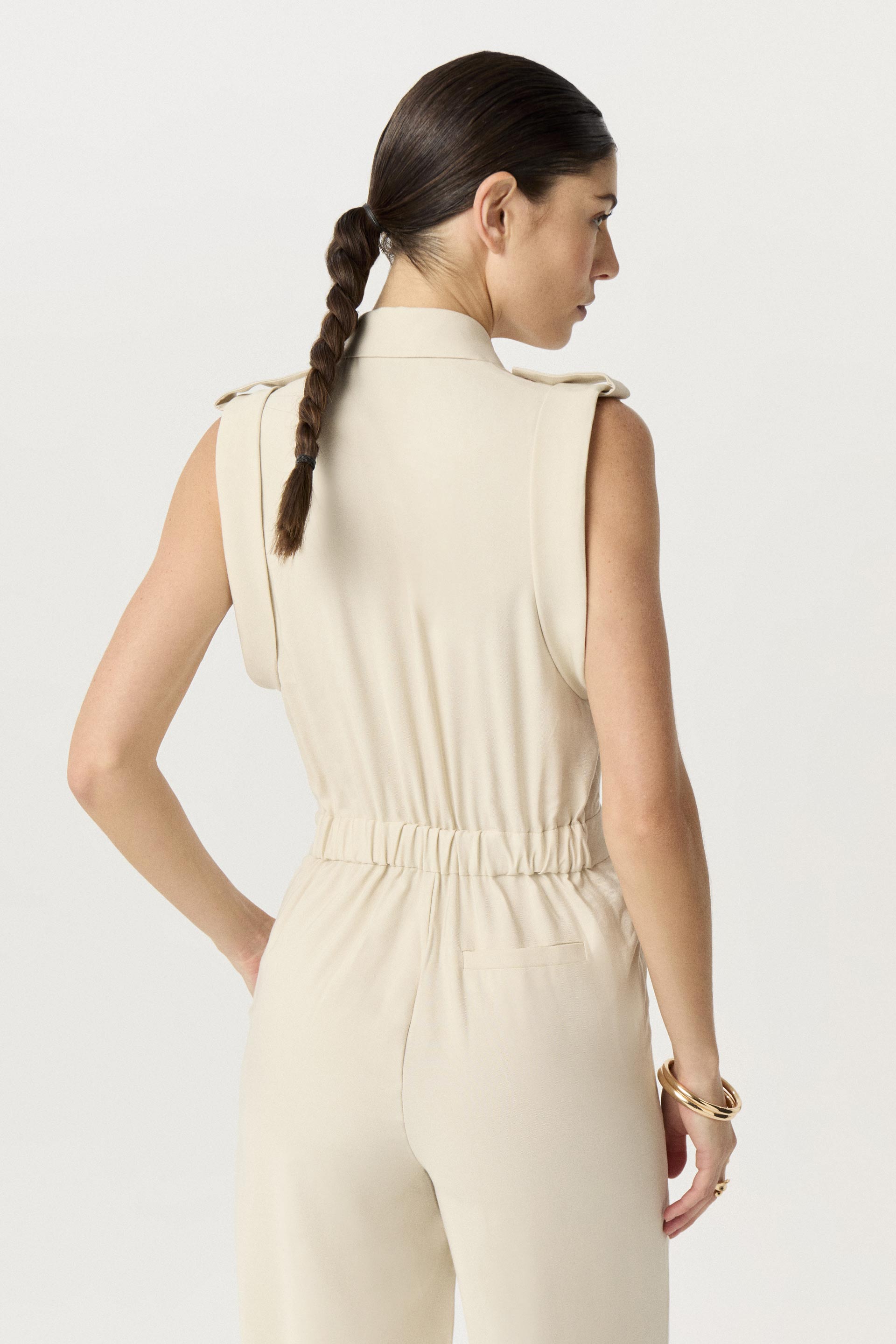 Mono de twill wash, de silueta relajada y pierna ancha. Posee cuello con solapa, acceso y charreteras con broches metálicos y elástico en la cintura trasera. Su género y diseño lo convierten en un ítem de tendencia, ideal para componer un look moderno tanto para la oficina como para una salida.