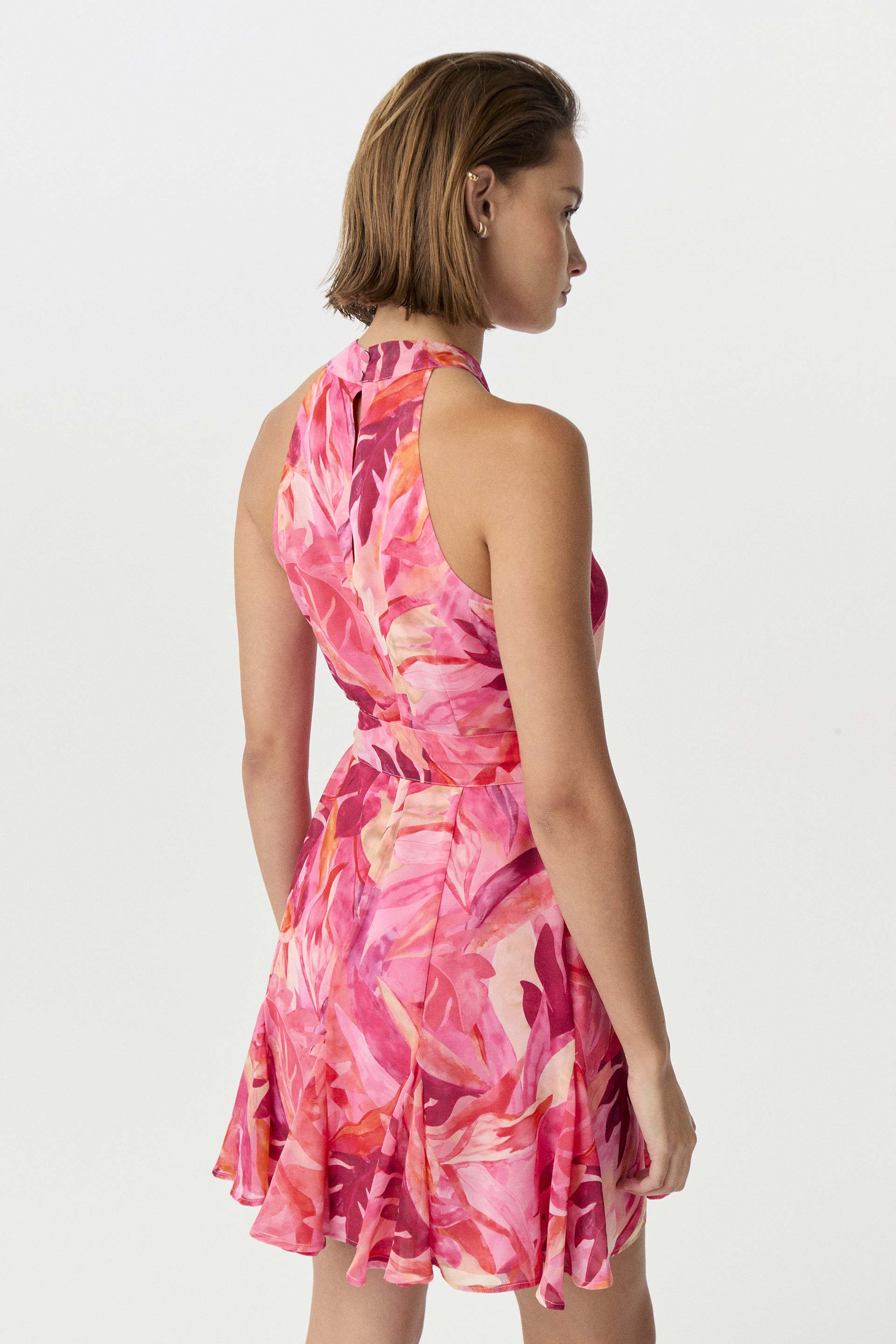 Vestido corto de gasa estampada con diseño exclusivo MKV. De silueta entallada y escote halter con gota, posee volados en ruedo de falda y cierre invisible en espalda. Interior forrado en punto. Fresco y liviano, perfecto tanto para el día como para las noches de verano.