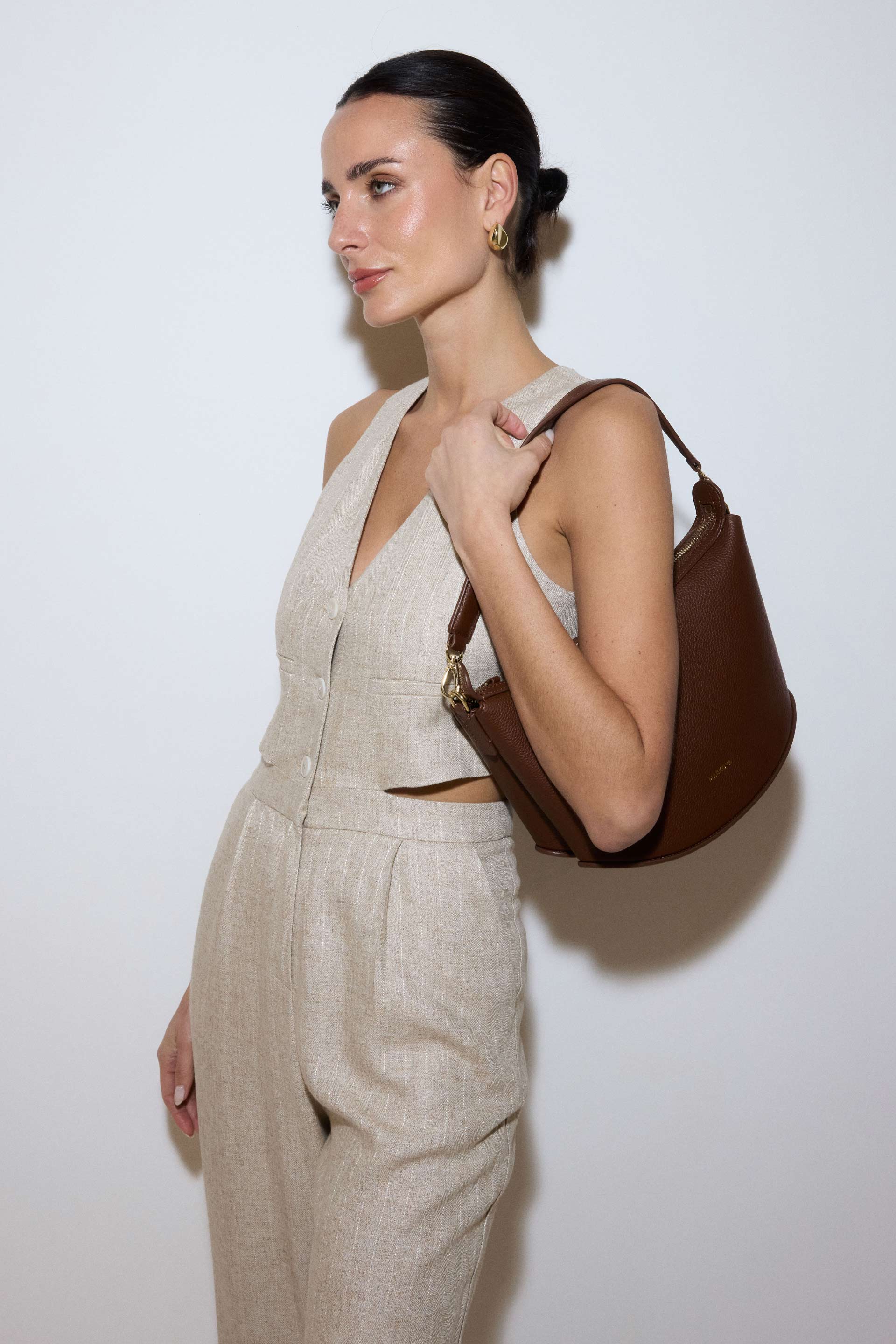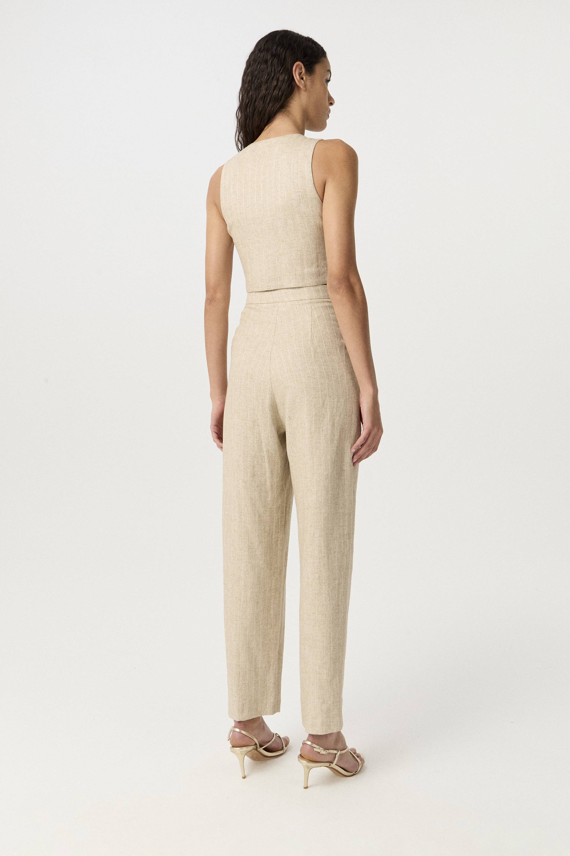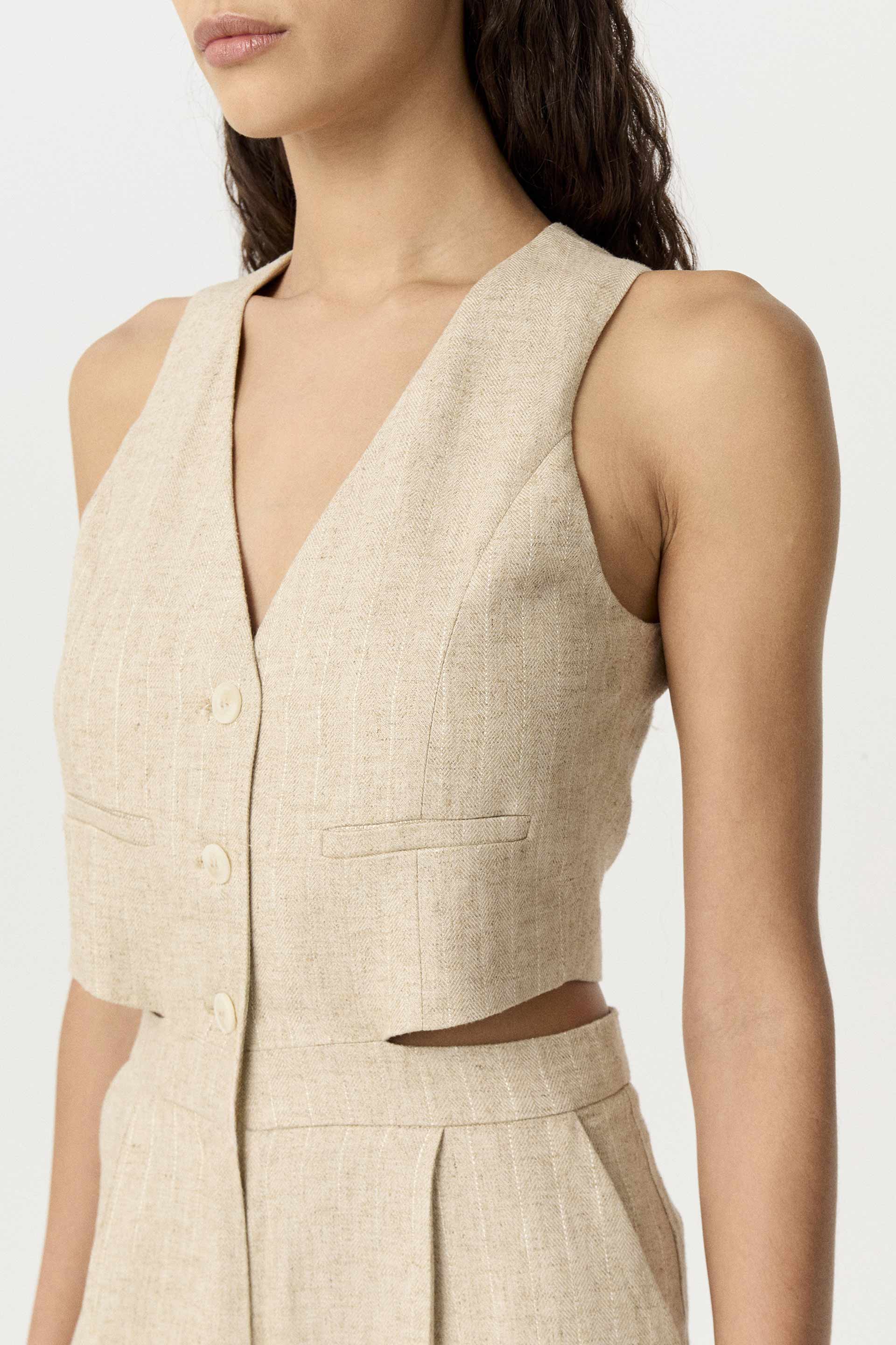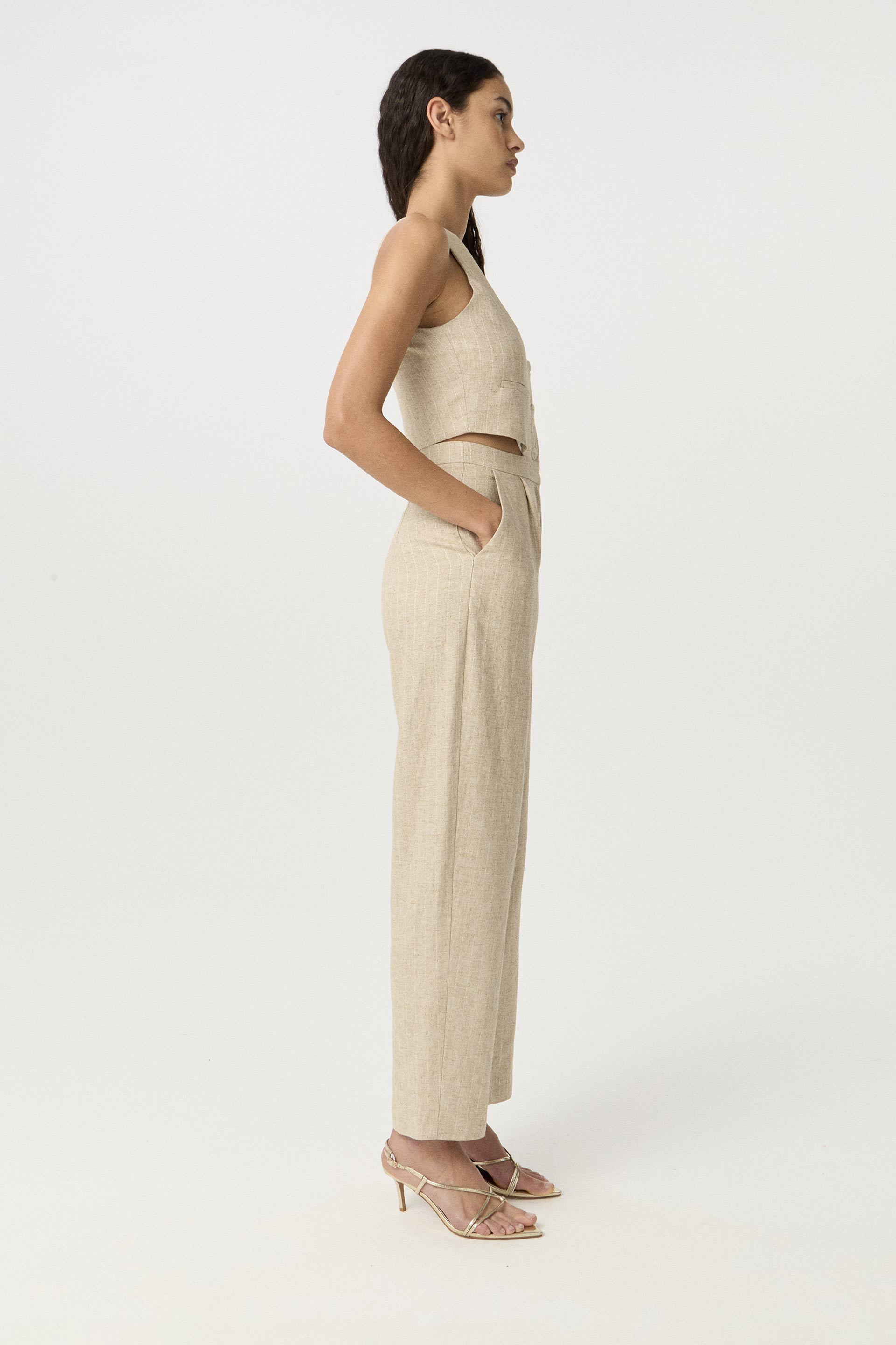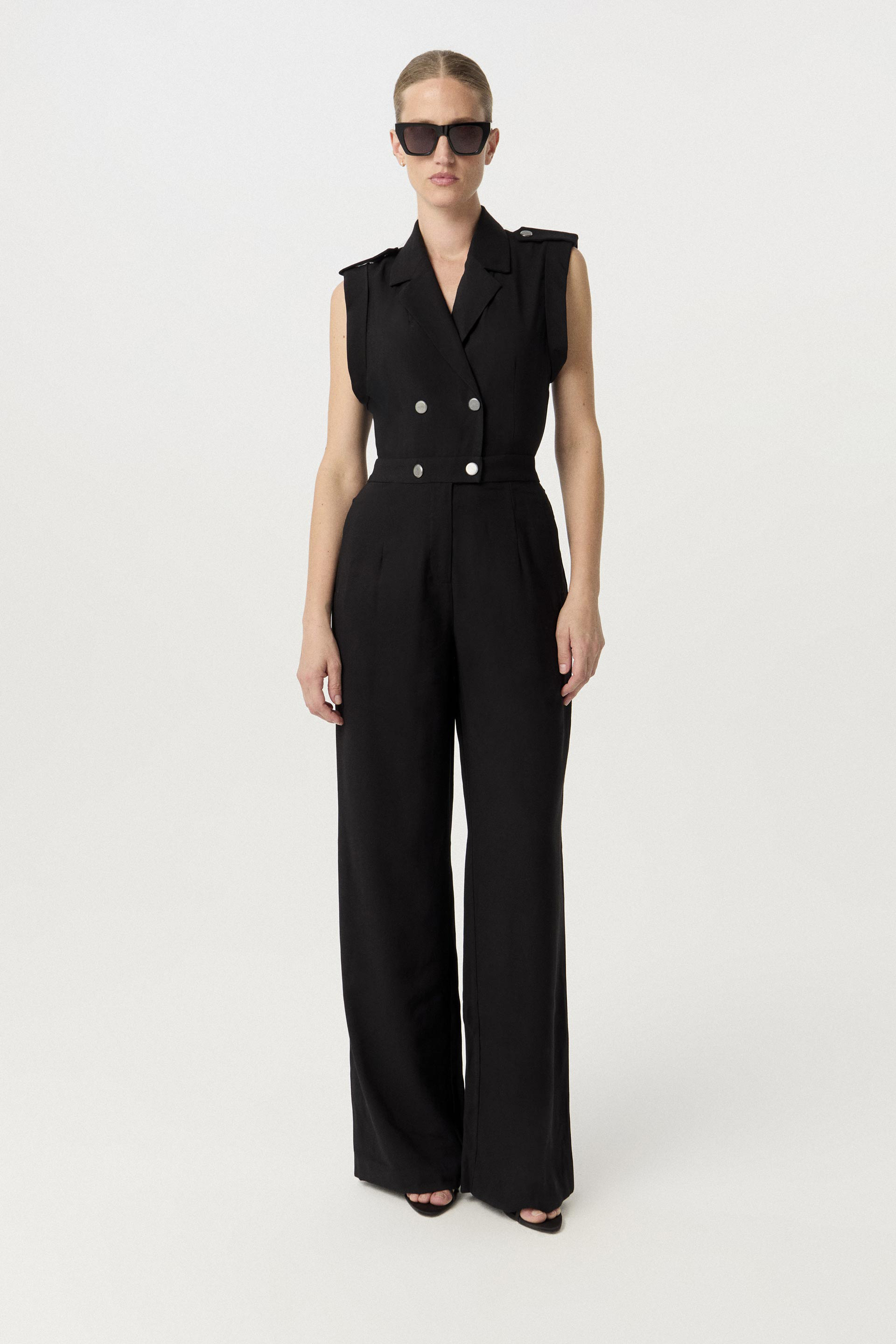 Mono de sastrería lino viscosa tizada. De silueta entallada y pierna slim. Posee acceso superior central con botones a tono y acceso inferior con cierre. Su chaleco, su pantalón pinzado y su género lo convierten en un ítem fresco y moderno.