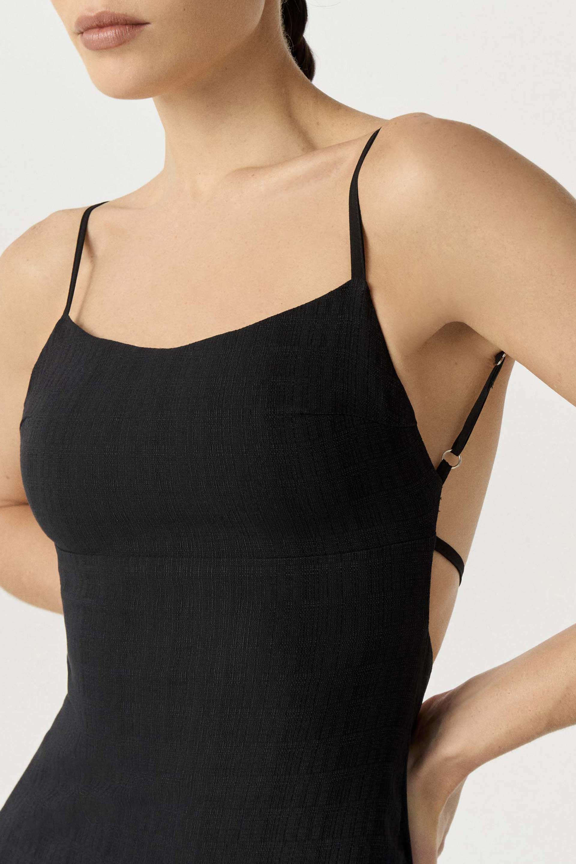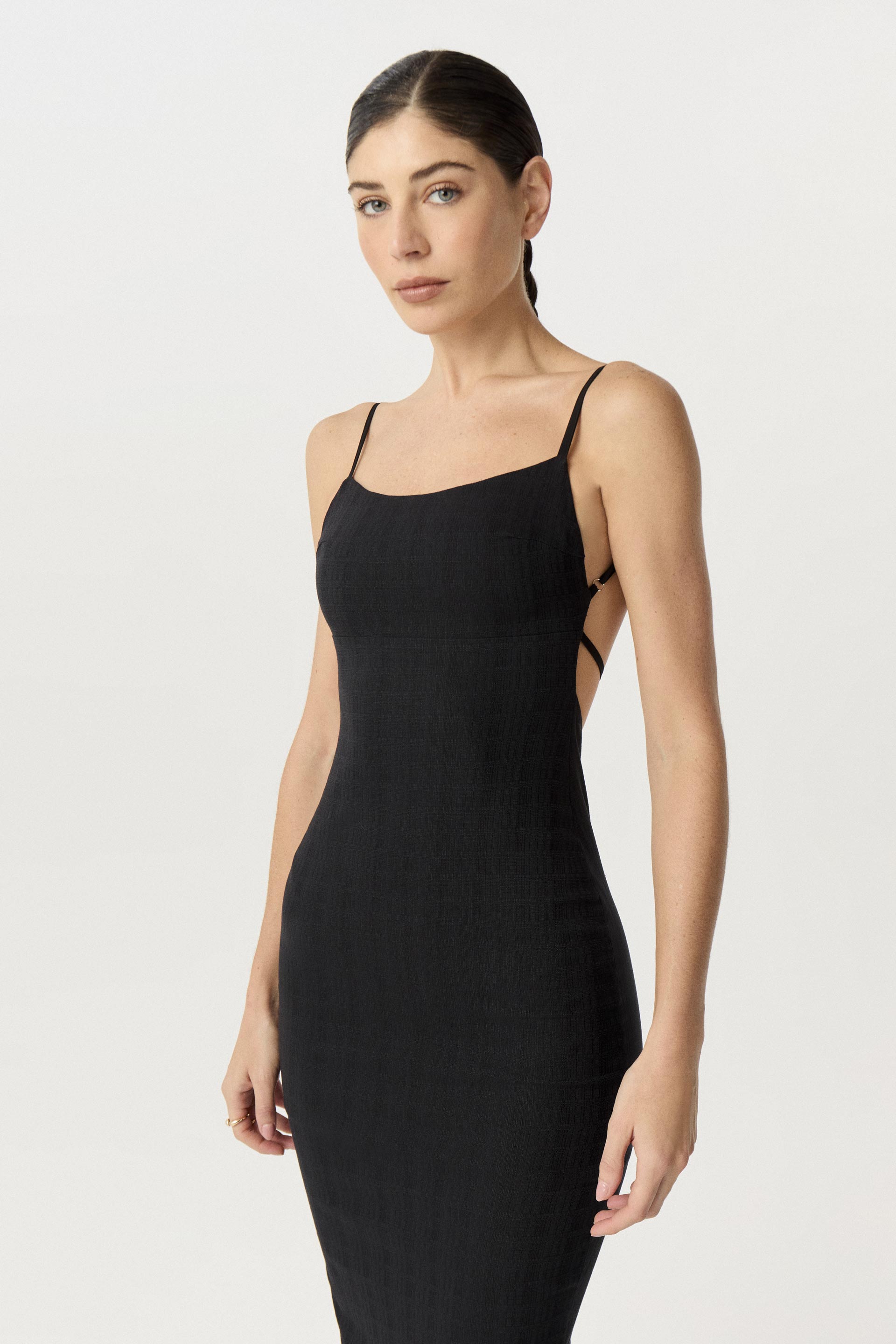 Vestido midi de bengalina efecto lino, de silueta tubo con breteles finos. Su interior está forrado en punto para mayor confort. Posee acceso con cierre invisible. Su escote y su espalda como protagonista lo convierten en un vestido sensual que te hará destacar, ideal para un evento especial.