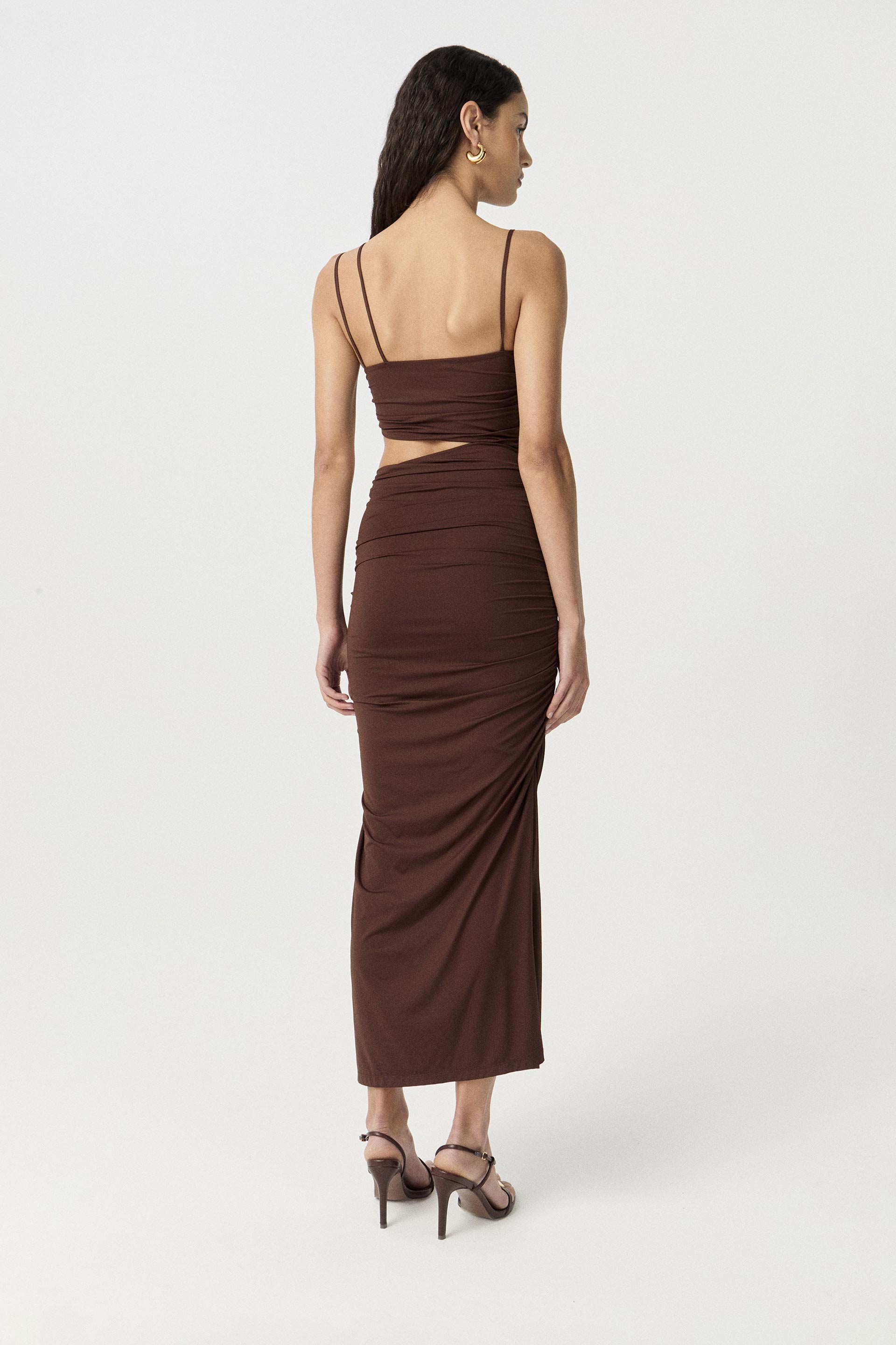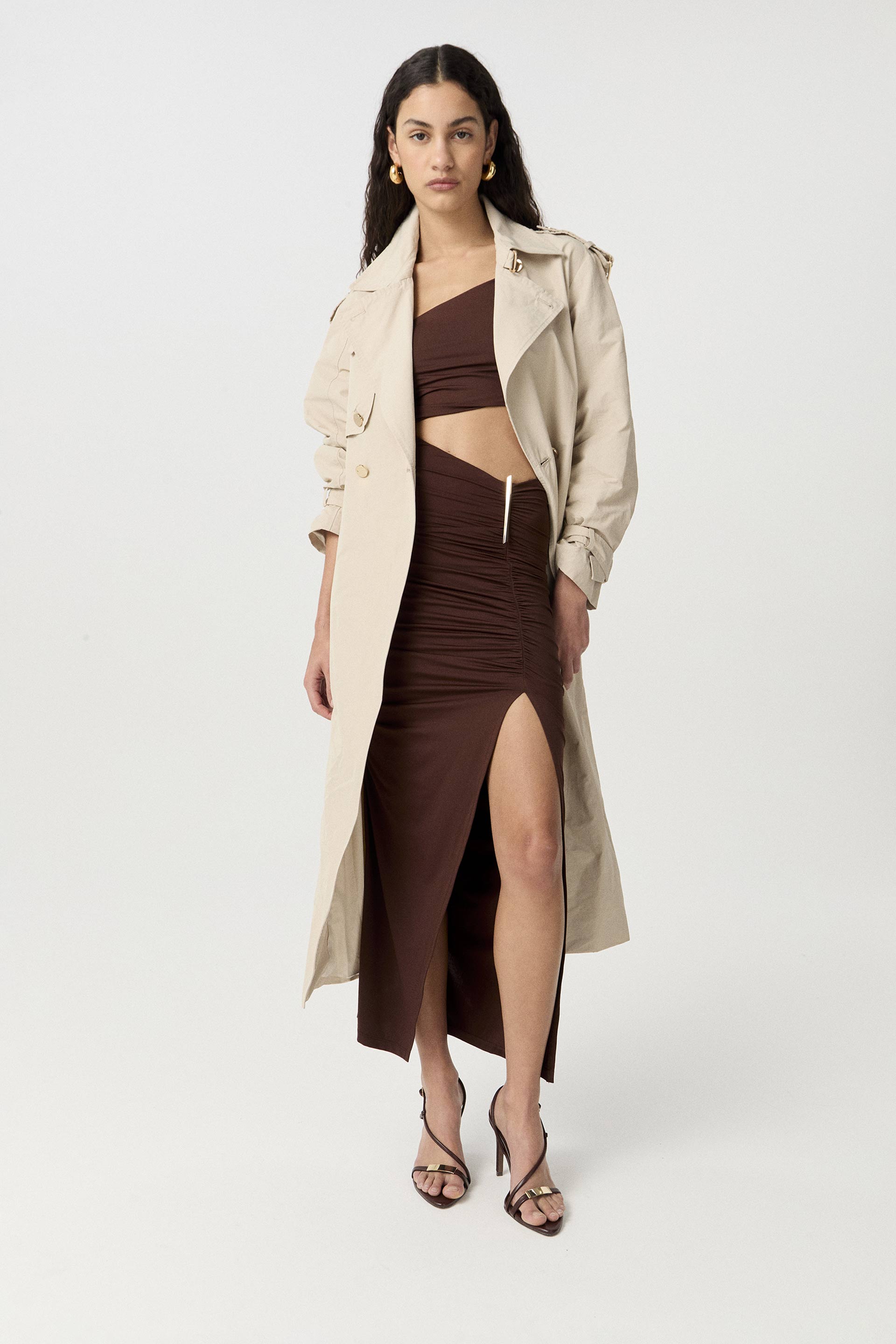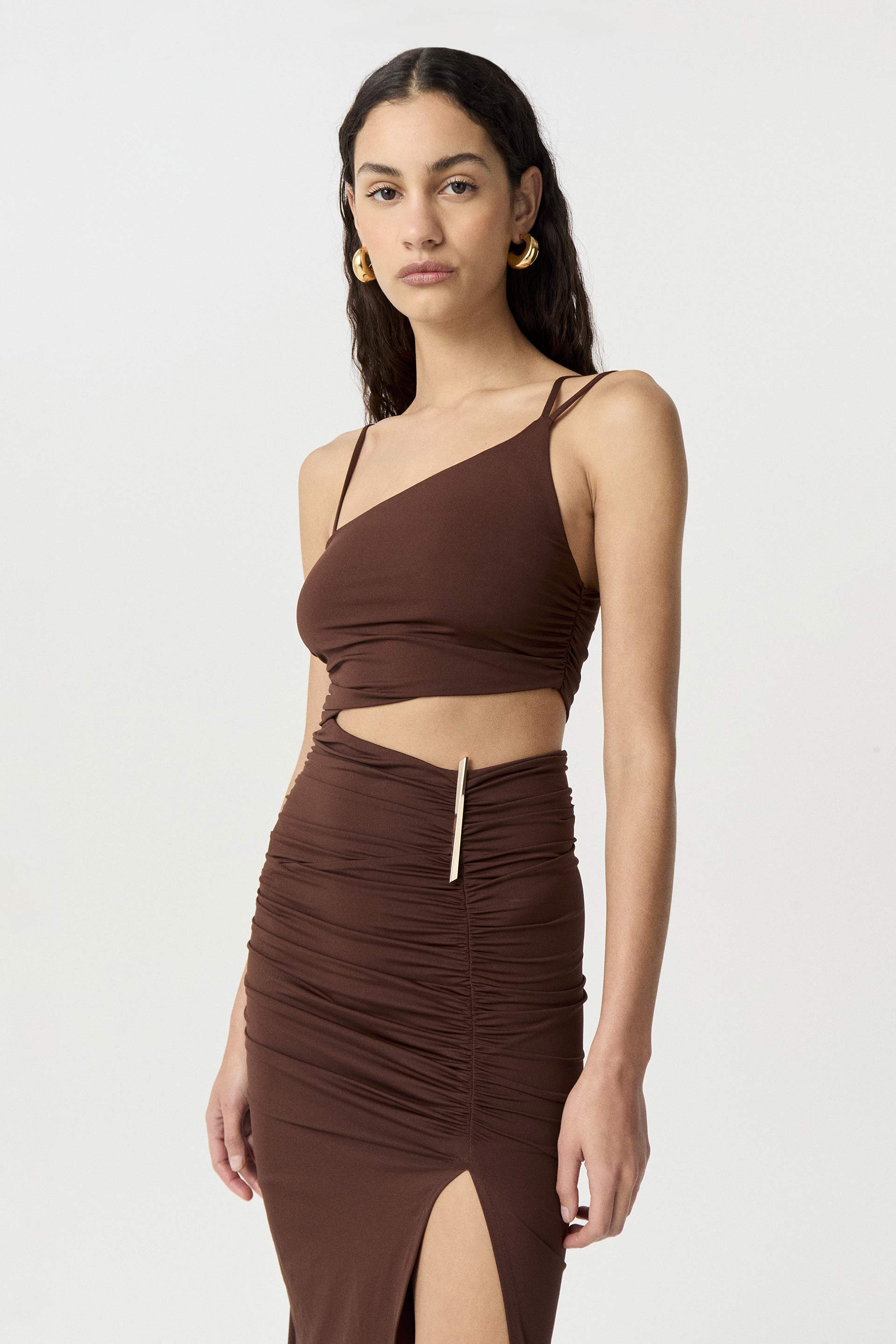 Vestido de jersey microfibra premium, de silueta tubo con breteles finos. Posee escote asimétrico, amplio tajo delantero y recorte en lateral con frunce y aplique de lingote metálico con diseño exclusivo MKV. Una prenda sofisticada y con actitud, perfecta para la destacar tu figura en una fiesta o evento, en un color de tendencia.