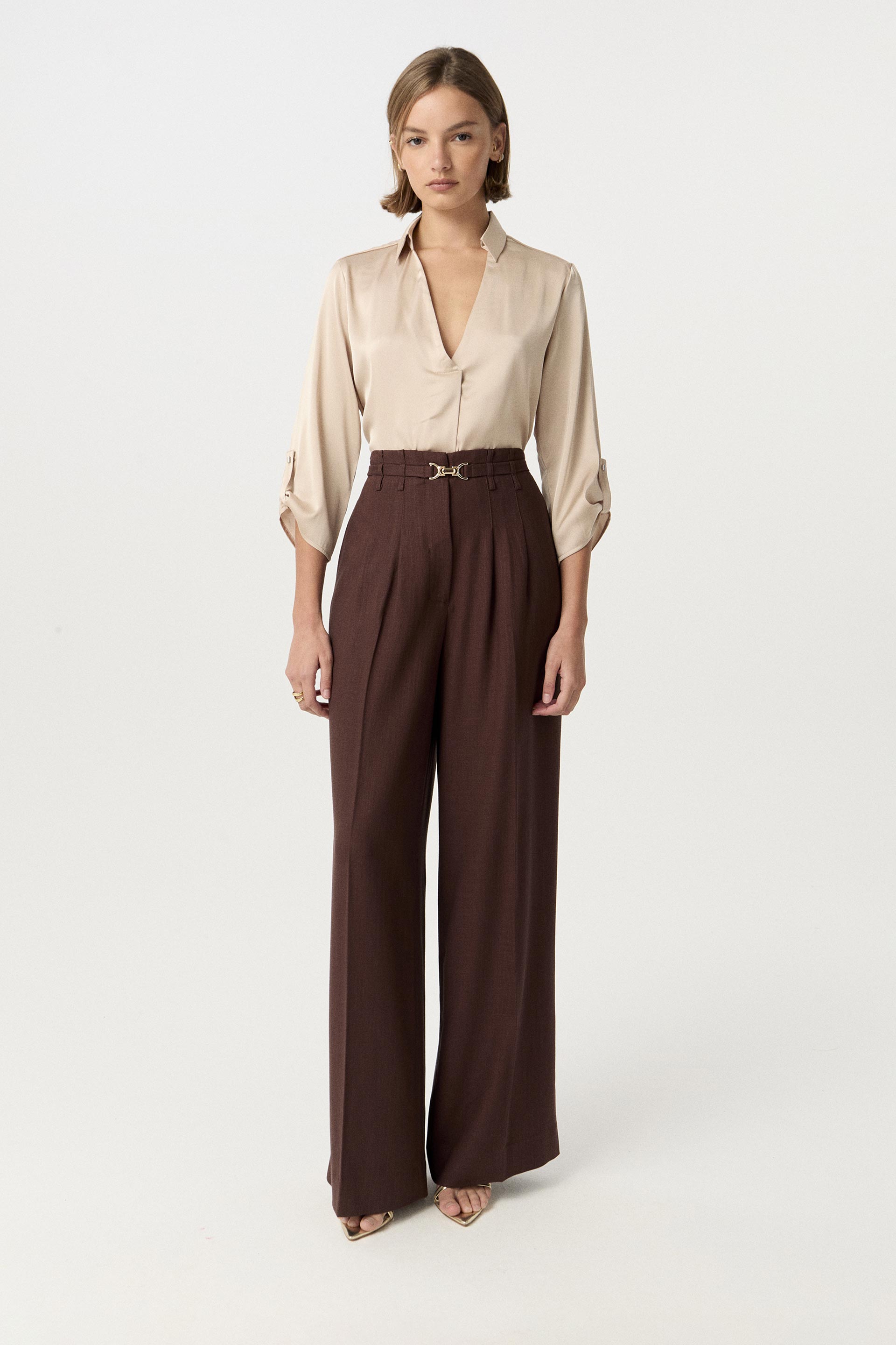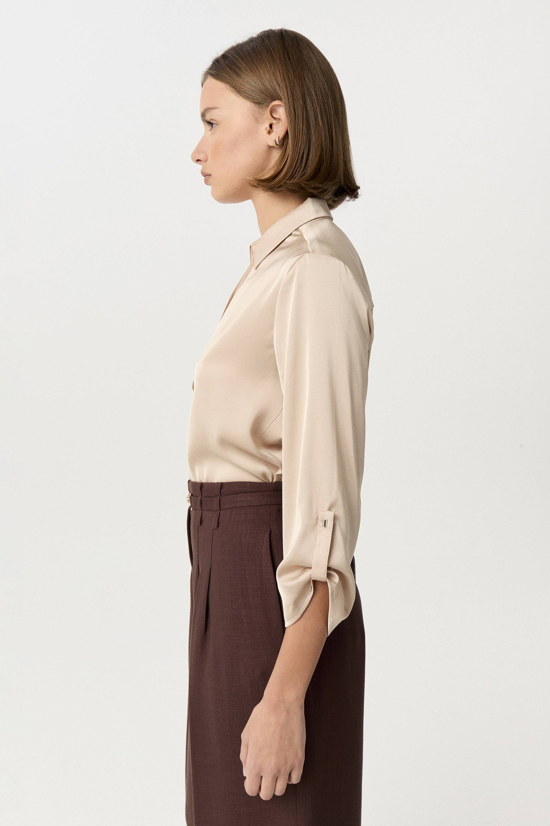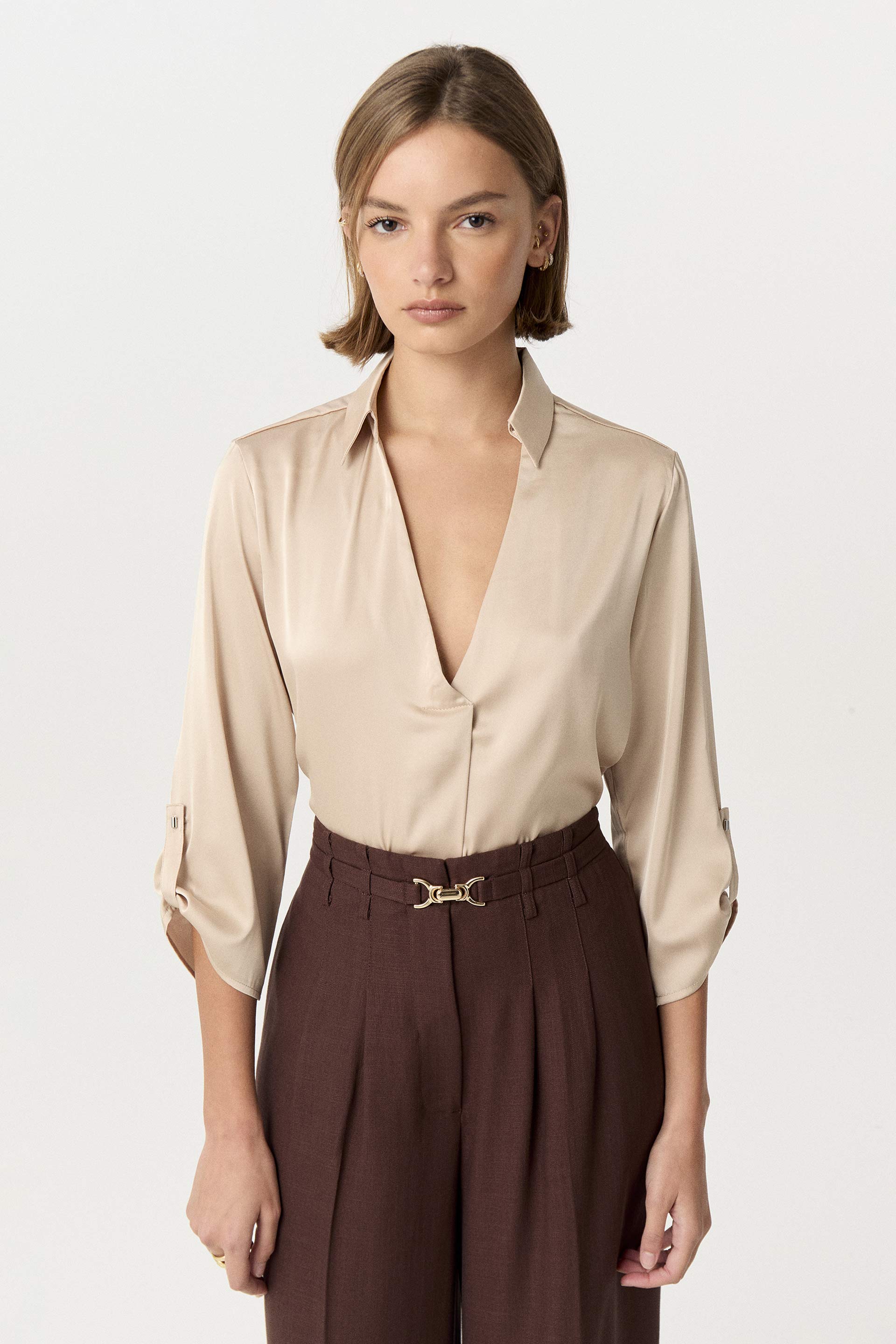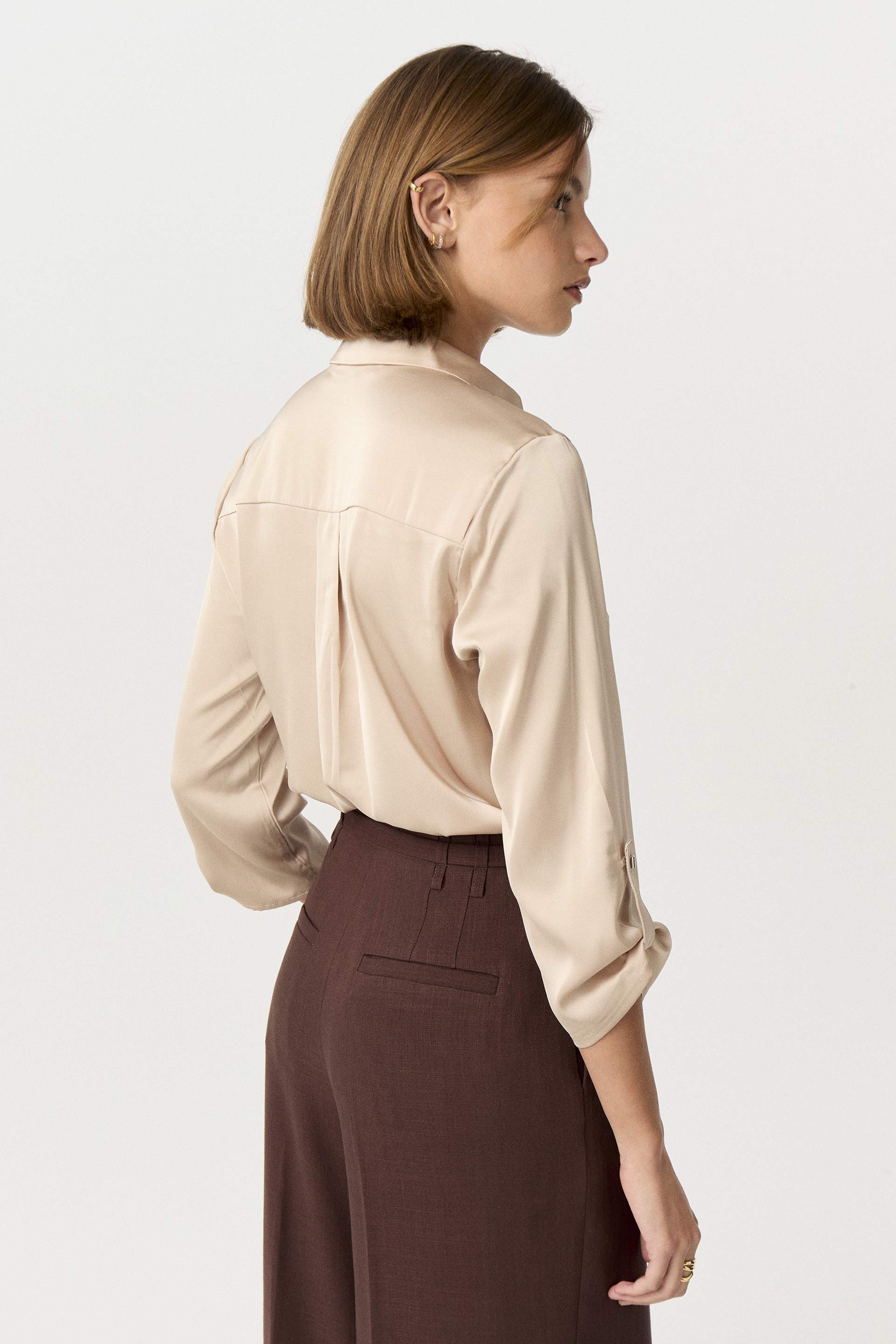 Blusa de sedita de calce relajado. Con cuello camisero y escote en V. Posee mangas 3/4 con presillas para arremangar. Delicada y funcional, ideal tanto para la oficina como para un evento.