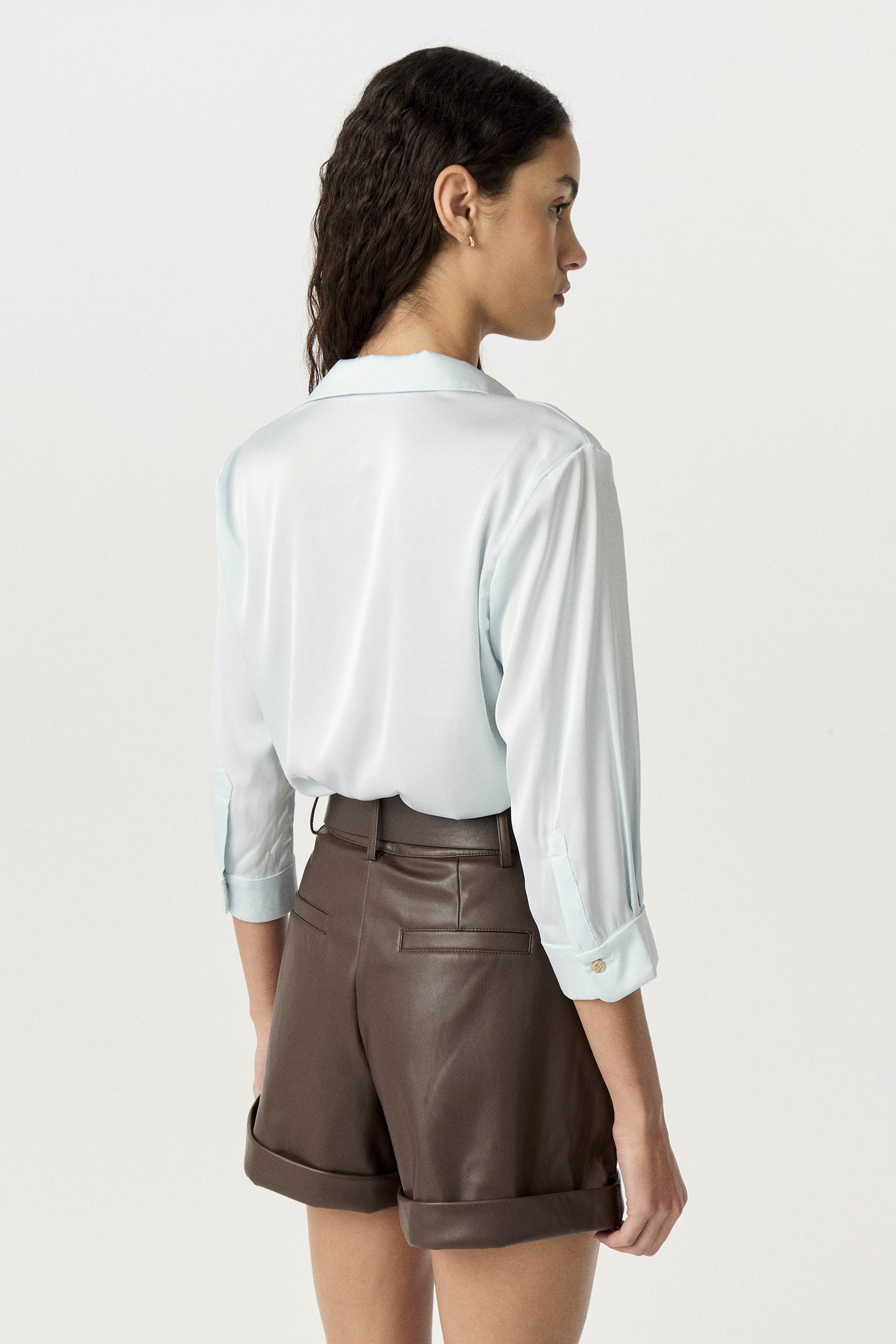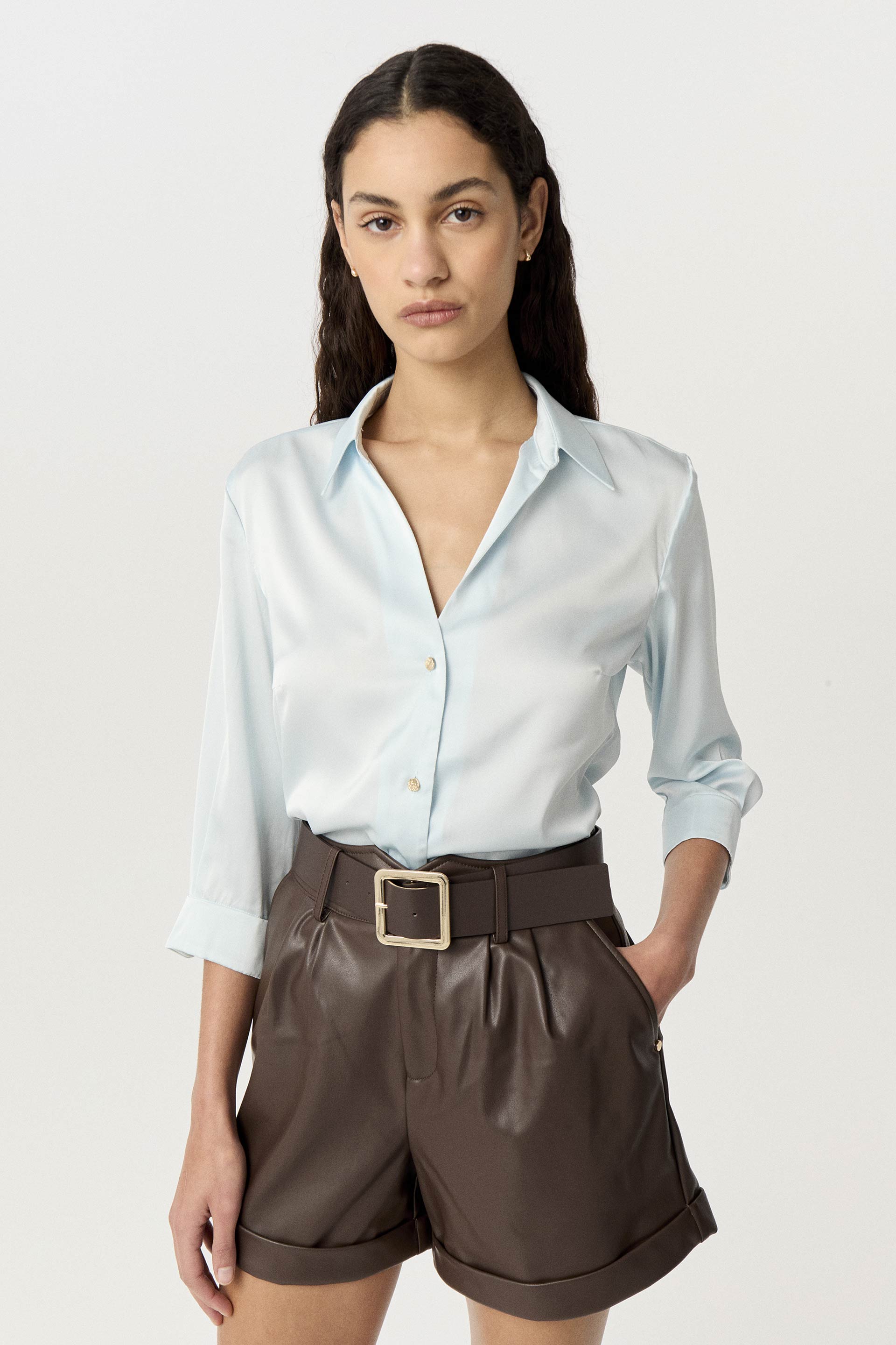 Camisa de sedita satinada con calce al cuerpo. Cuello clásico con abertura en V y triple botón metálico en el escote. De mangas 3/4 hasta debajo del codo y pinzas en busto que realzan la silueta. Un comodín versátil que aporta un toque relajado y elegante a cualquier look.