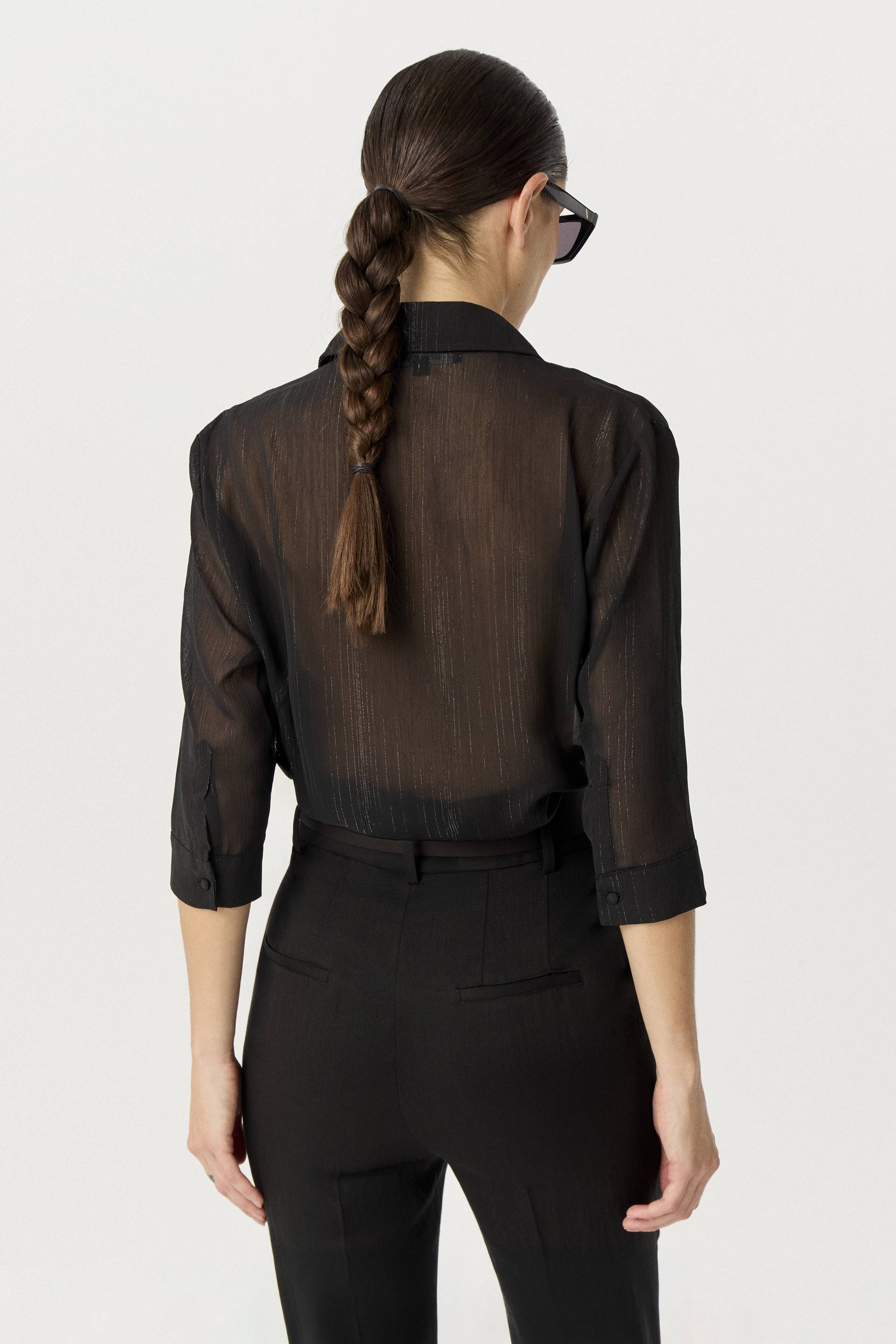 Camisa de gasa con delicado tizado en lúrex, de calce al cuerpo. Cuello clásico con escote en V y botones de pie forrados. Mangas 3/4 por debajo del codo y pinzas de busto que realzan la silueta. Un comodín elegante y con un brillo sutil, ideal para elevar cualquier look con un toque relajado y chic.