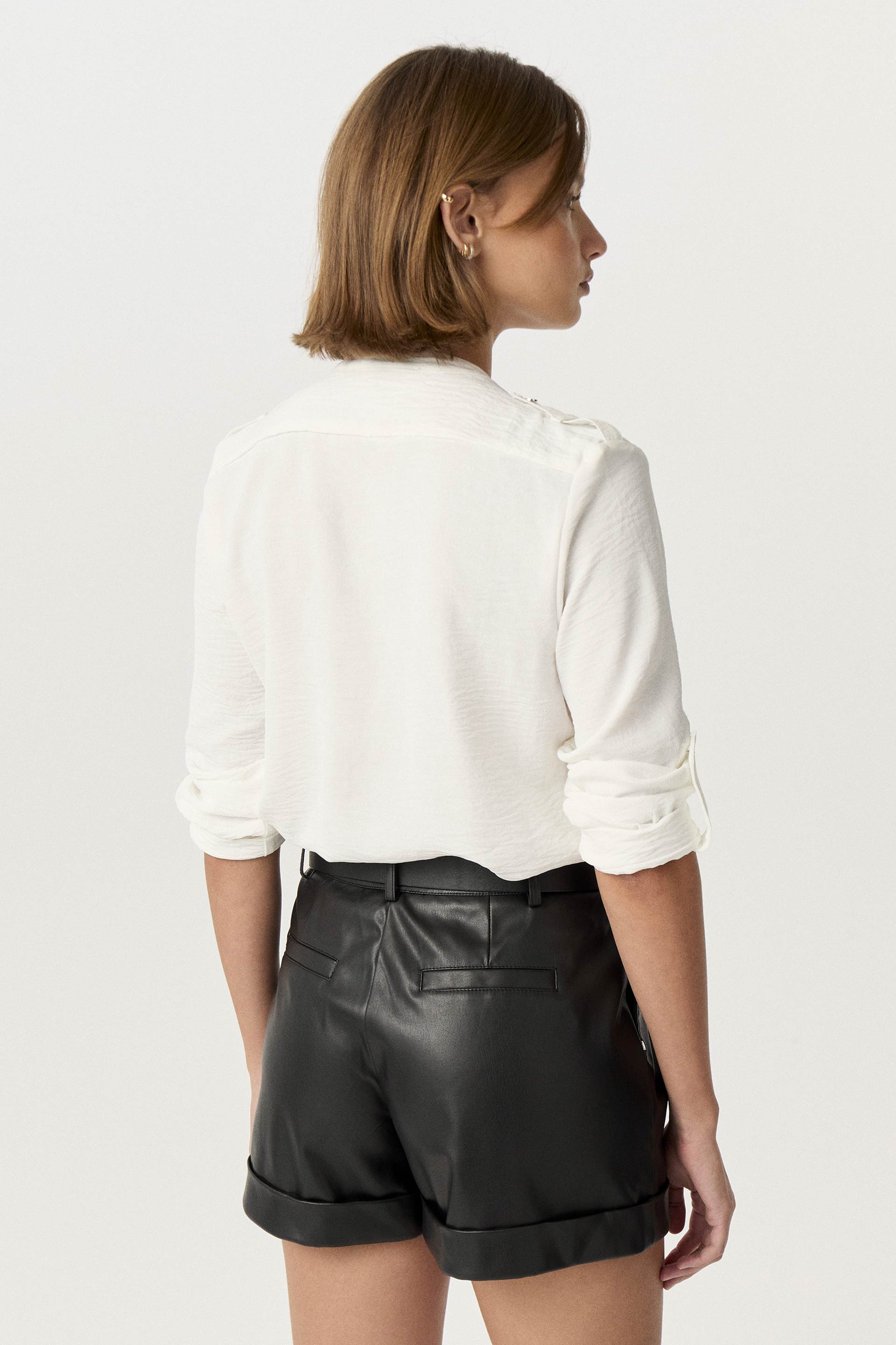 Camisa cargo en crepe wash, de calce relajado y mangas 3/4. Su textura suave, estructura liviana y diseño utilitario con bolsillos frontales y botones metálicos la convierten en una prenda clave para sumar funcionalidad y estilo a tu look diario.