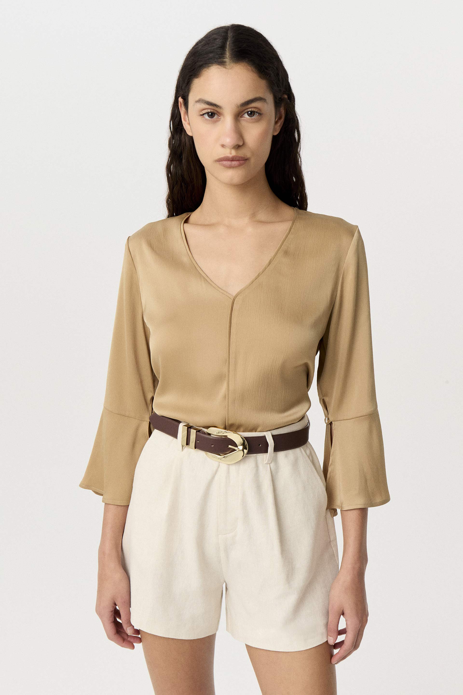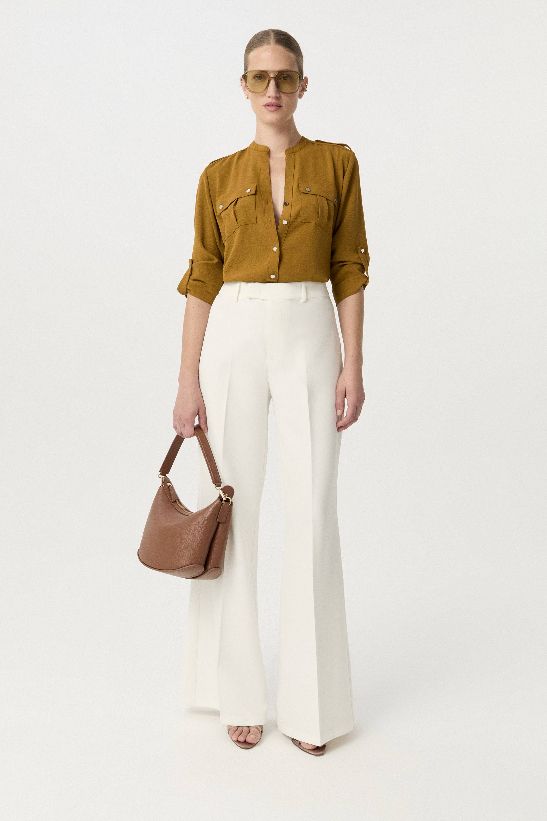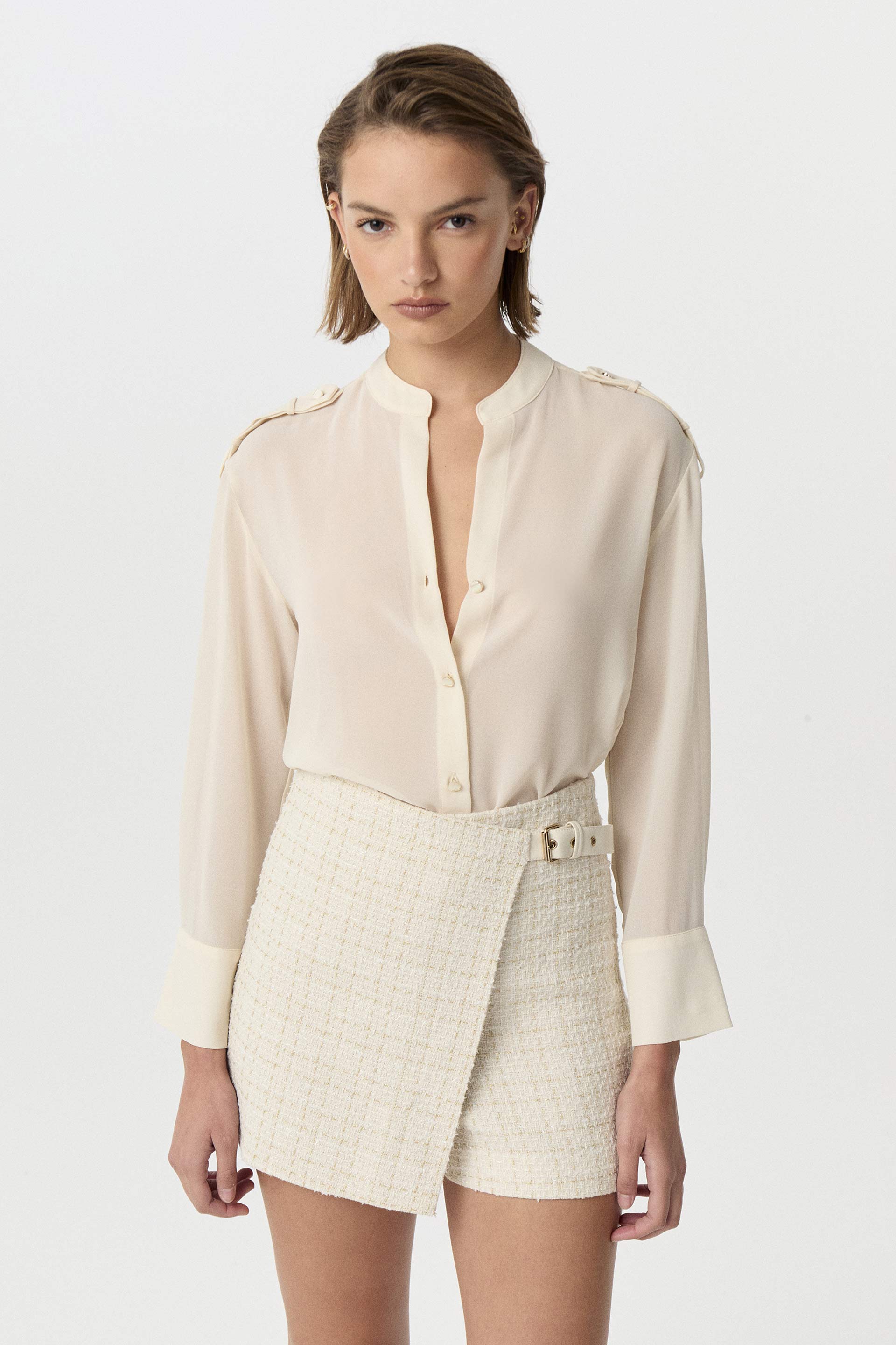 Camisa de poplín elastizado con trama de strass y calce relajado. Cuello clásico con abertura en V en el escote, delanteros cruzados y mangas fruncidas debajo del codo. Ideal para looks de noche con un toque de brillo sutil.