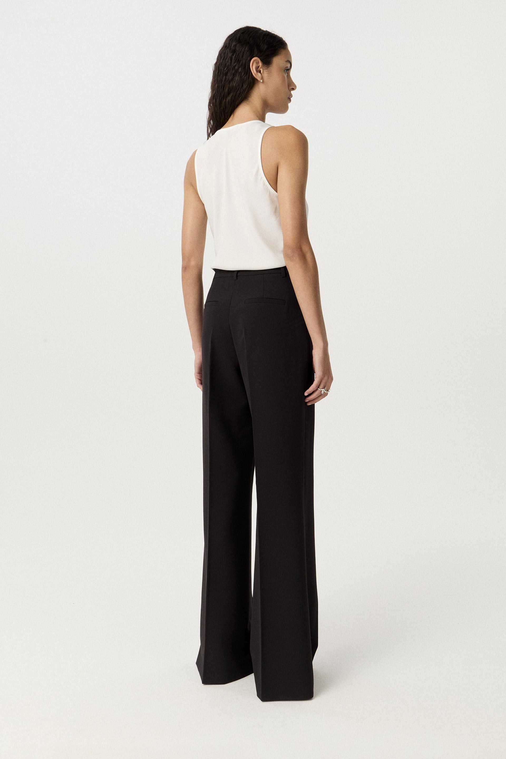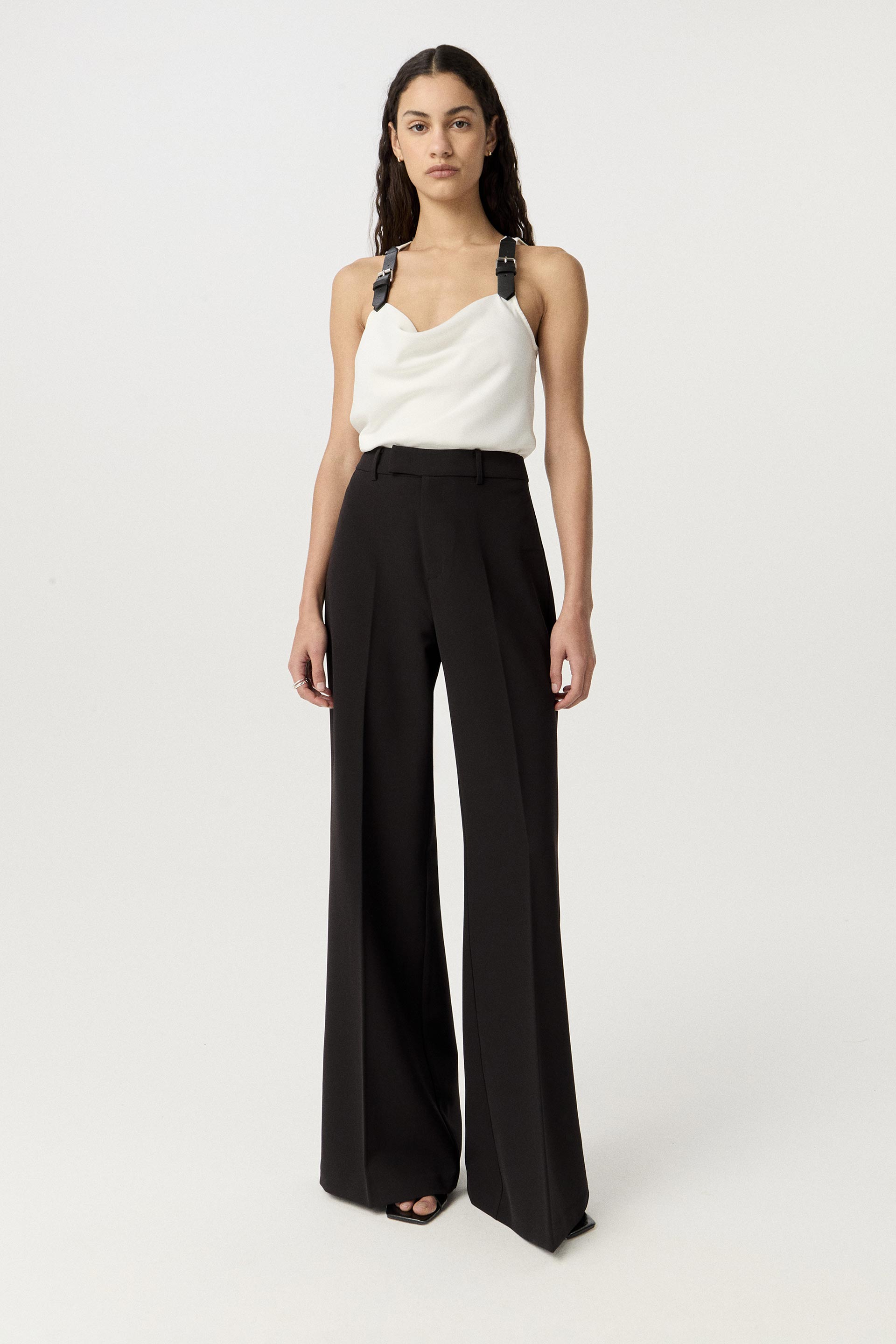 Top de sedita de calce al cuerpo con escote buche. Breteles delanteros con martingalas efecto cuero que le dan un toque moderno y sofisticado. Un diseño que suma actitud a cualquier look nocturno, ideal para combinar con pantalones sastreros.