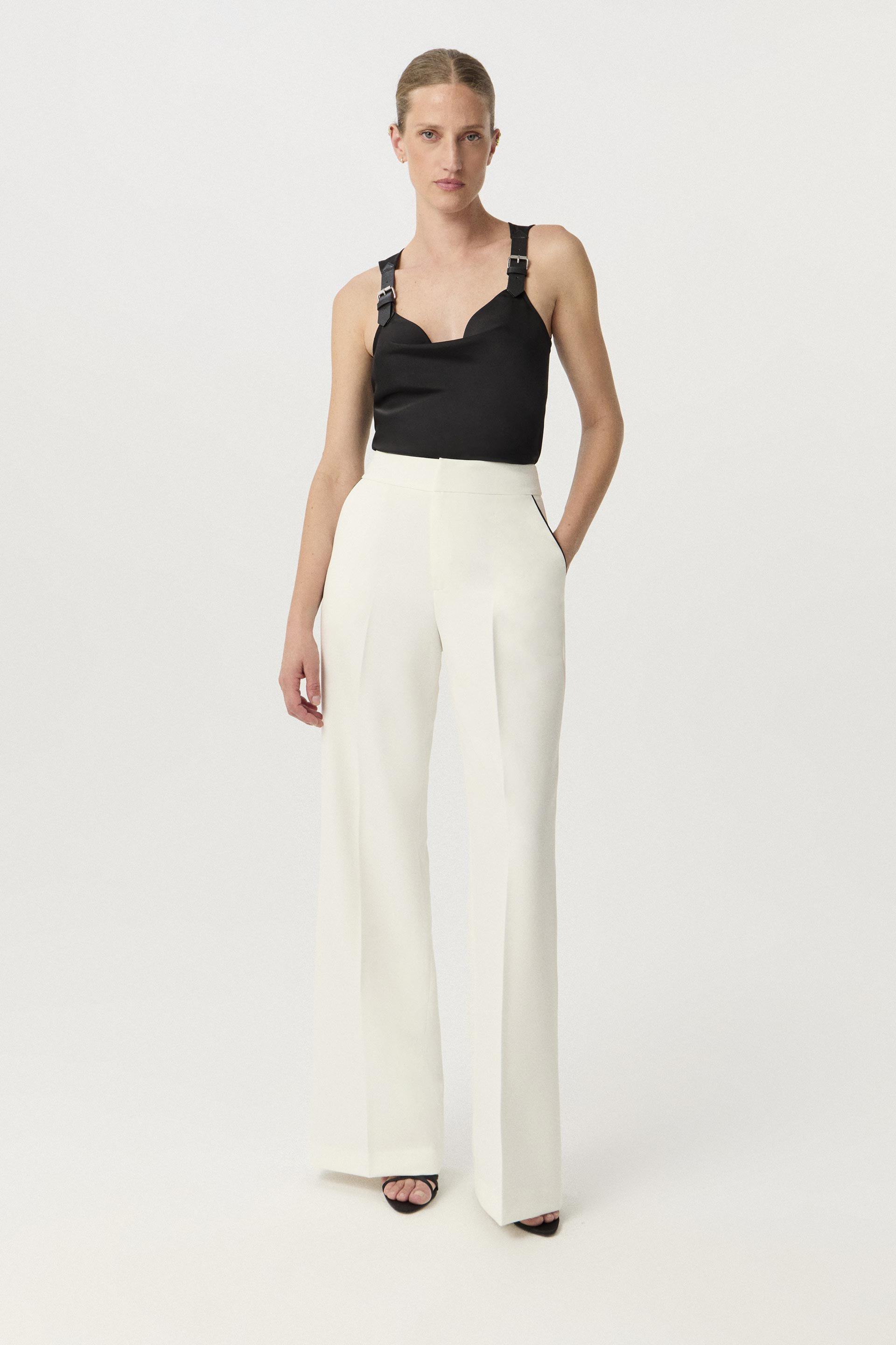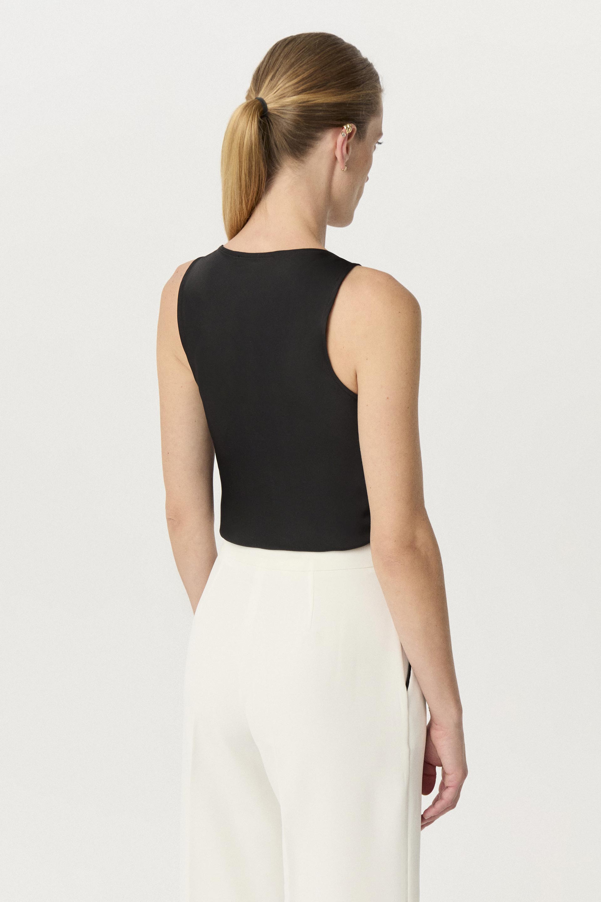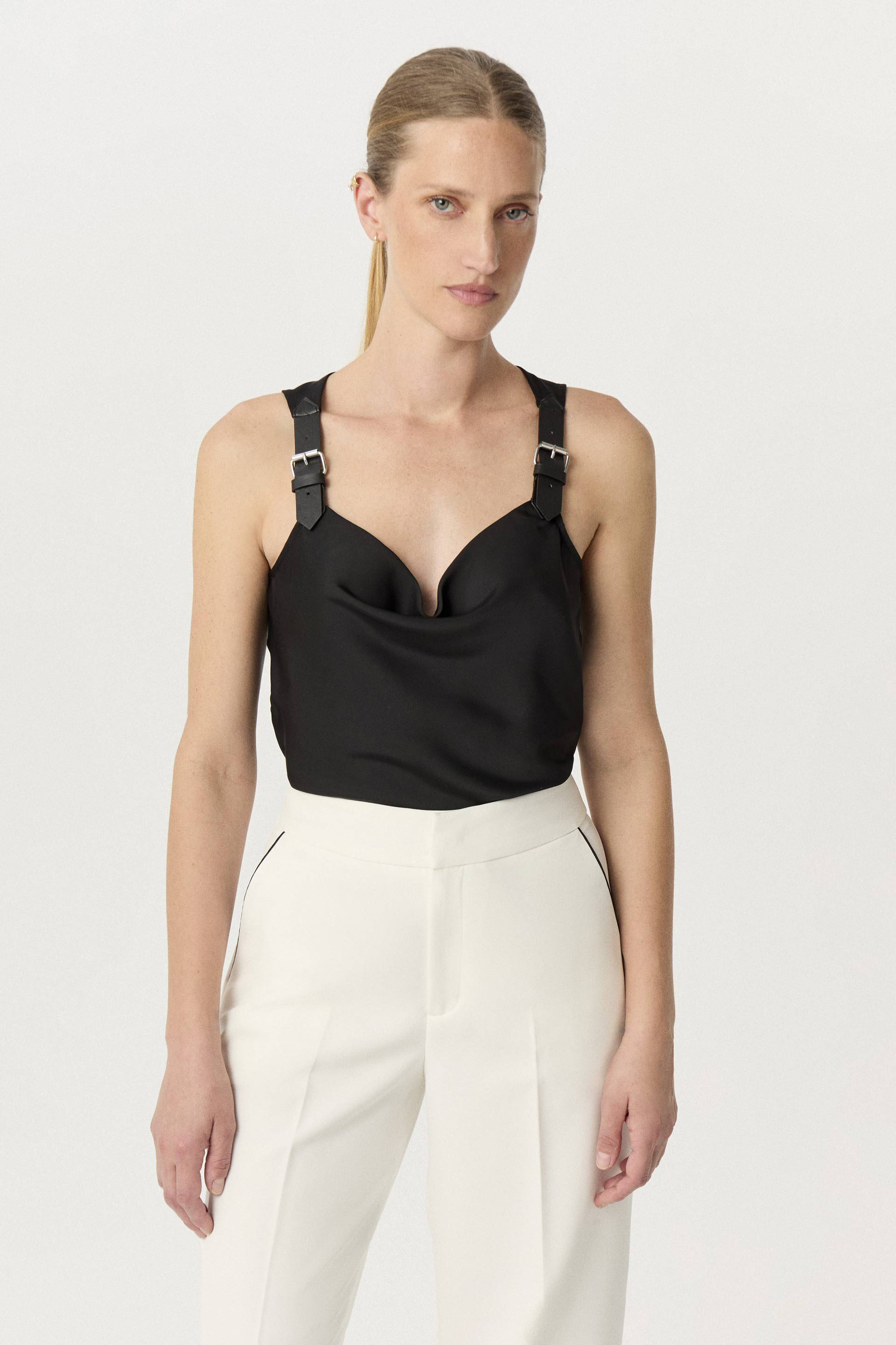 Top de sedita de calce al cuerpo con escote buche. Breteles delanteros con martingalas efecto cuero que le dan un toque moderno y sofisticado. Un diseño que suma actitud a cualquier look nocturno, ideal para combinar con pantalones sastreros.