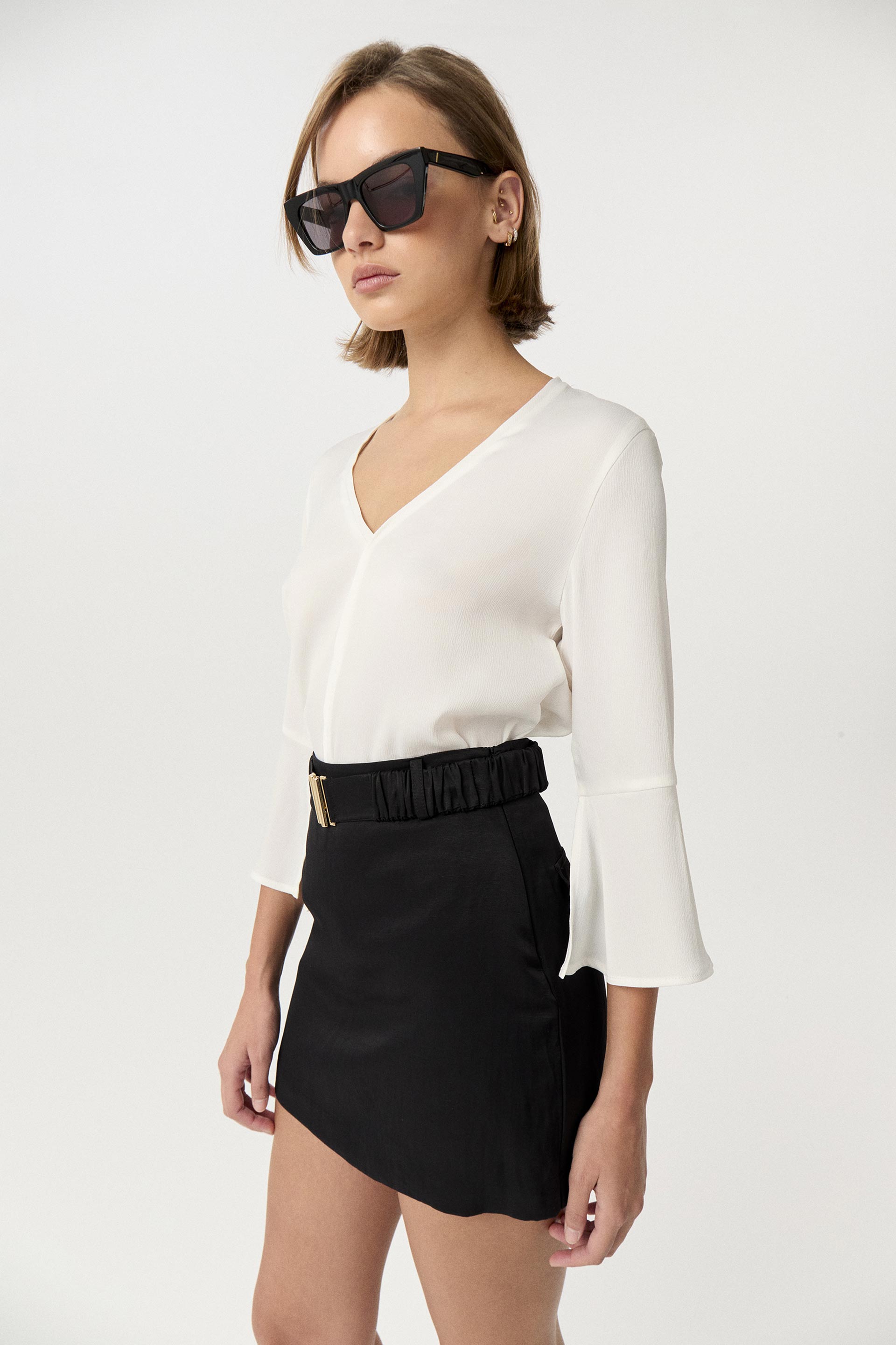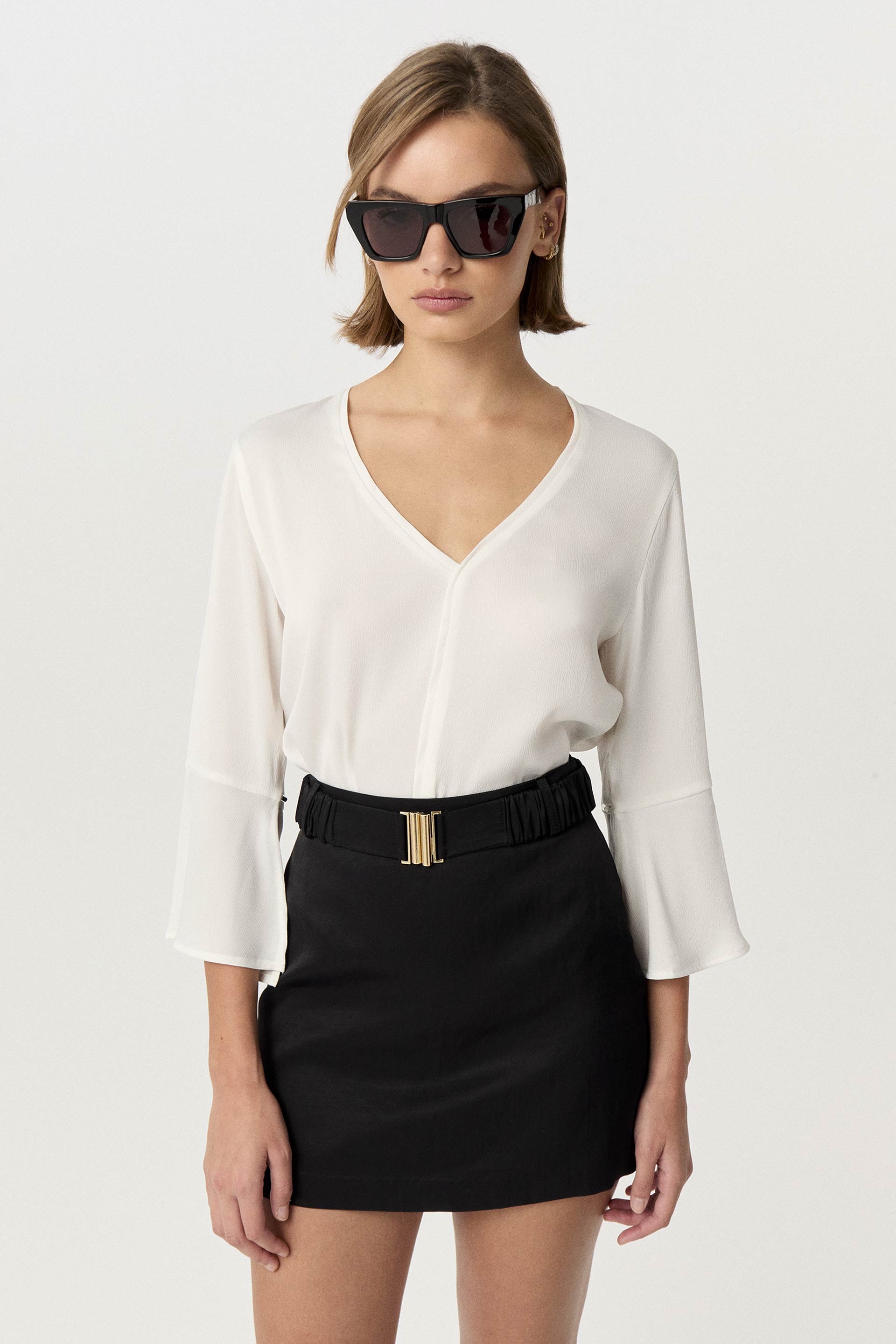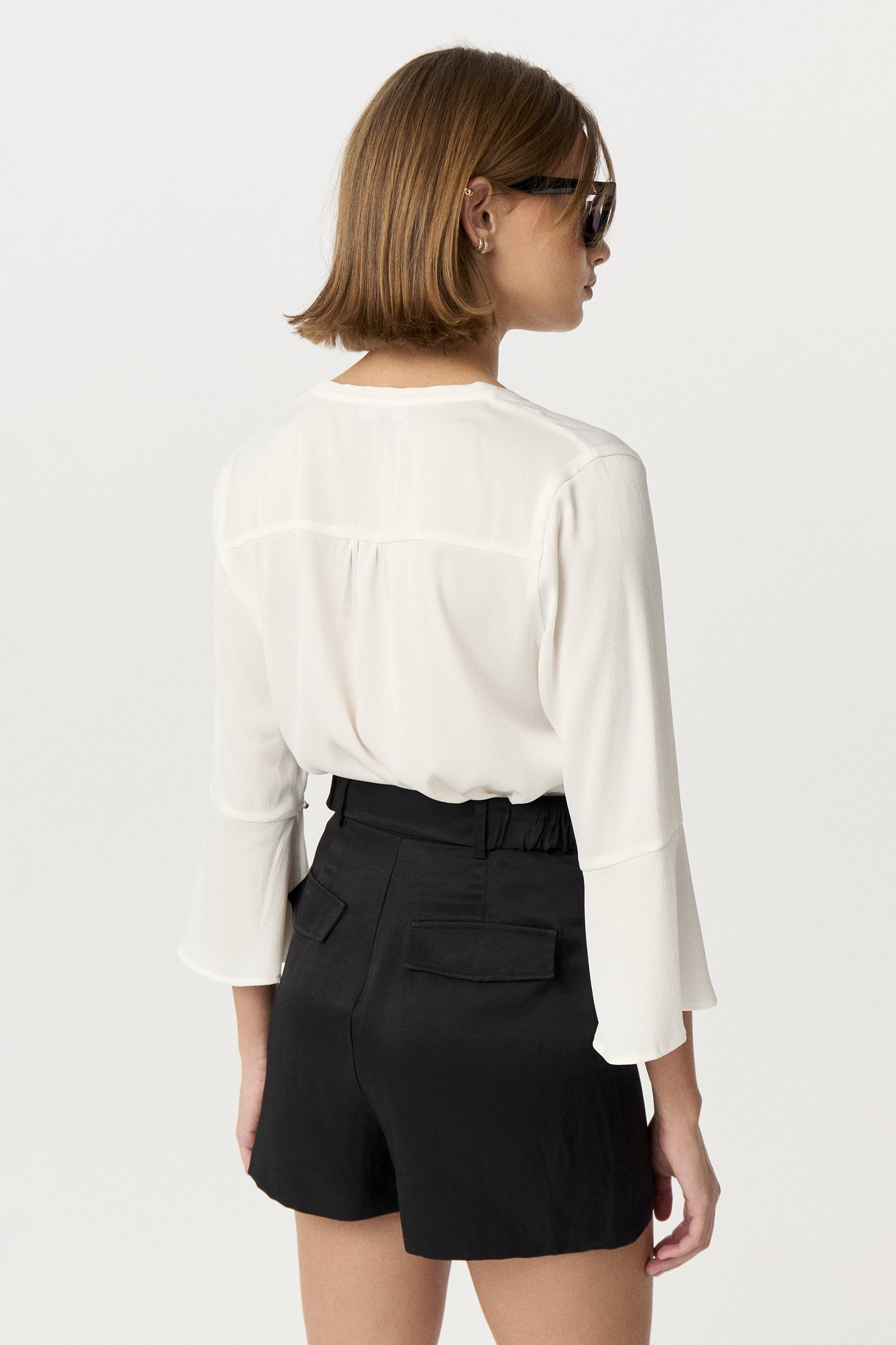 Blusa en sedita texturada de calce amplio. Escote en V con recorte central en delantero, envivado en la misma tela que aporta un detalle sutil y elegante. Canesú con frunces en la espalda para sumar movimiento, y mangas 3/4 con puños estilo volado y botón a tono. Perfecta para looks descontracturados con un toque sofisticado.