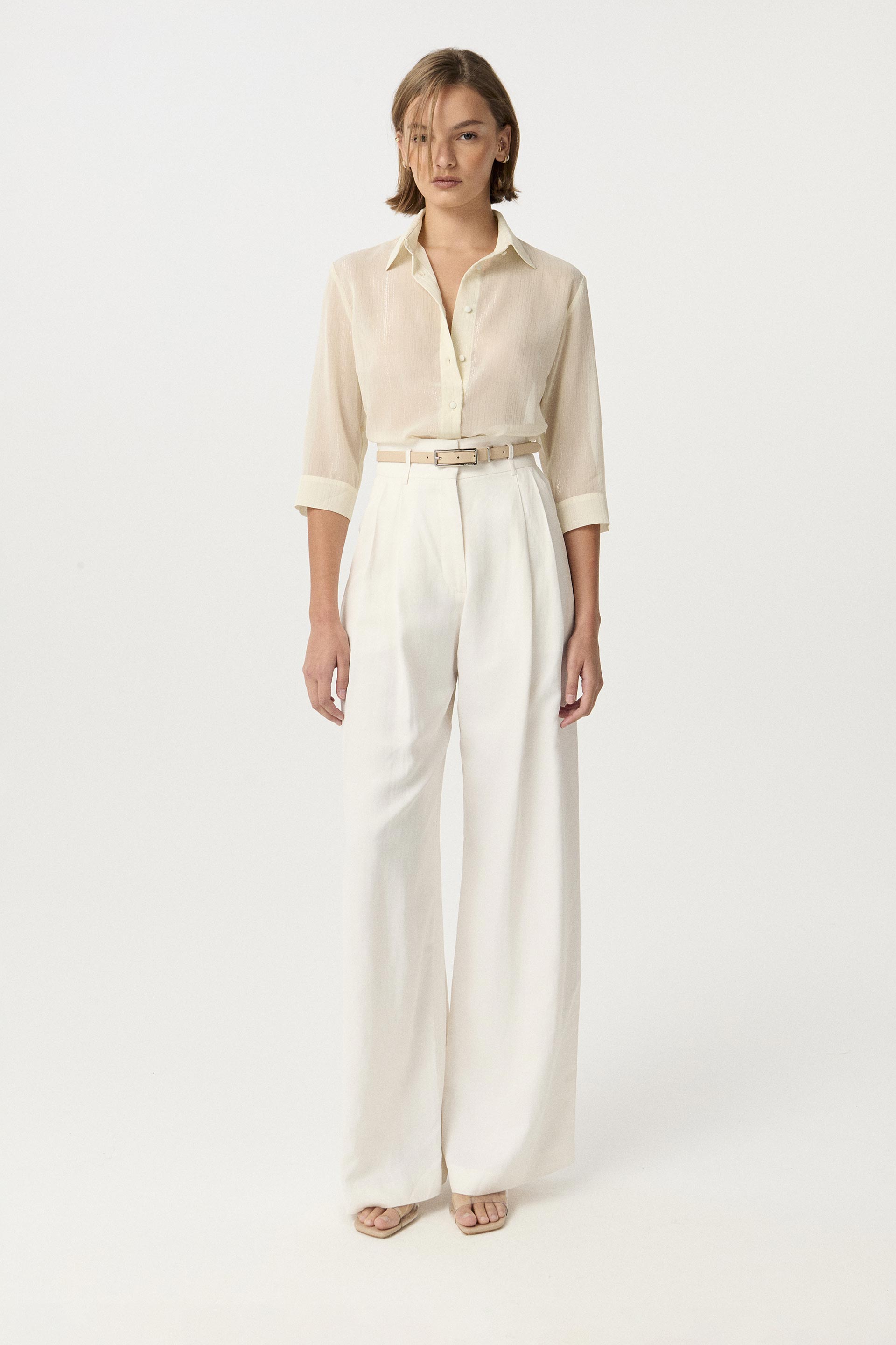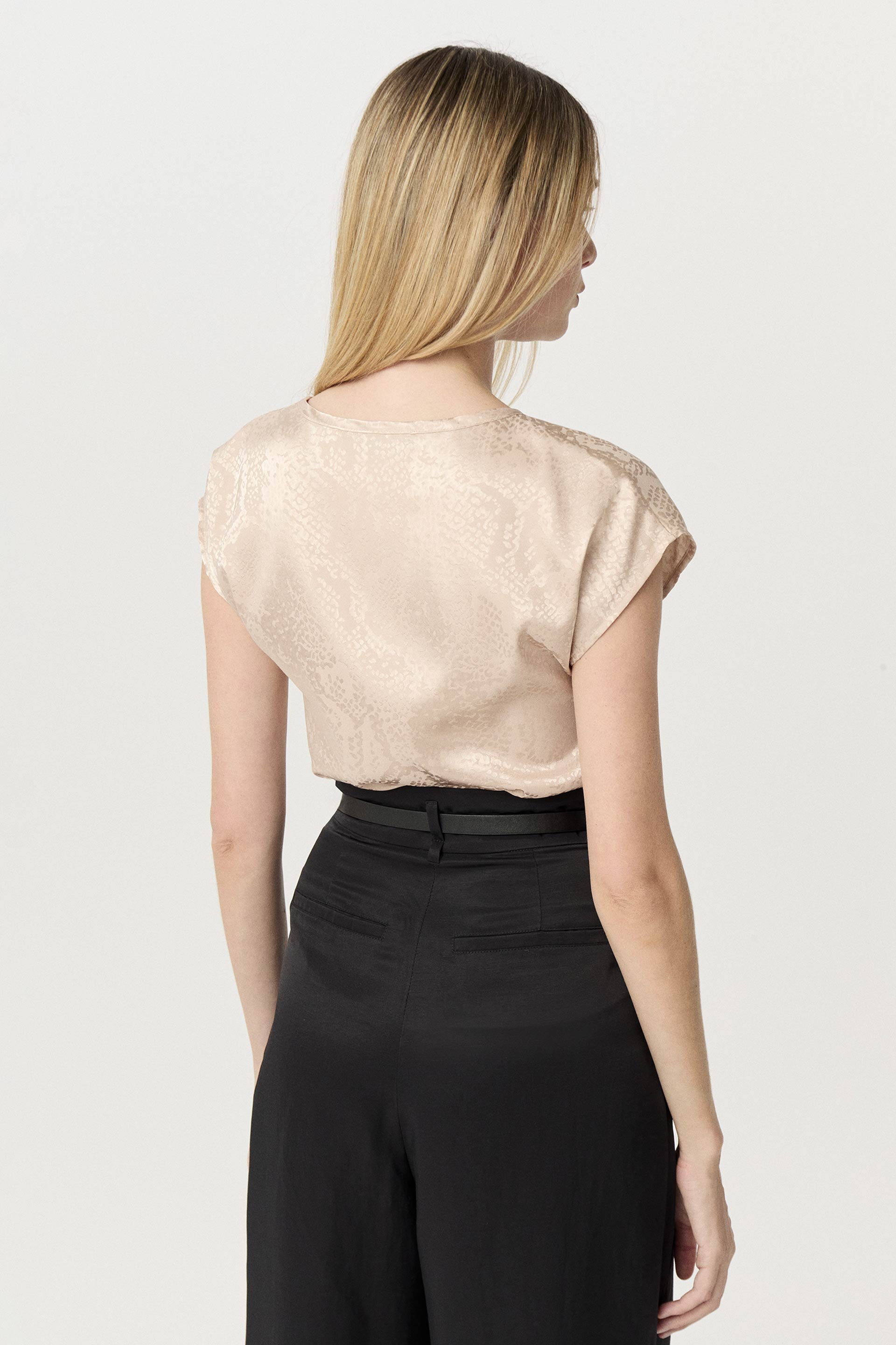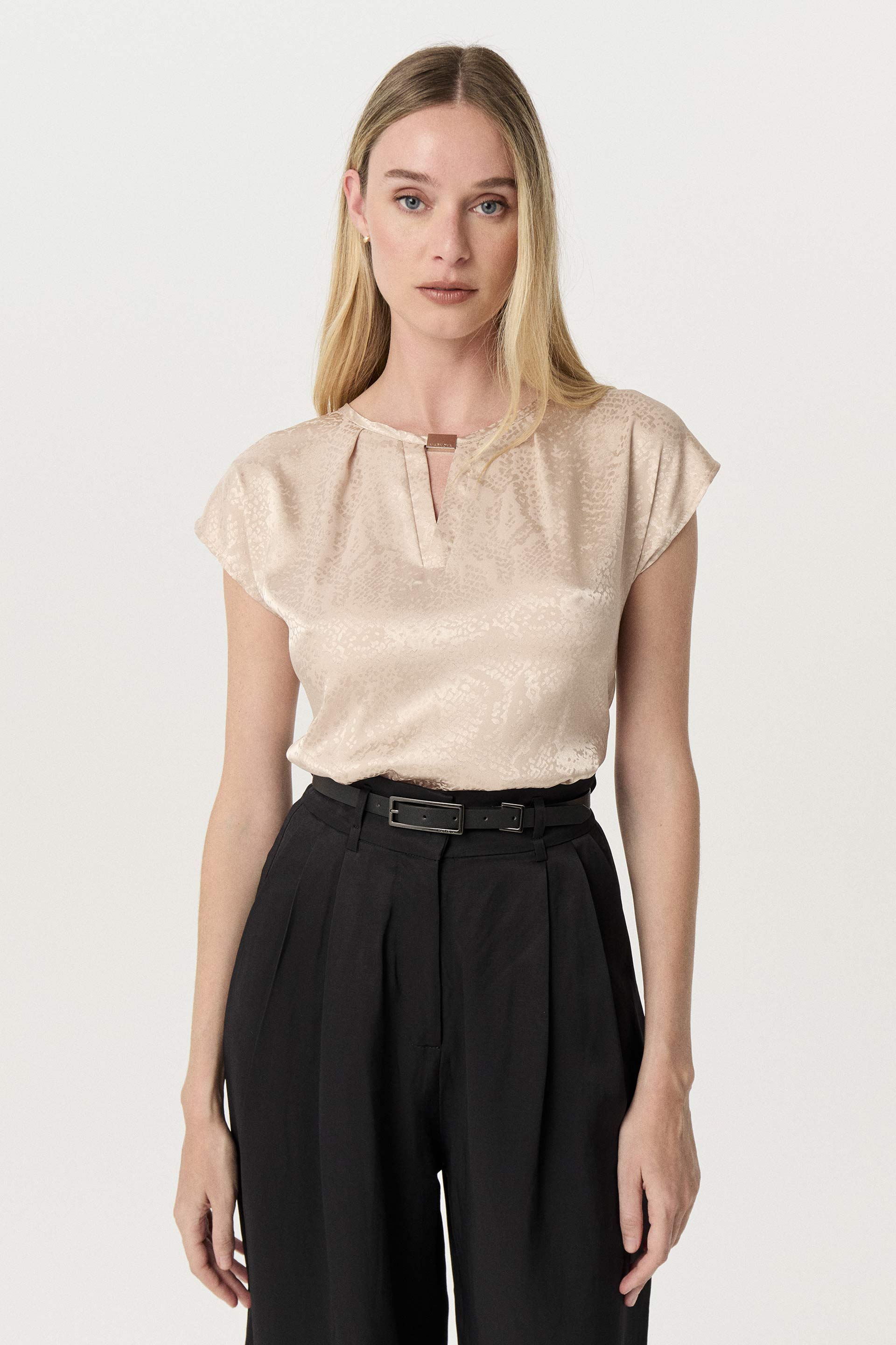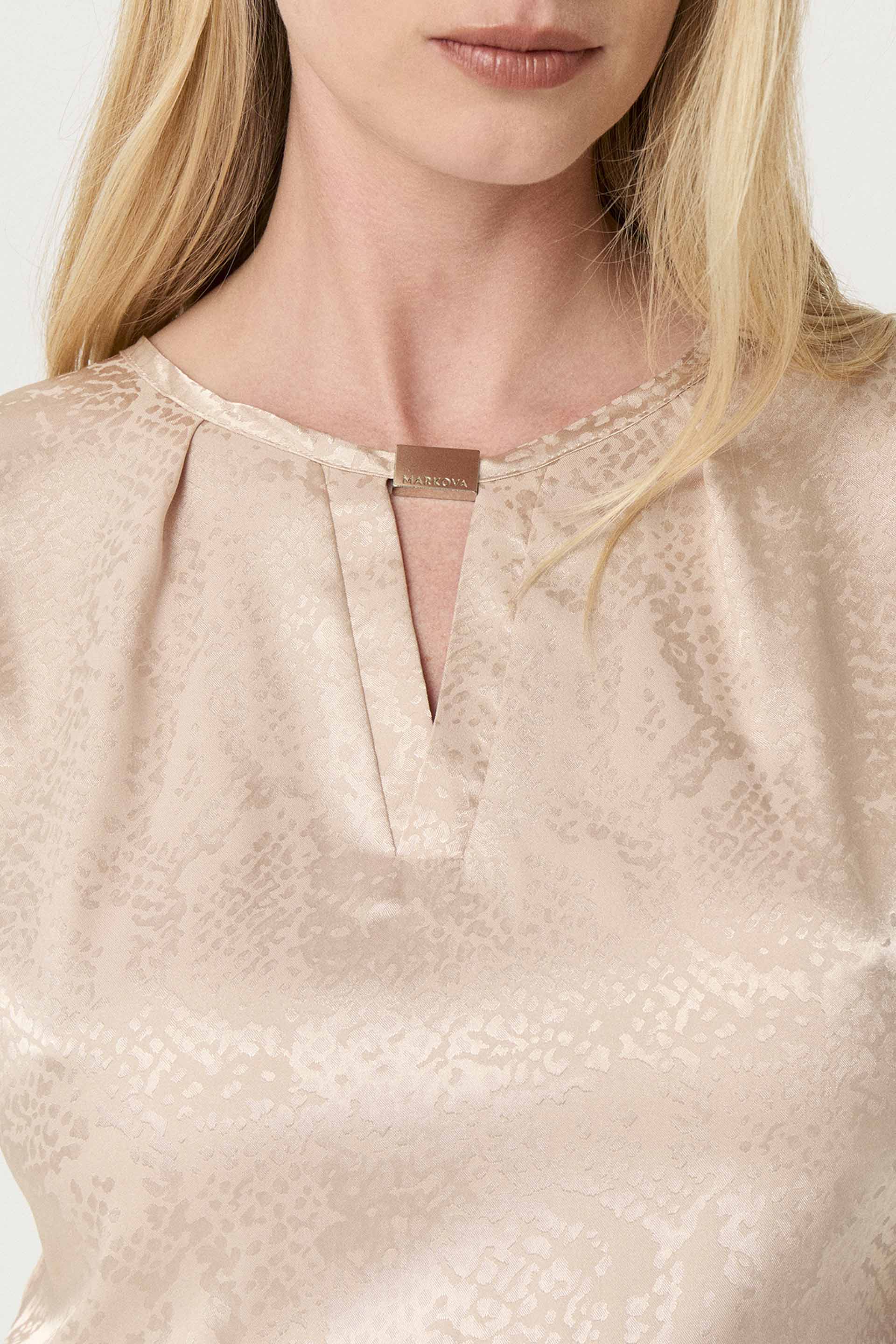Blusa en sedita jacquard de calce relajado. Hombros caídos, cuello redondo amplio con cartera y chapón metálico MKV. Posee detalles de tablas en escote. Un clásico con un toque moderno, ideal para lograr un look sofisticado y actual en la oficina.