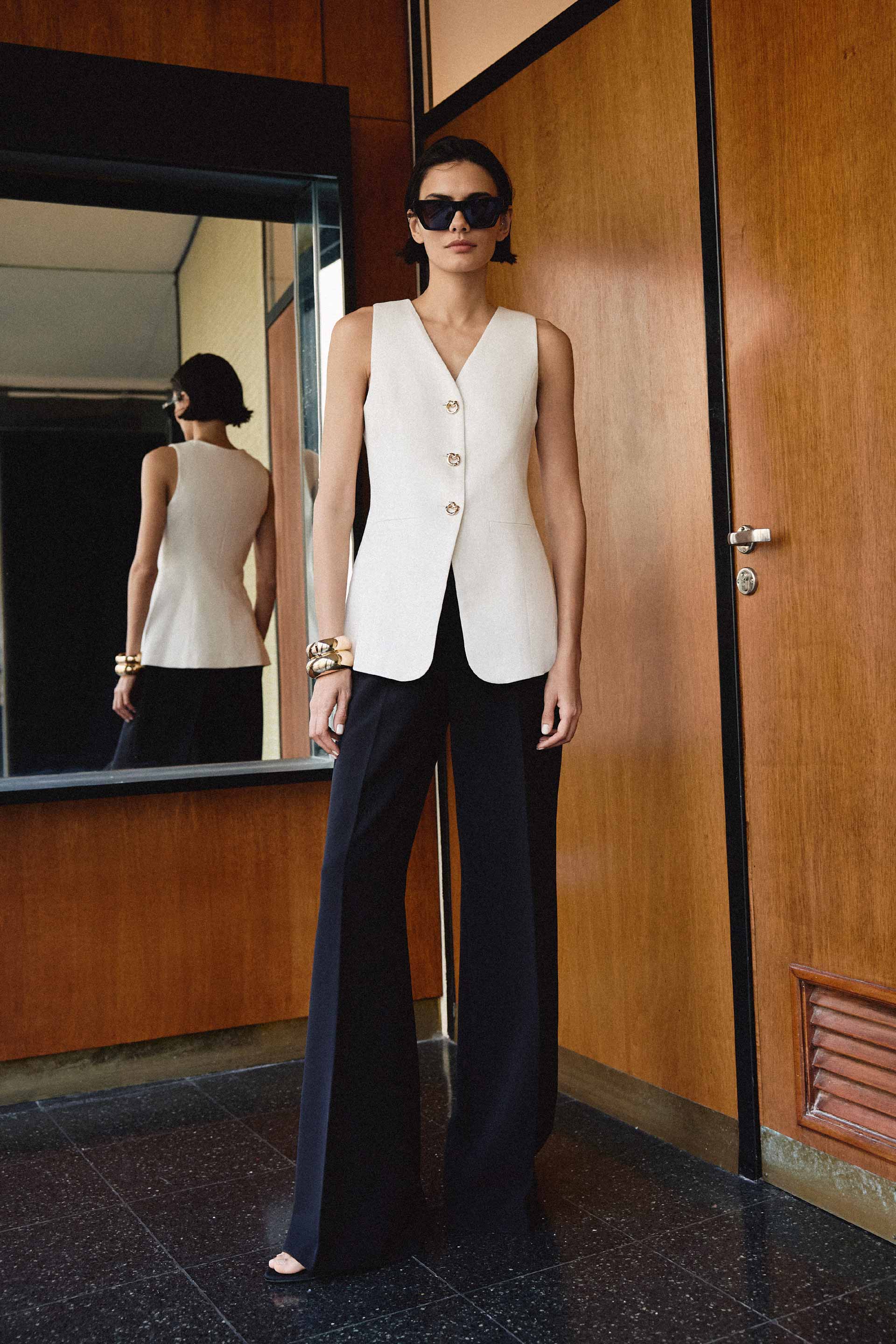 Chaleco largo de sastrería lino viscosa con calce al cuerpo y escote en V. Botones metálicos exclusivos MKV y bolsillos ojal que aportan estilo y funcionalidad. Una pieza imprescindible que eleva tu guardarropa con sofisticación y actitud. Combinalo con el pantalón Nitu para un total look sastrero.