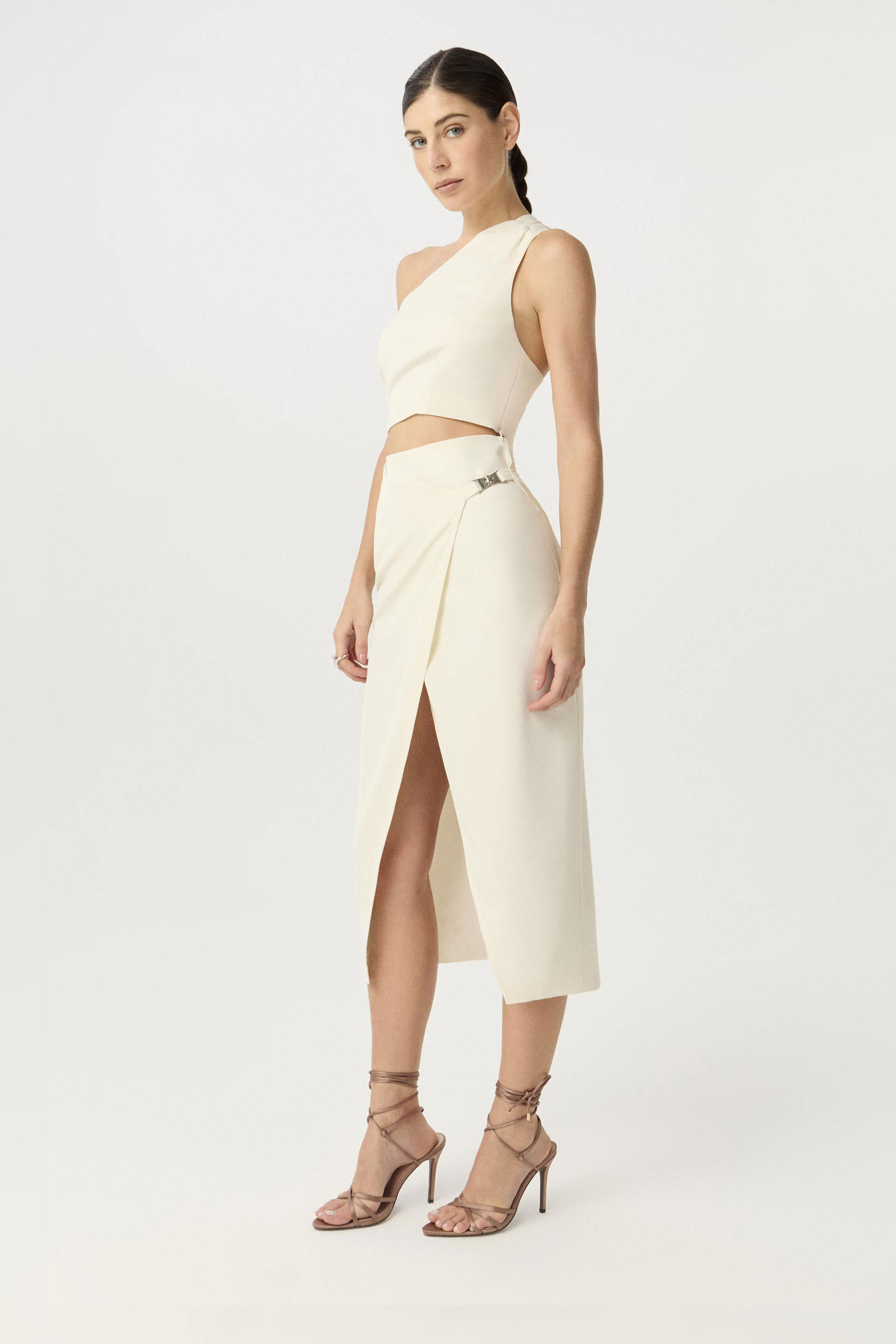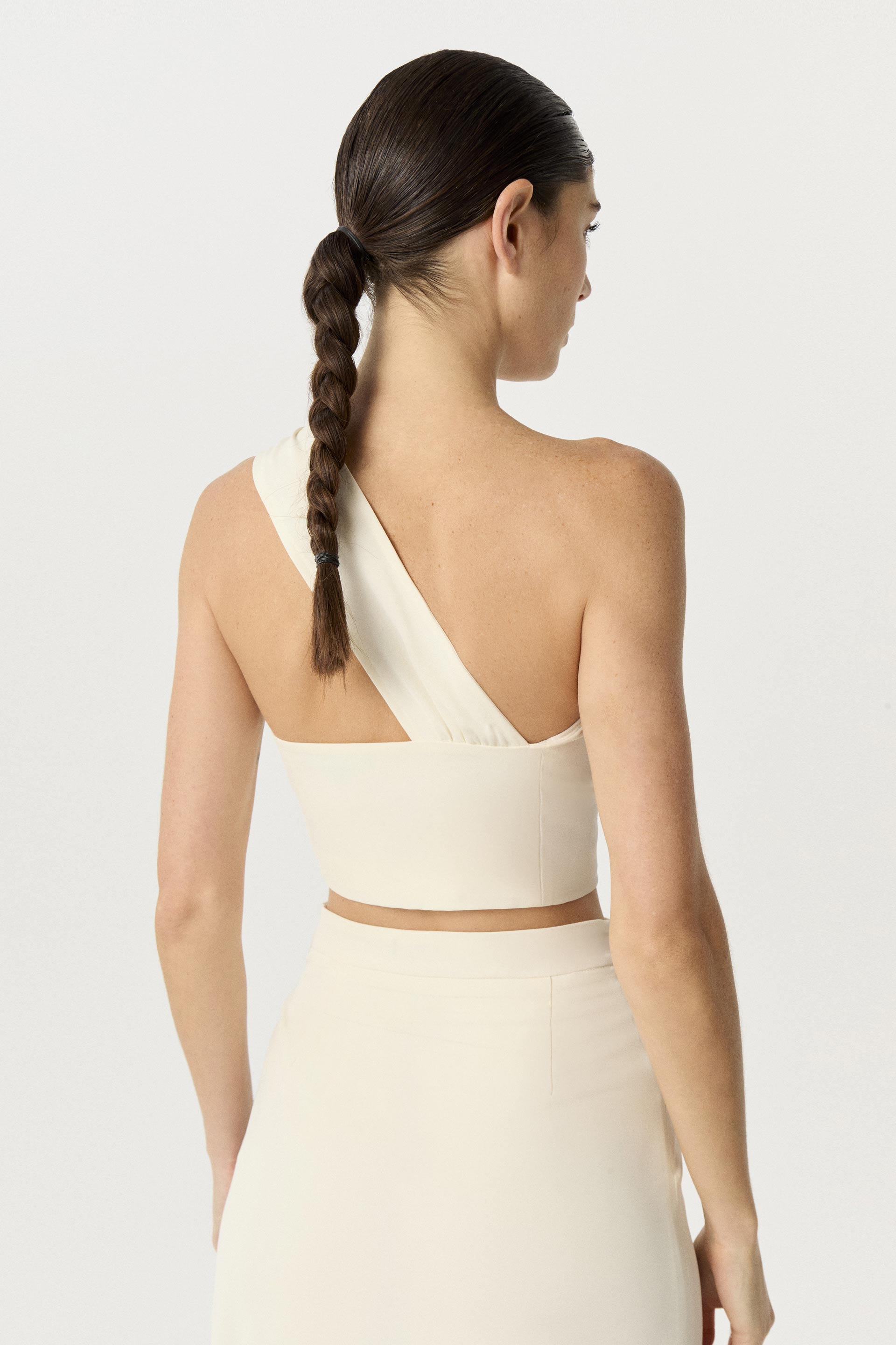 Top en sastrería de alta torsión, de calce al cuerpo. Diseño asimétrico con un solo hombro y frunces en costura. Bretel cruzado en espalda y pinzas de entalle que realzan la silueta. Su minimalismo sofisticado lo hace ideal para eventos de día o noche. Combinado con la falda Samer, es una apuesta segura para destacar con naturalidad.