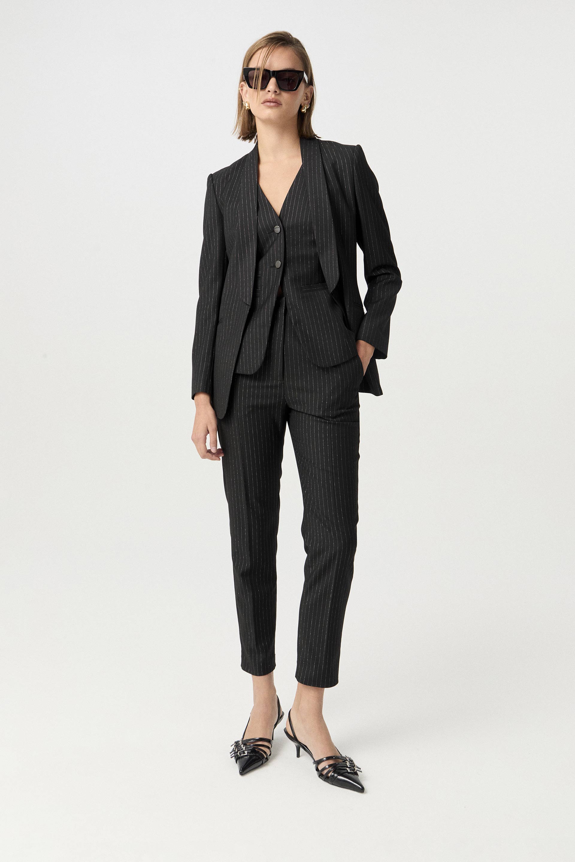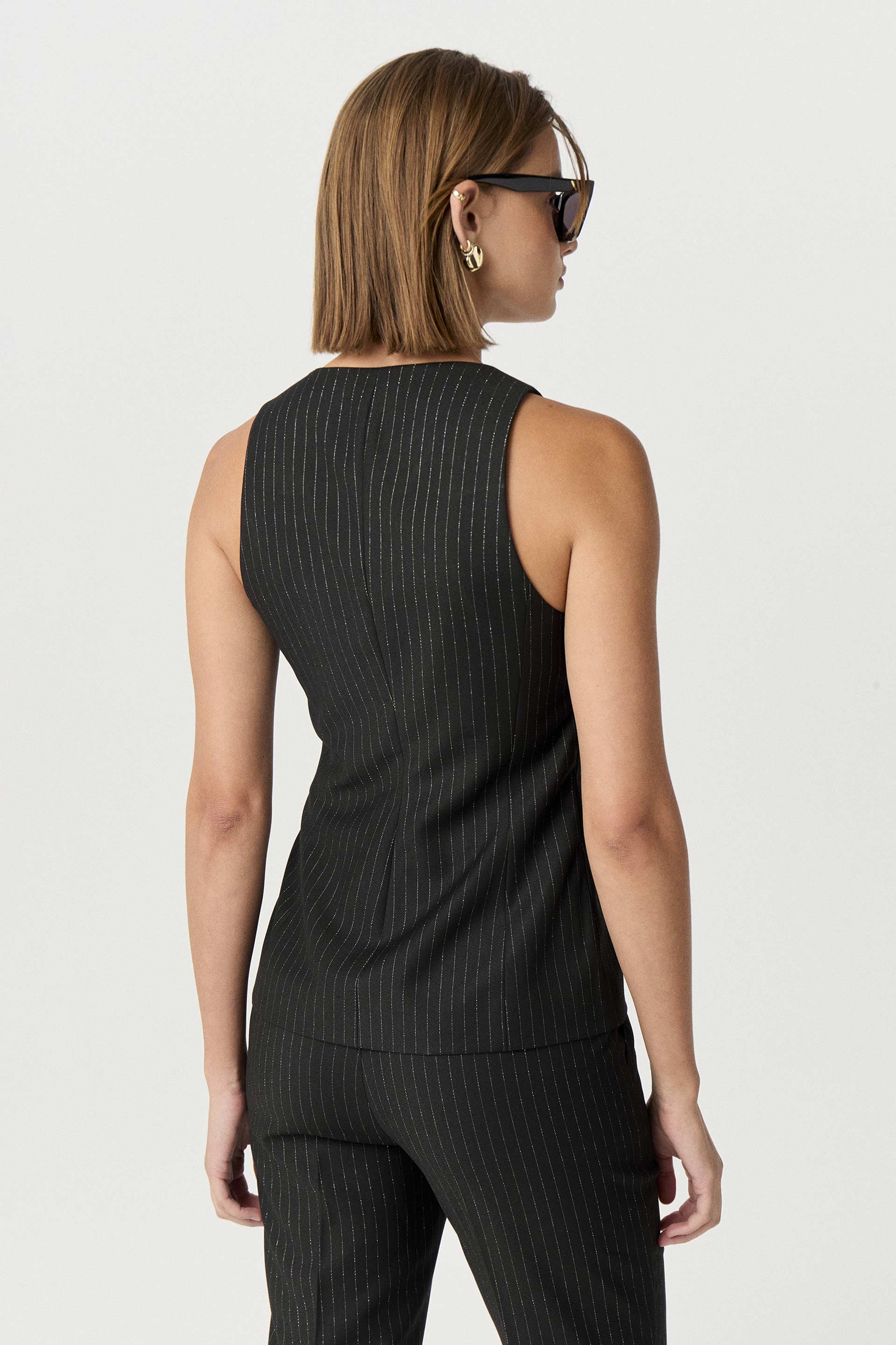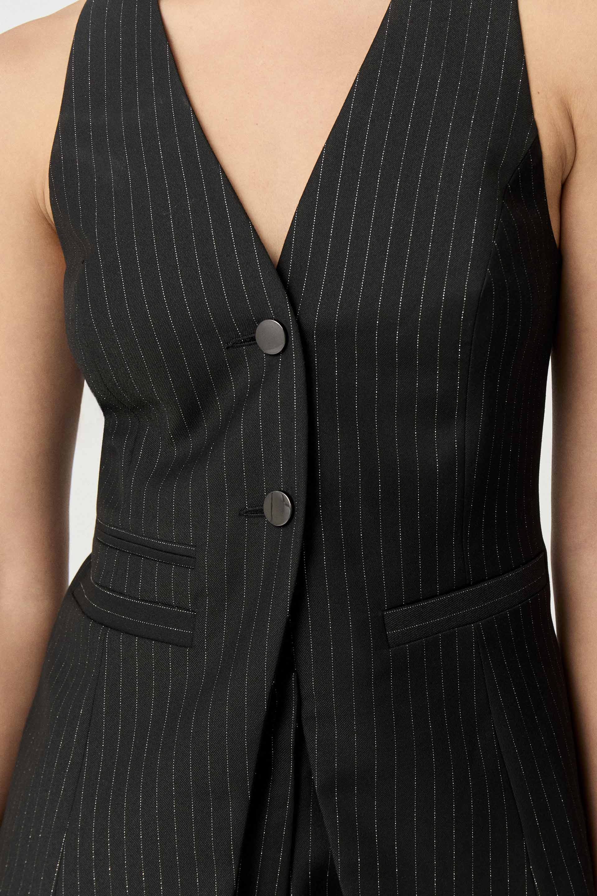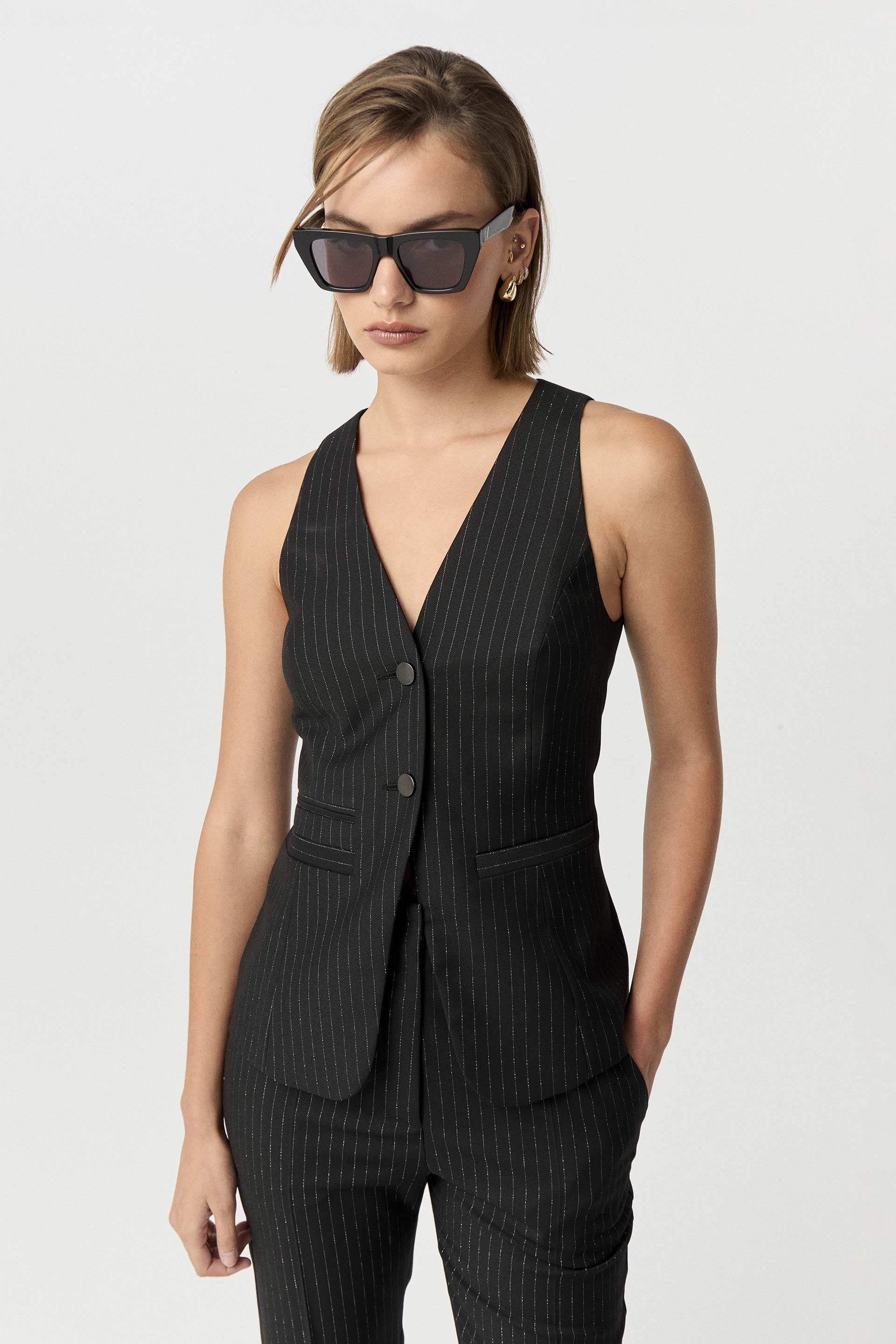 Chaleco largo de sastrería tizada con lúrex de calce al cuerpo. Posee escote en V, acceso con doble botón y bolsillos ojal. Combinalo con el pantalón Feni para armar un total look sastrero de absoluta tendencia.