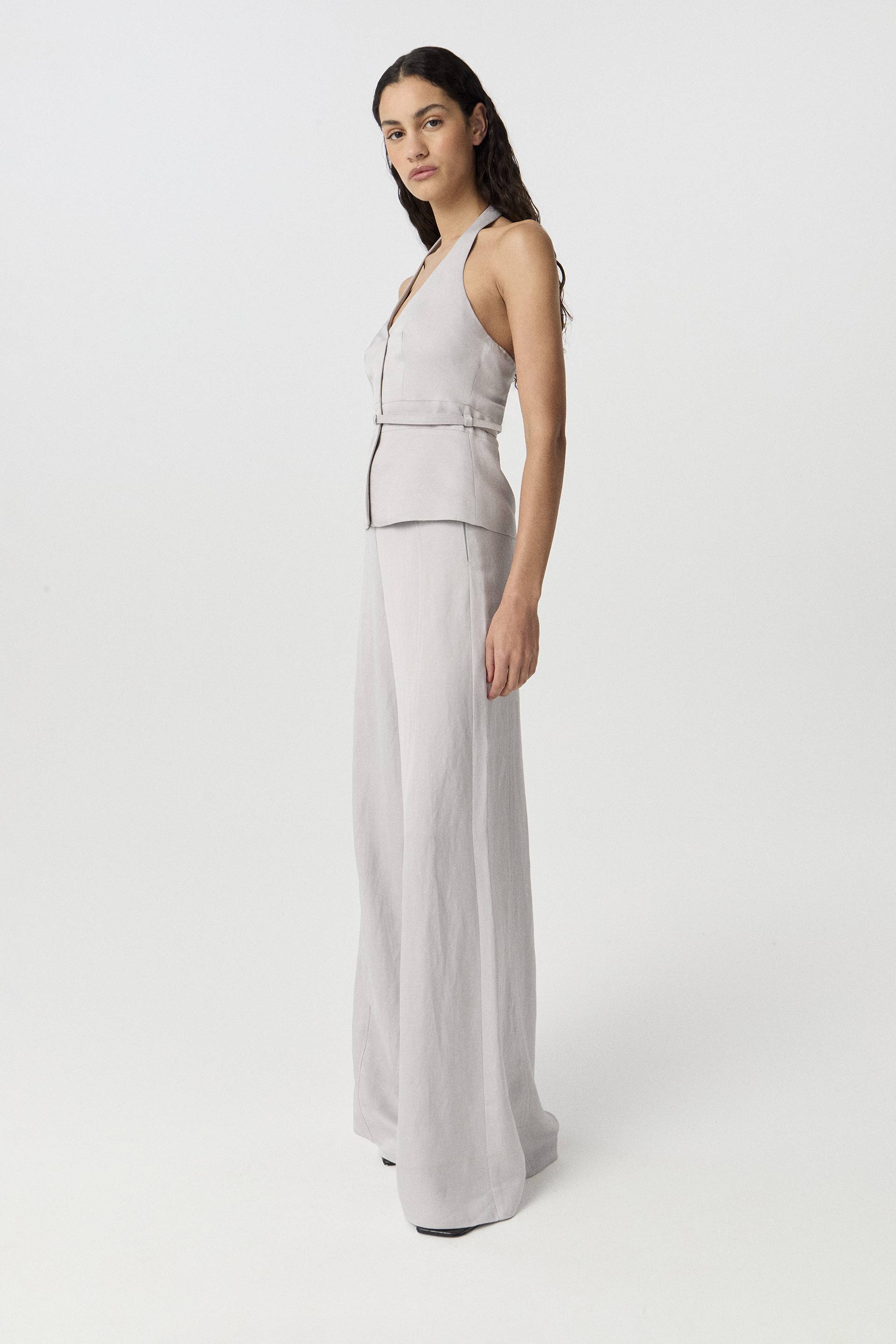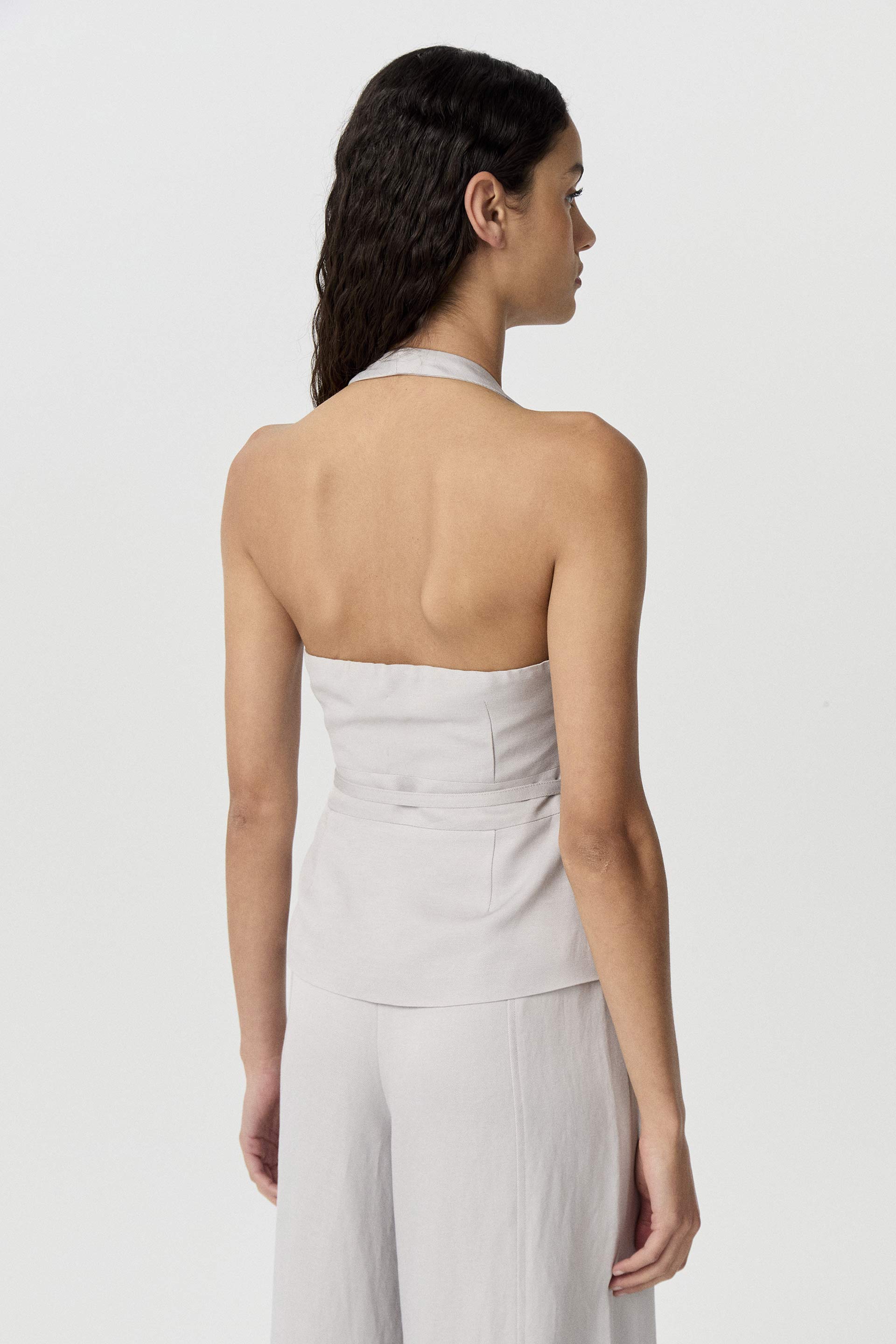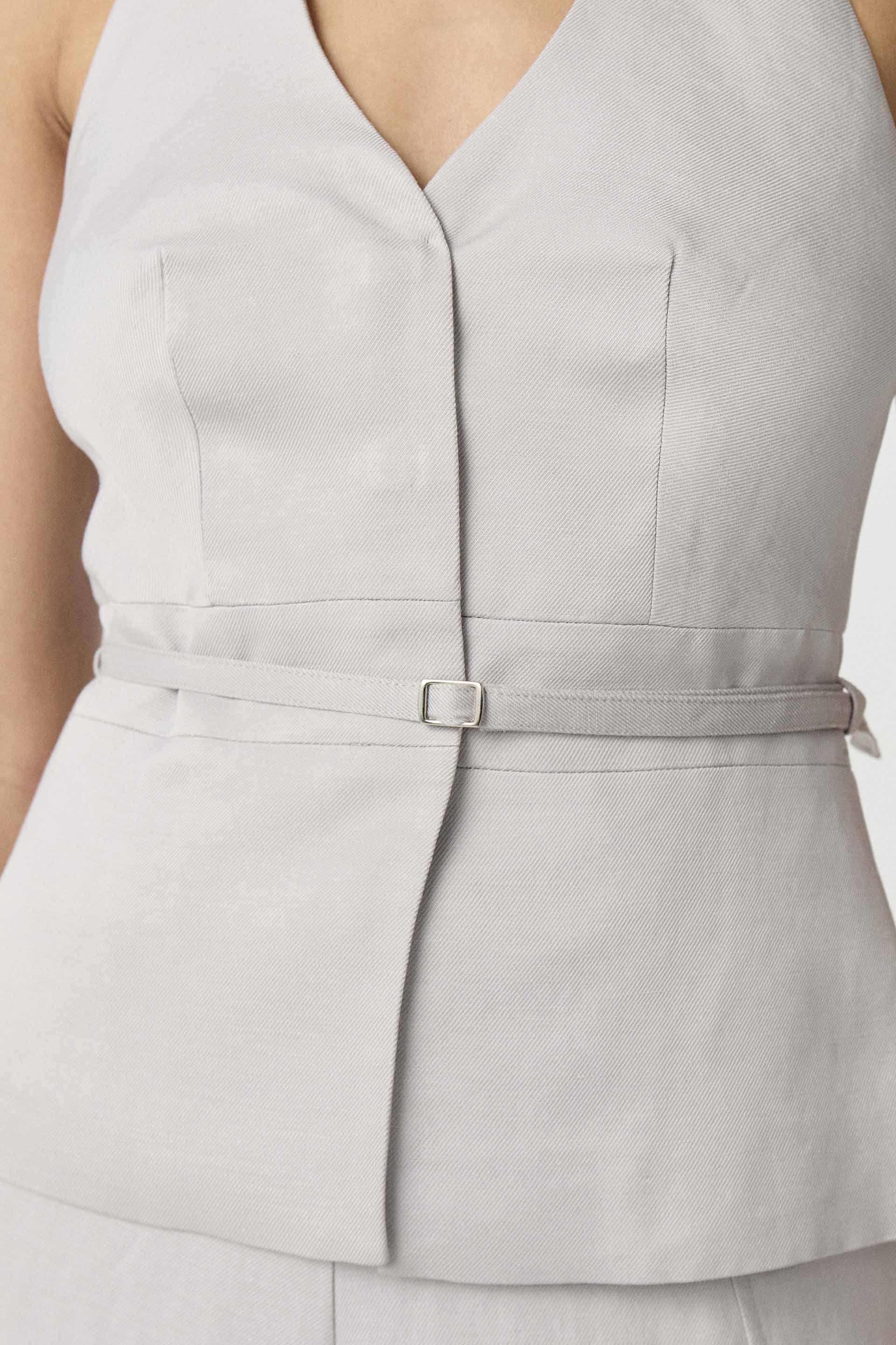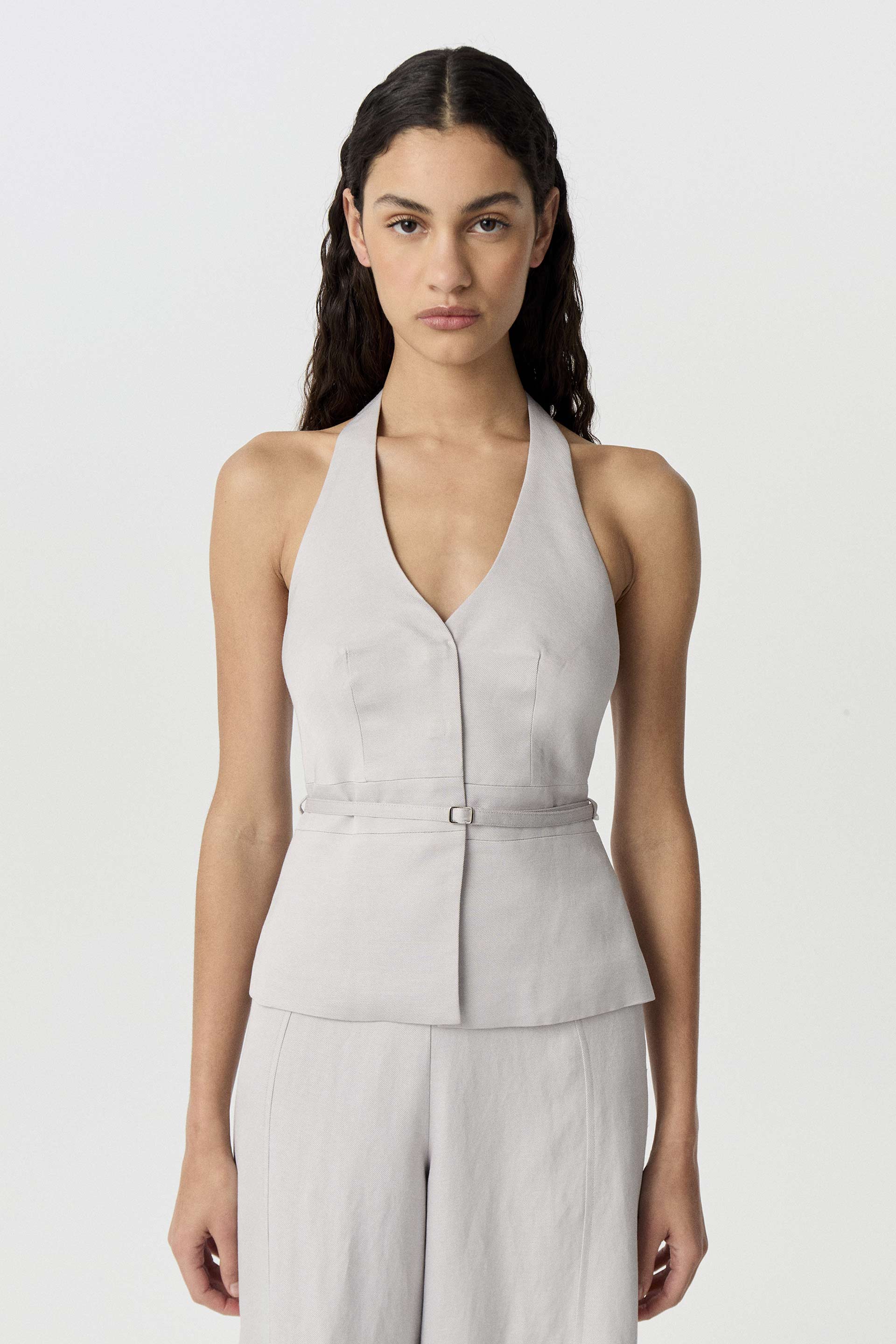 Chaleco confeccionado en sastrería viscosa lino. Con escote halter y acceso delantero con ganchos internos, posee un recorte en cintura con un cinturón angosto acompañado con hebilla metálica que le dan un toque moderno y estructurado a la silueta. Combinalo con el pantalón Winna para lograr un look sastrero moderno.