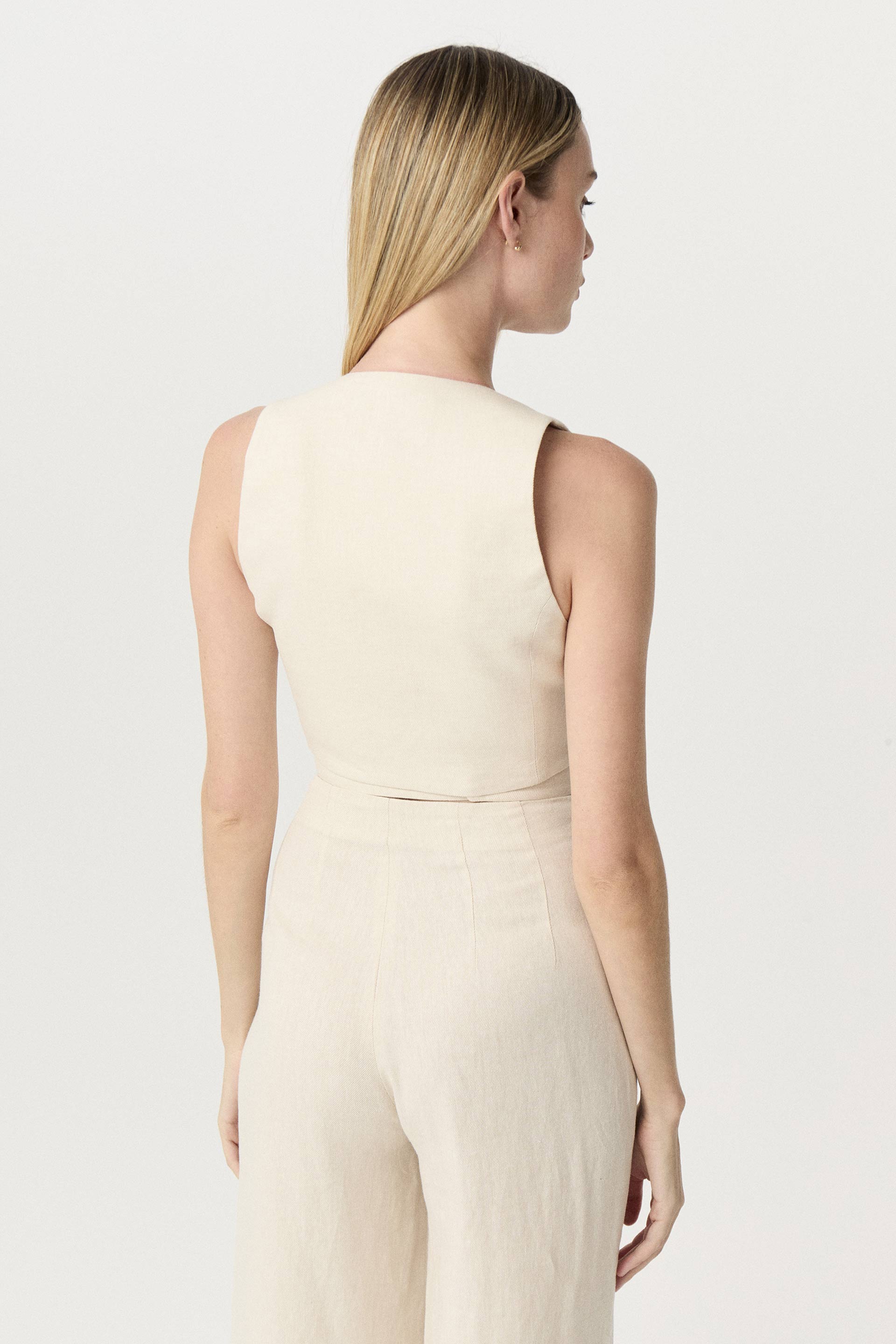 Top cruzado en sastrería twill lino cotton, con escote en V y tira regulable con broches personalizados. La hebilla metálica de forma orgánica aporta un detalle contemporáneo y elegante, que eleva el diseño. Combinalo con el pantalón Prana para armar un set perfecto.