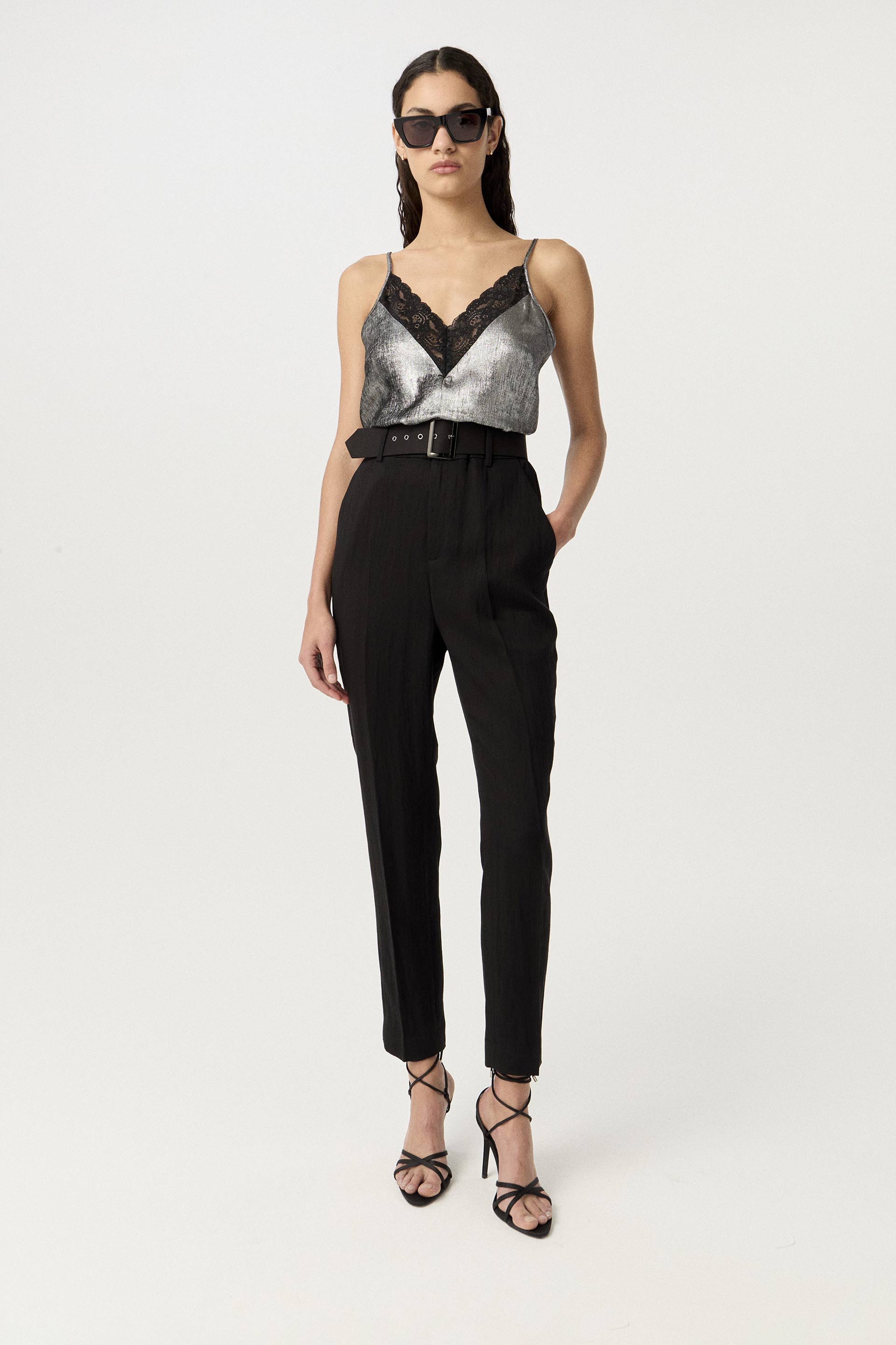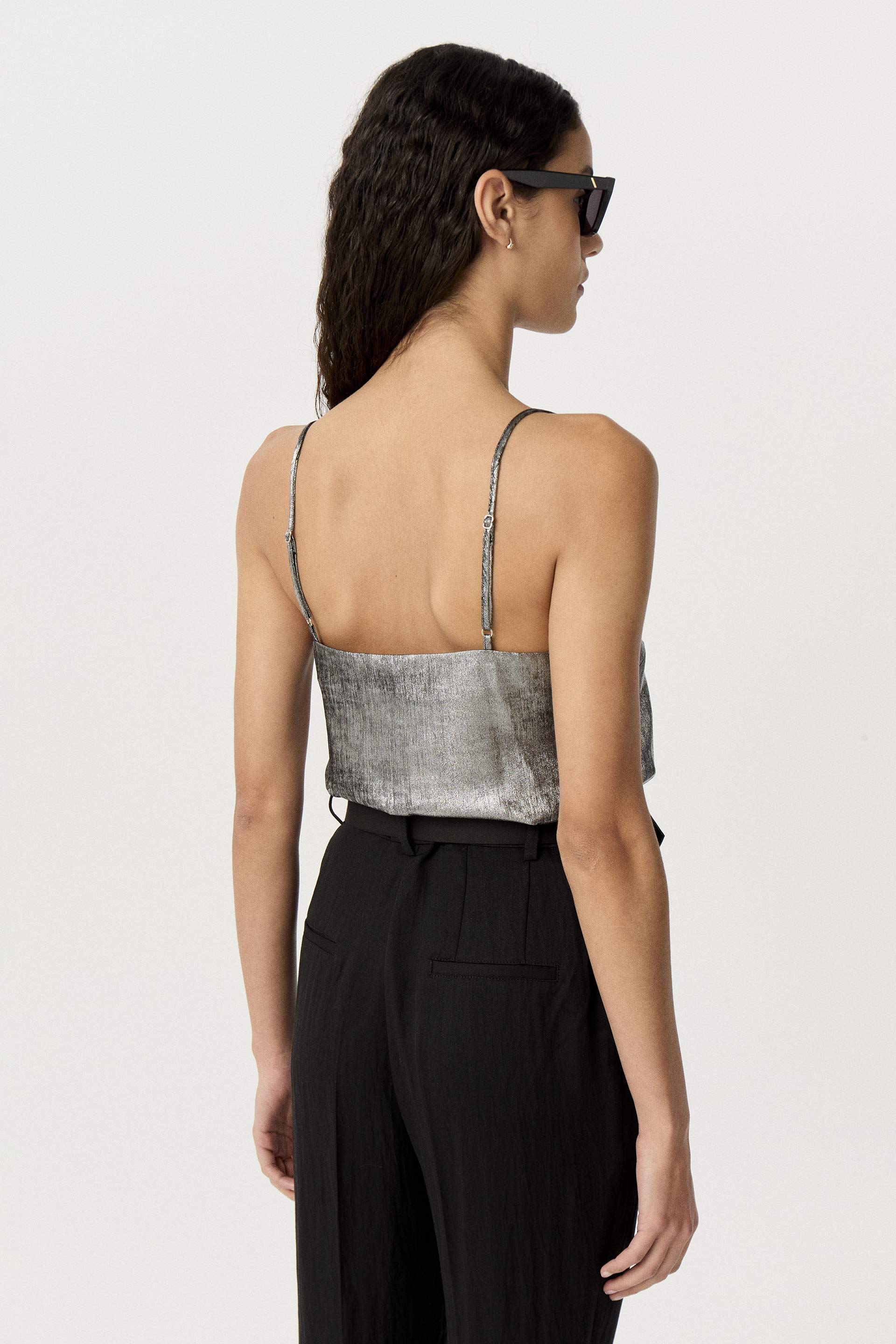 Top en lamé de calce relajado. Posee pinzas de busto, breteles regulables y escote en V con puntilla a contratono. Combinalo con un traje negro para un look elegante y con un toque de brillo que no pasa desapercibido.