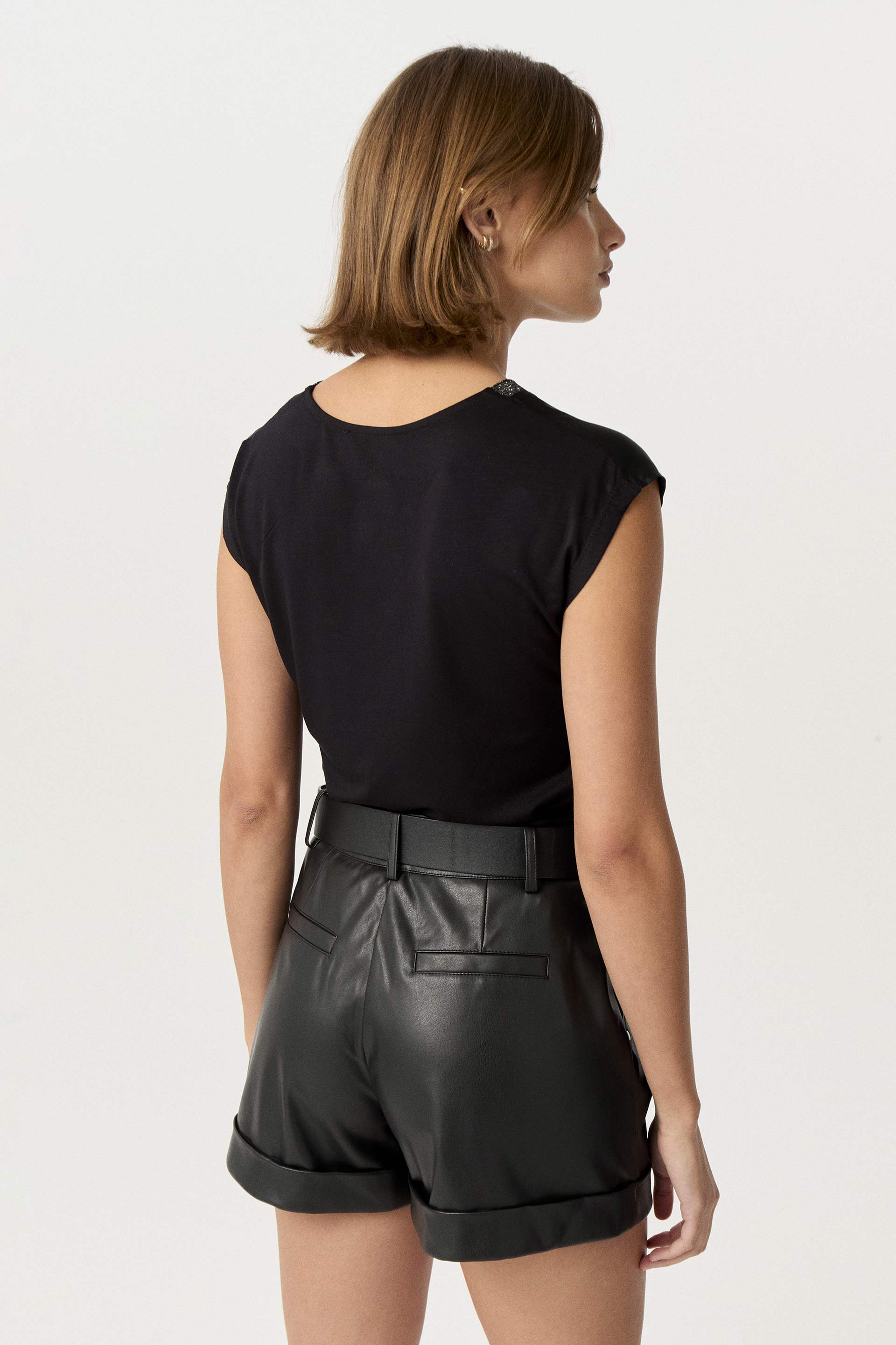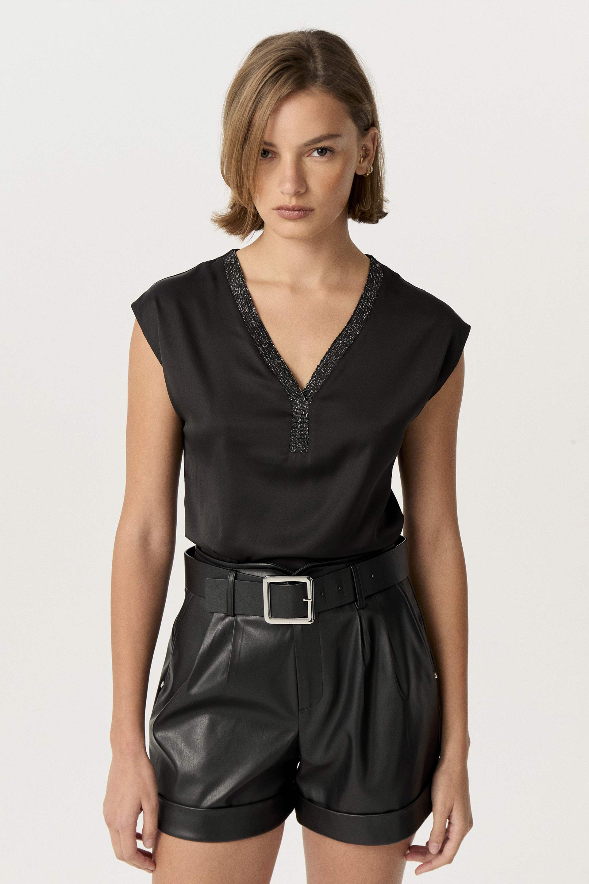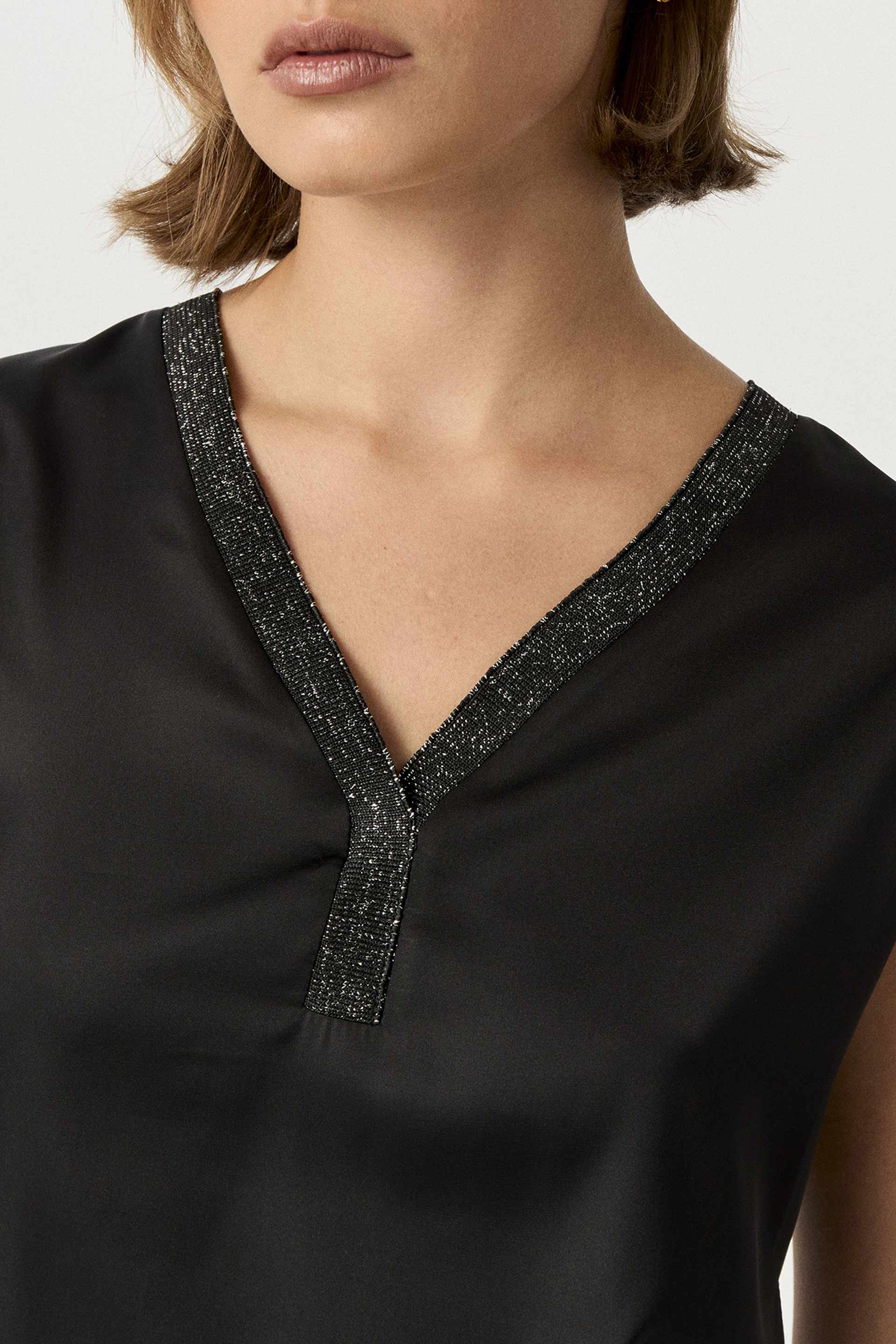 Remera de sedita combinada con viscosa elastizada a tono en espalda. Calce relajado. Escote en V con cuello tejido a tono combinado con lurex. Un básico perfecto para tus looks de oficina.