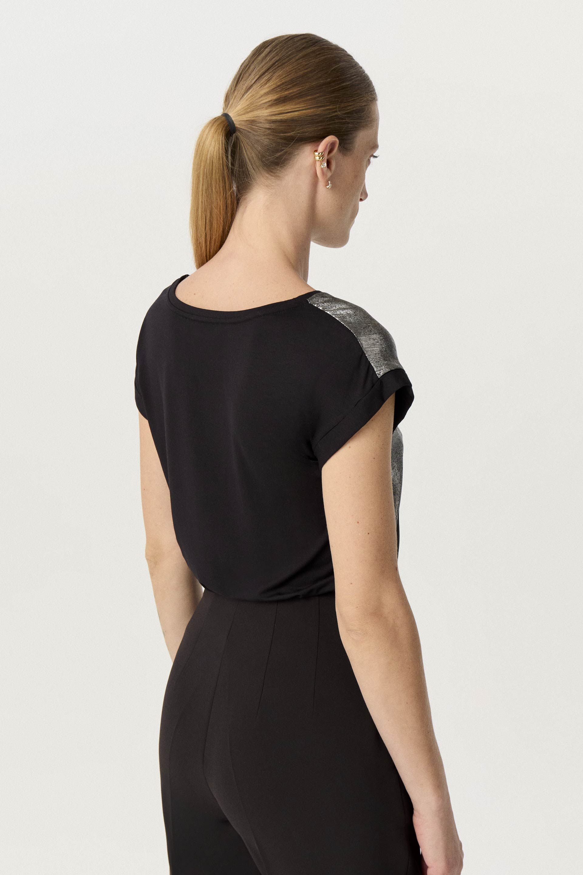 Remera de satén combinada con lamé en delantero y viscosa elastizada en espalda. Calce relajado, escote bote amplio y roll up en mangas. Su diseño irregular y su mix de texturas la convierten en una opción versátil tanto para una salida como para ir a trabajar.