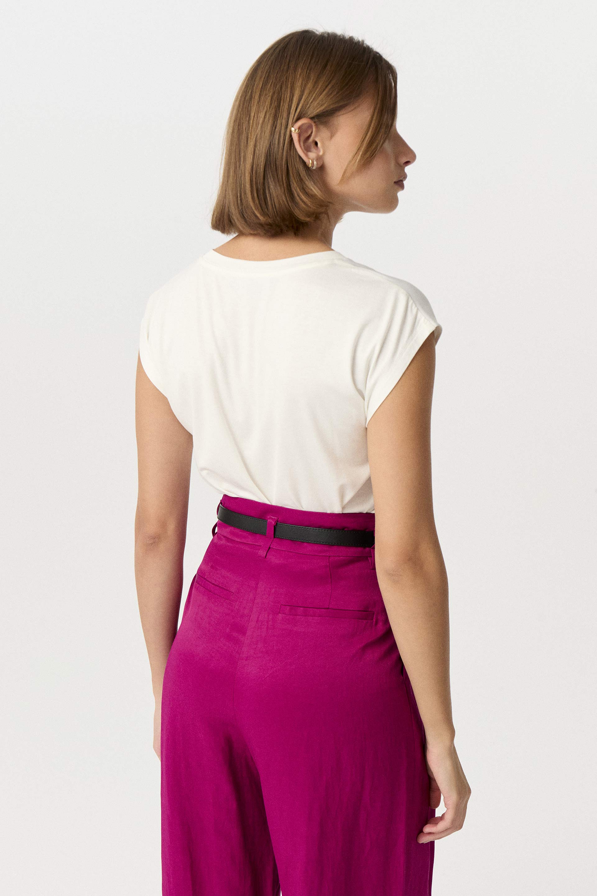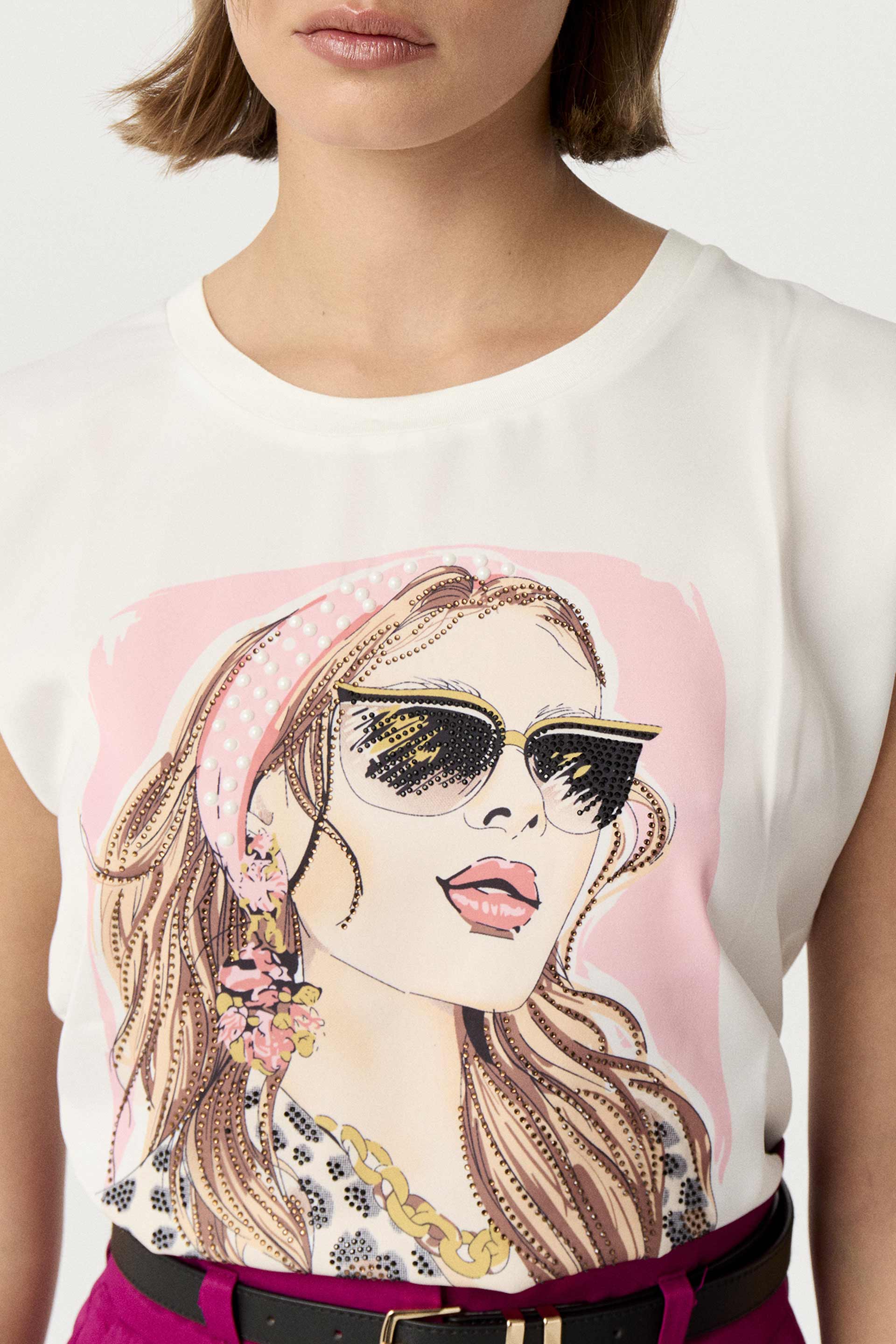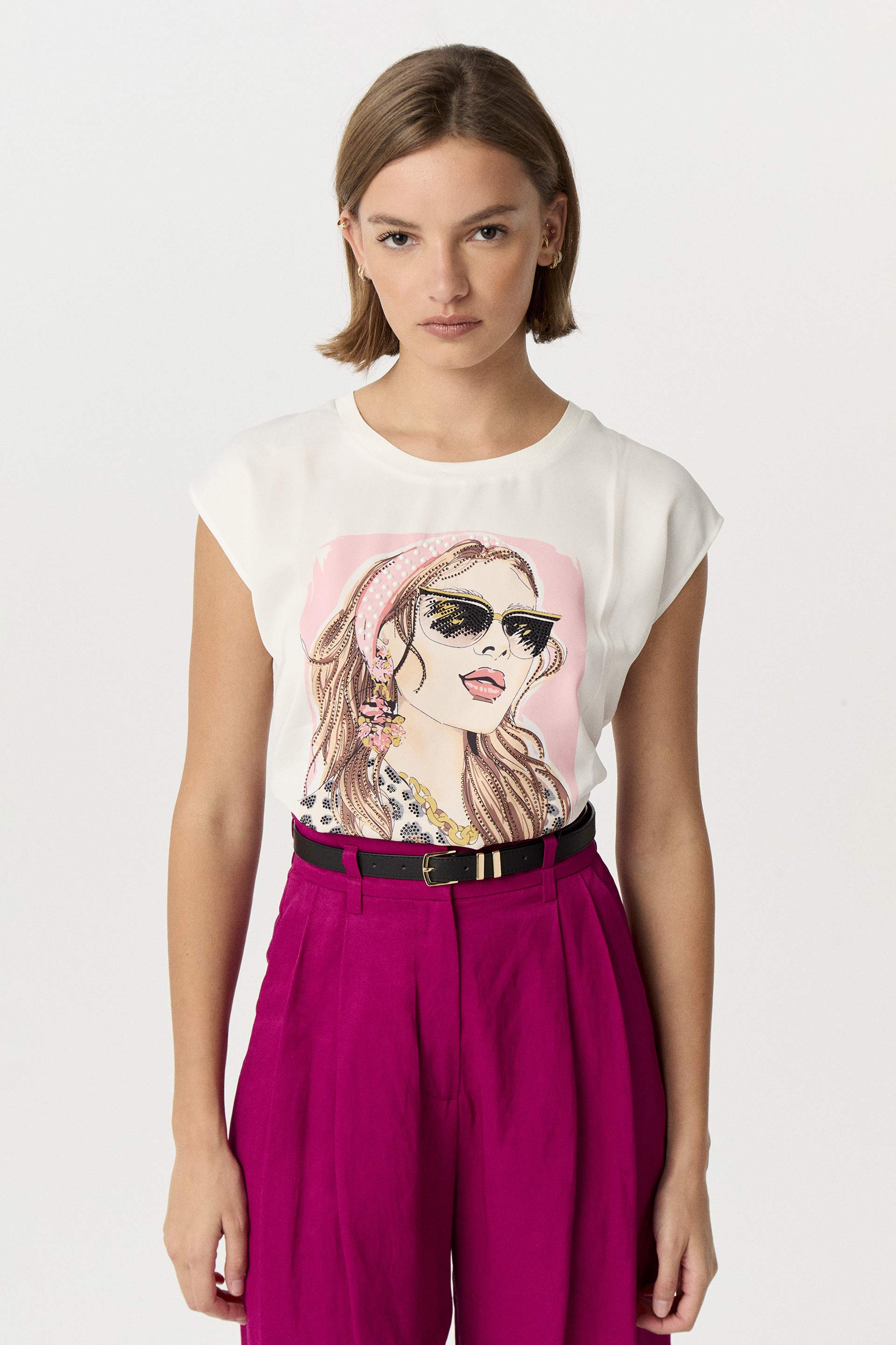 Remera de satén opaco con estampa central con mix de cristales y tachitas termofusionadas en delantero, combinada con viscosa elastizada lisa a tono en espalda. Calce relajado, cuello redondo amplio y hombro caído. Perfecta para sumar textura a tus looks.