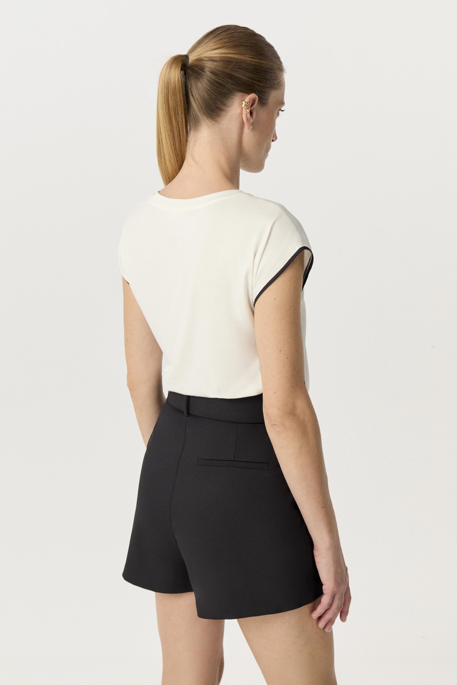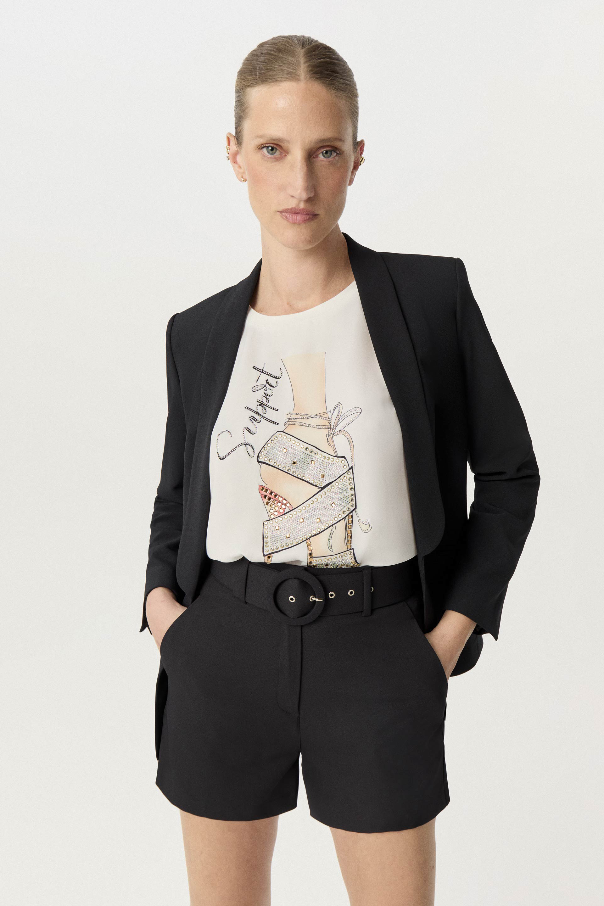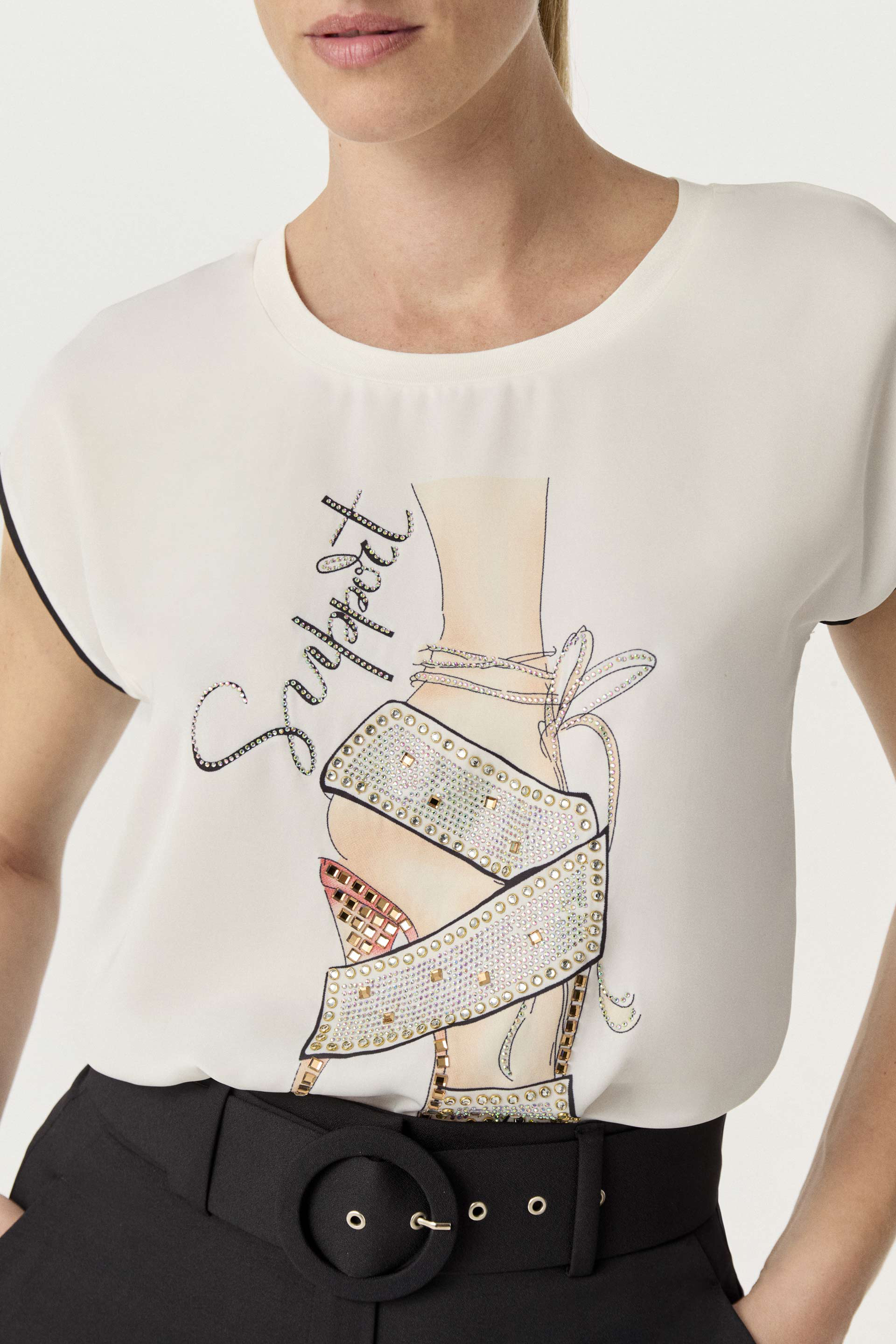 Remera de satén opaco con estampa central con mix de cristales y tachitas termofusionadas en delantero, combinada con viscosa elastizada lisa a tono en espalda. Calce relajado, cuello redondo amplio y hombro caído con terminación de vivos a contratono en sisas. Dale un toque glam a tus looks con este ítem.