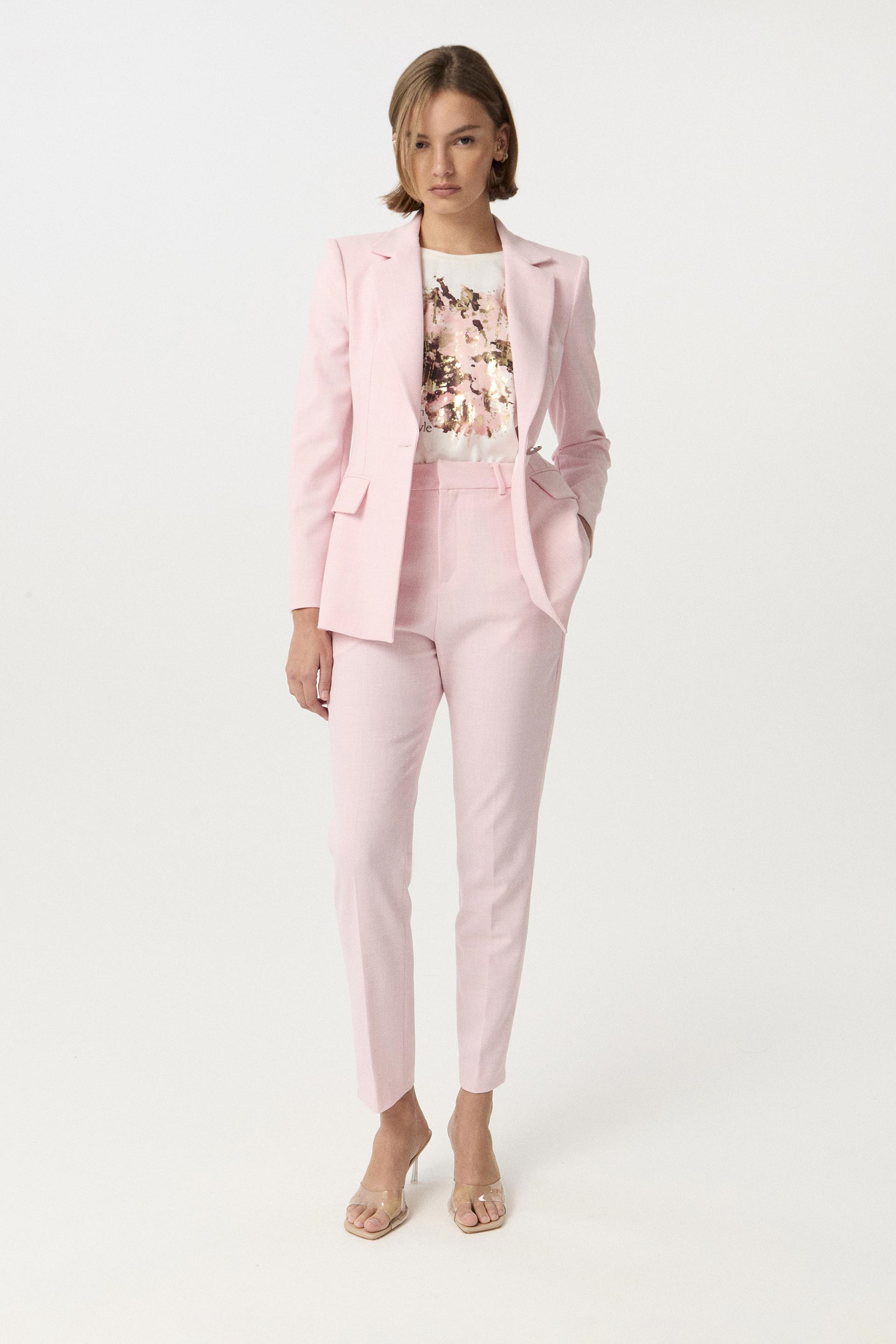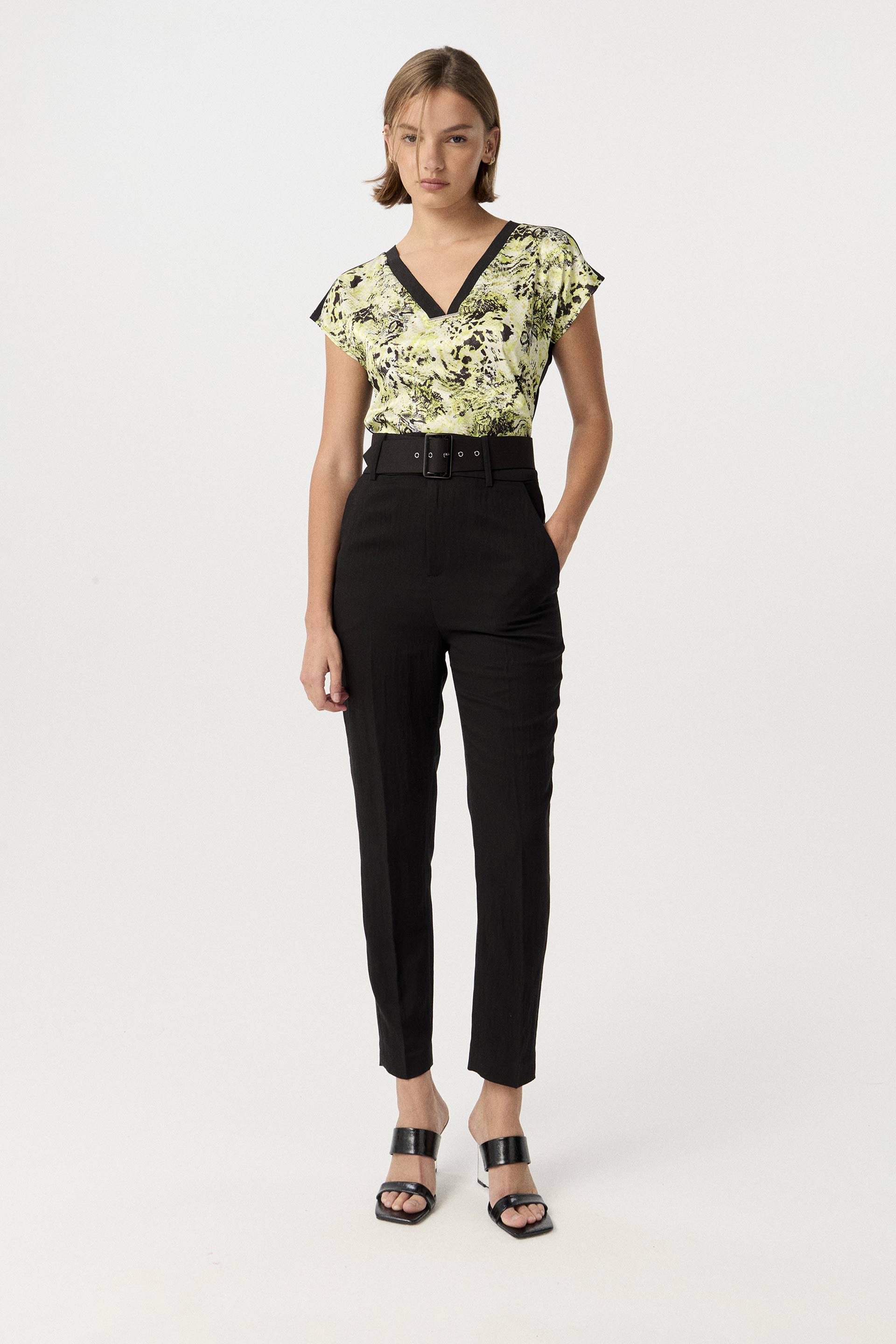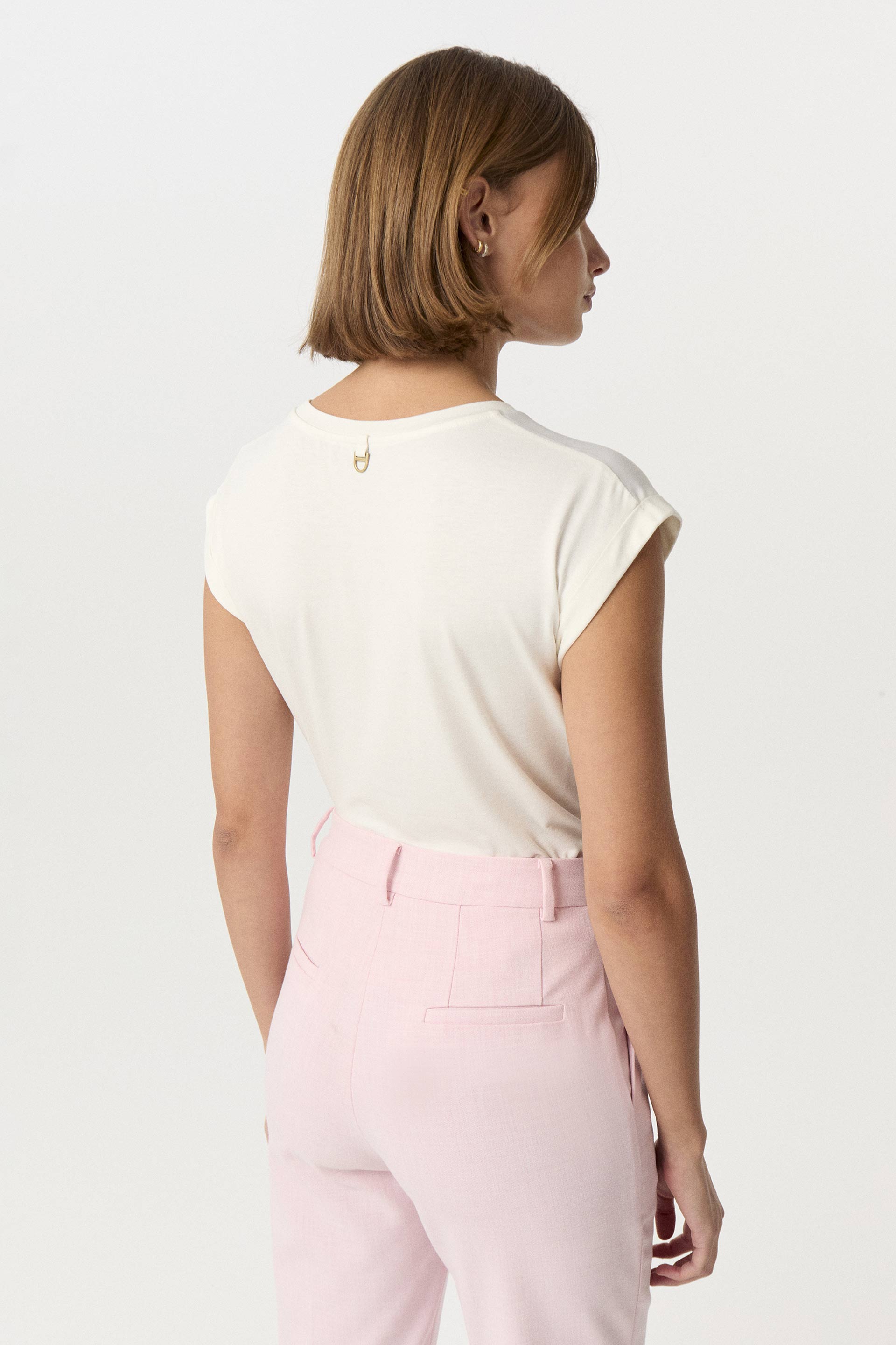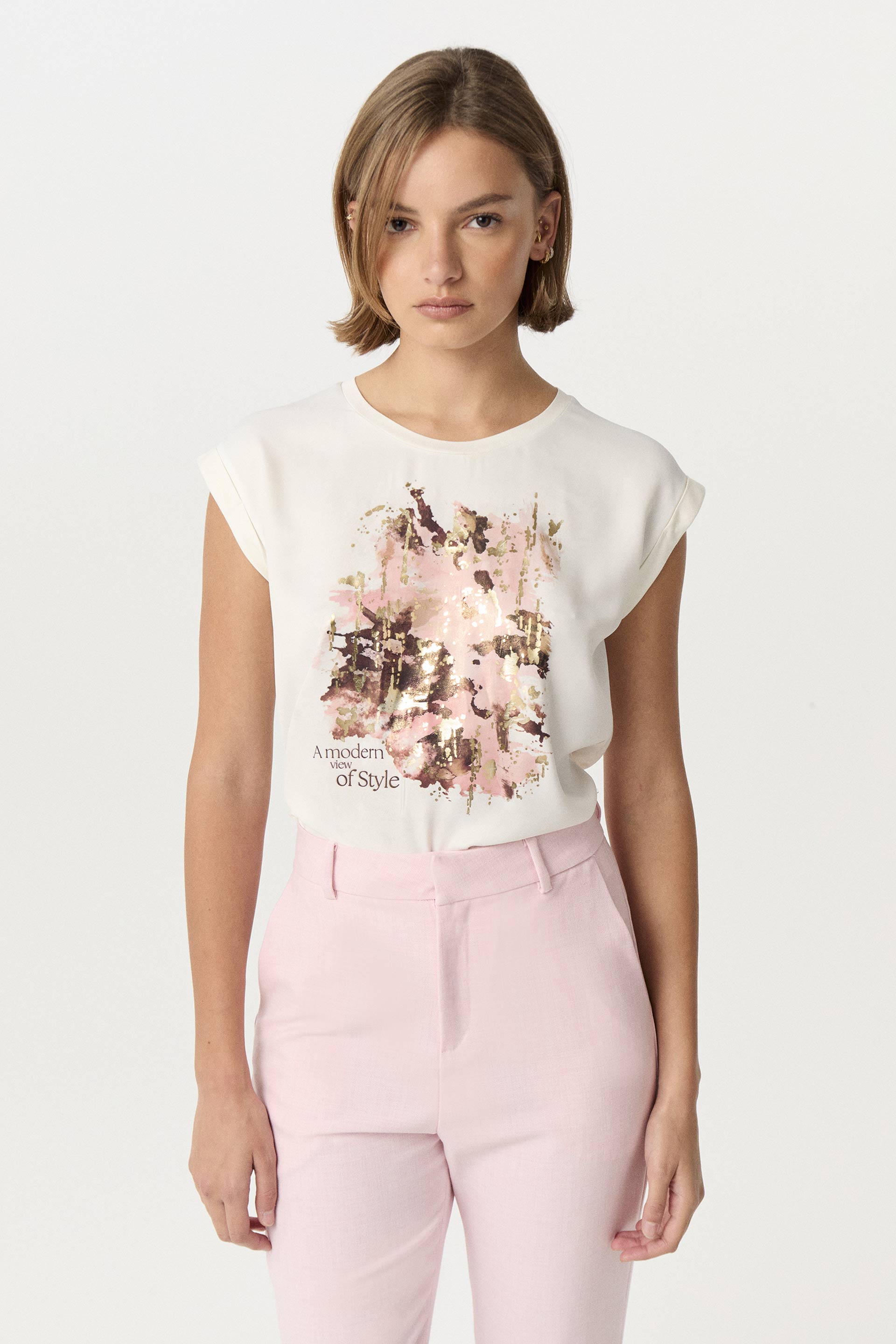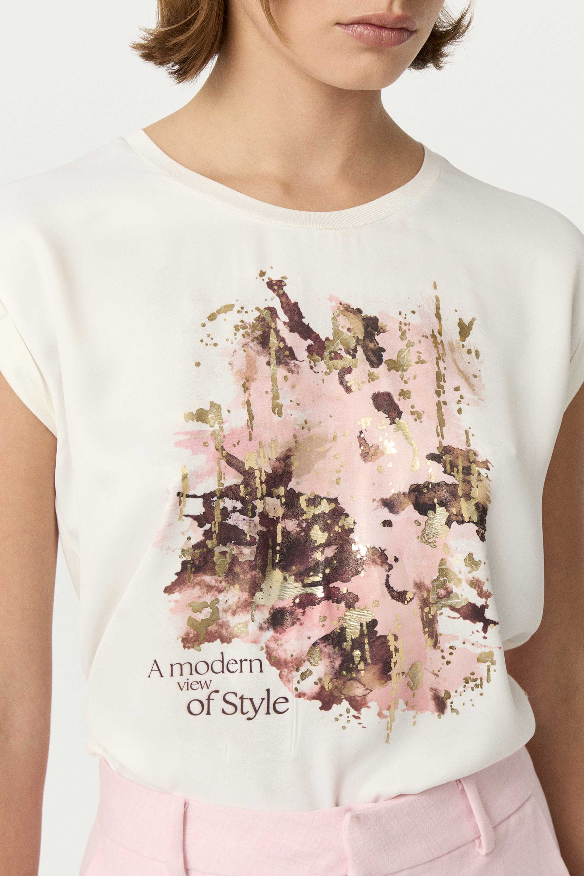 Remera de satén opaco con estampa central con foil, combinada con viscosa elastizada lisa a tono en espalda. Calce relajado, cuello redondo amplio y hombro caído con roll up. Dale un toque descontracturado a un look sastrero sumando este ítem.