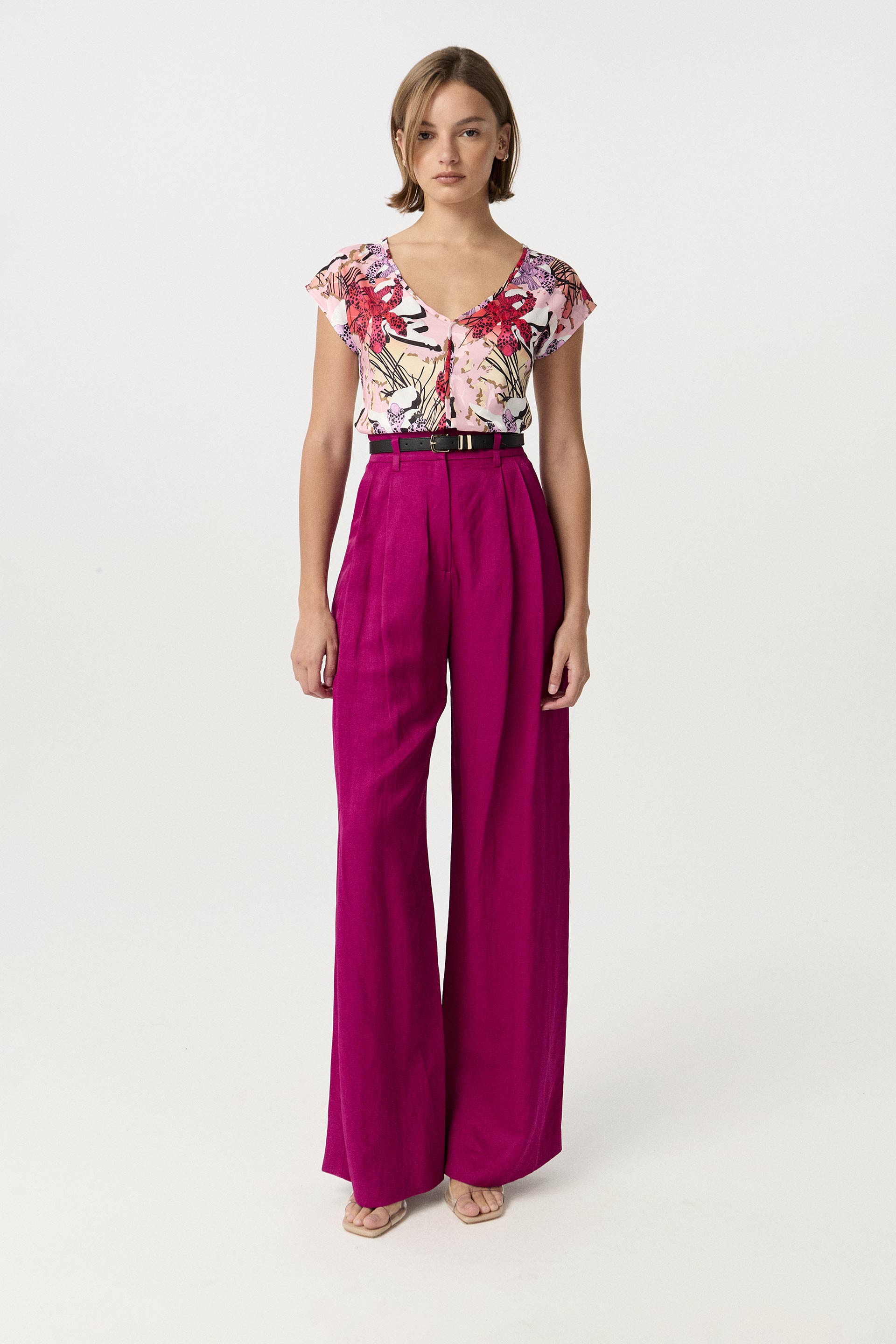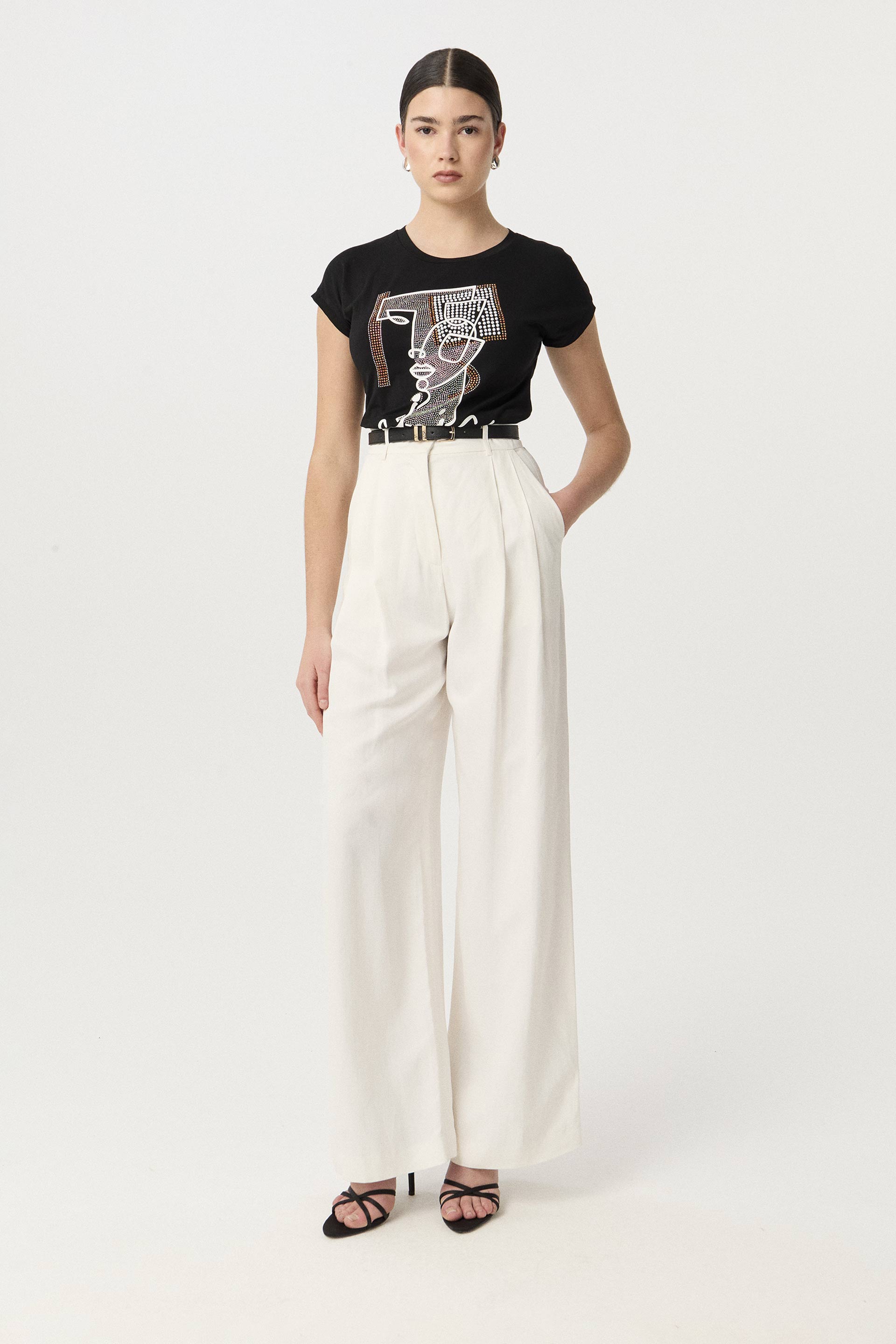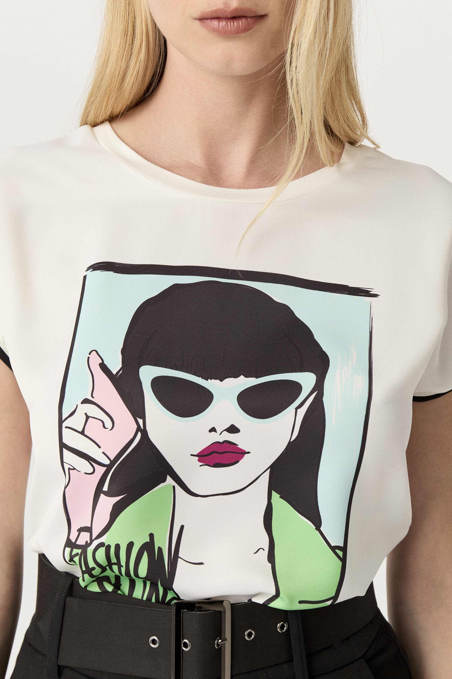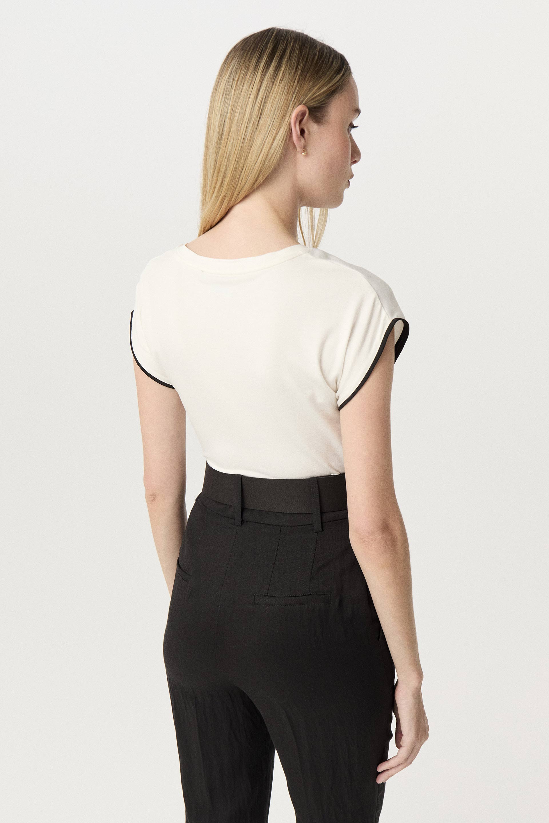 Remera de satén opaco con estampa central, combinada con viscosa elastizada a tono en espalda. Calce relajado, cuello redondo y hombros caídos con terminación de vivo a contratono. Ideal para sumar un toque moderno a un conjunto sastrero.