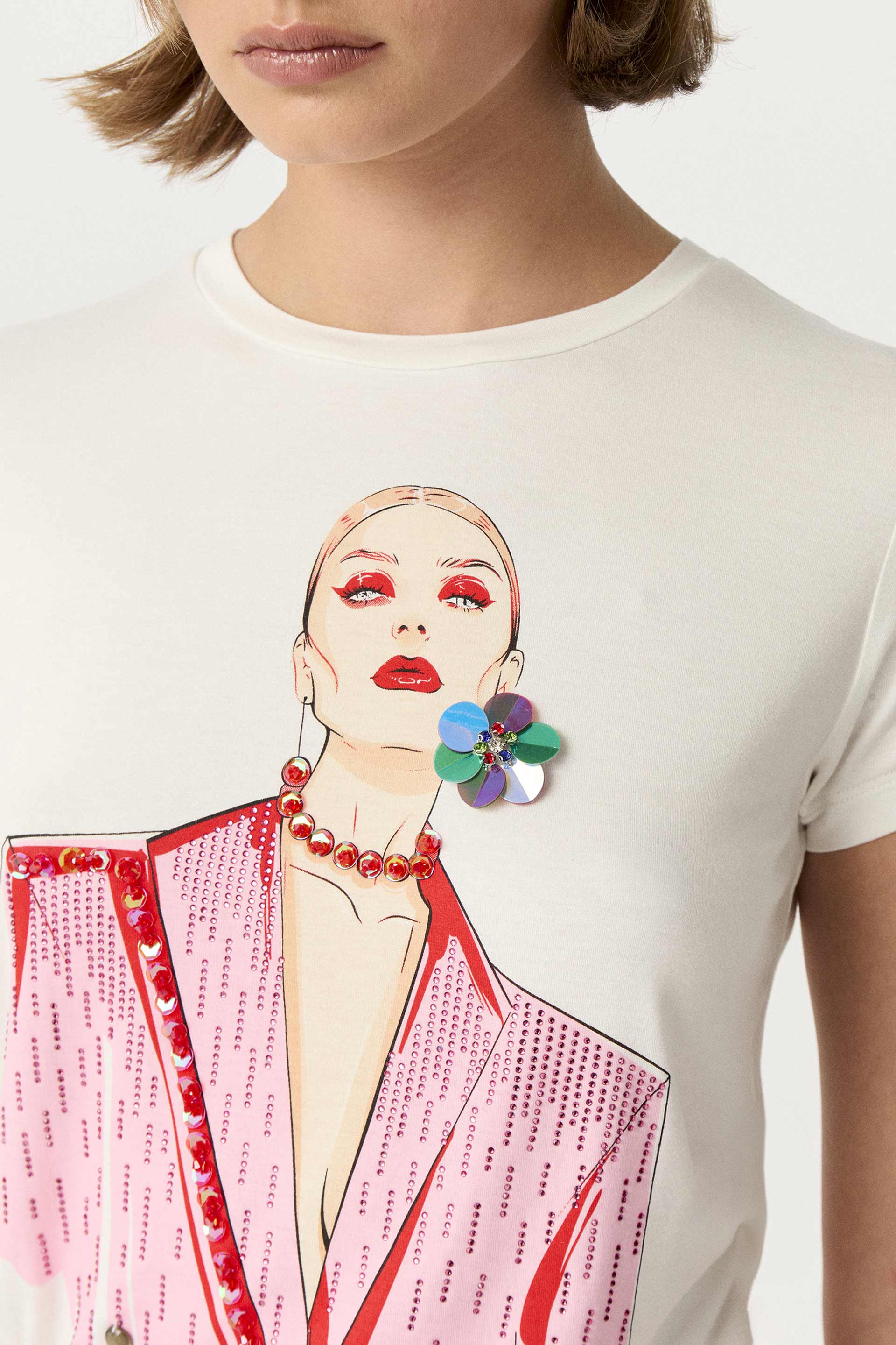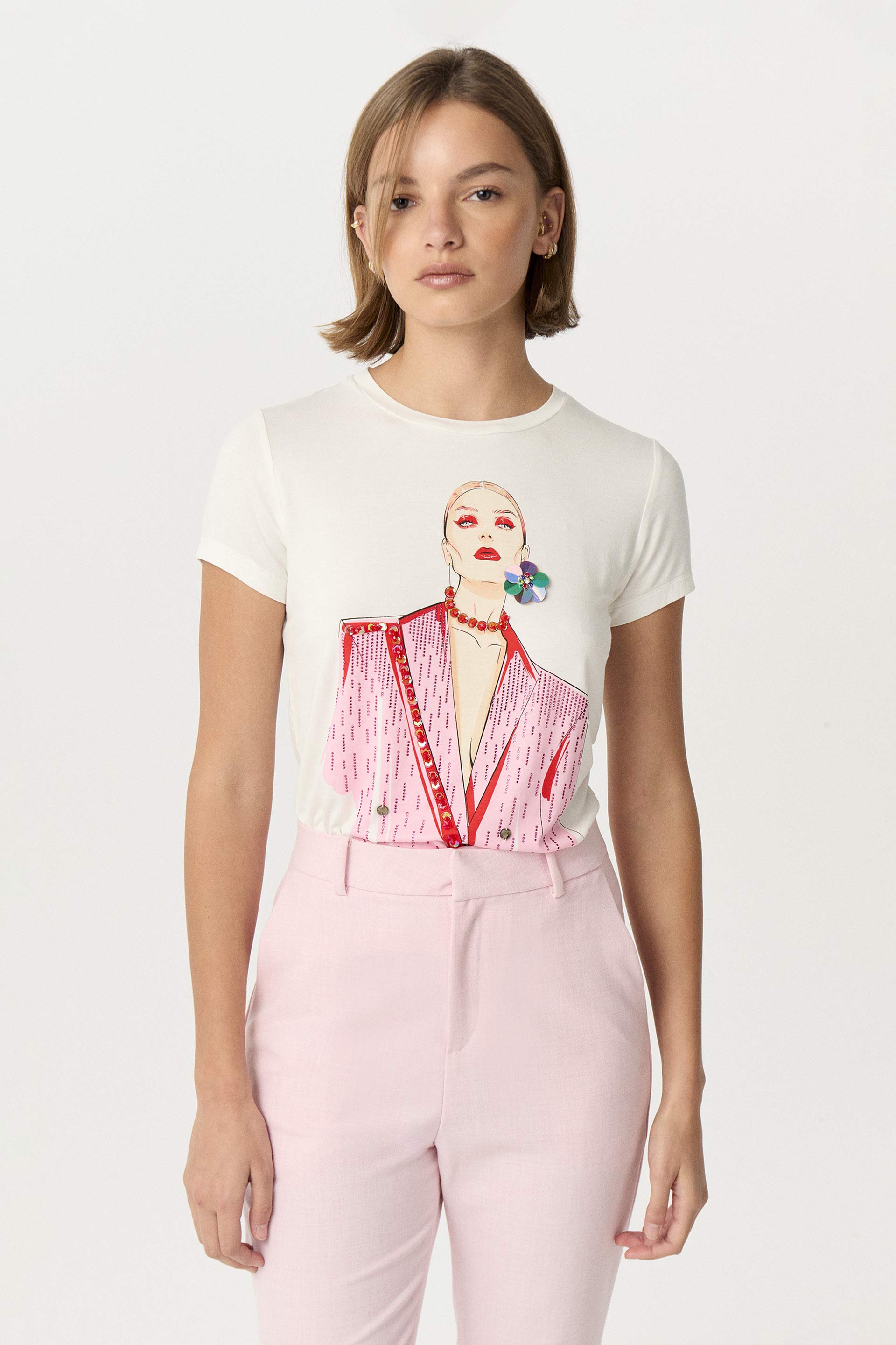 Remera de viscosa elastizada, de calce al cuerpo y manga corta. Escote redondo a la base y estampa central con cristales termofusionados y aplique a tono. Agregá un toque original a cualquier look con esta remera.