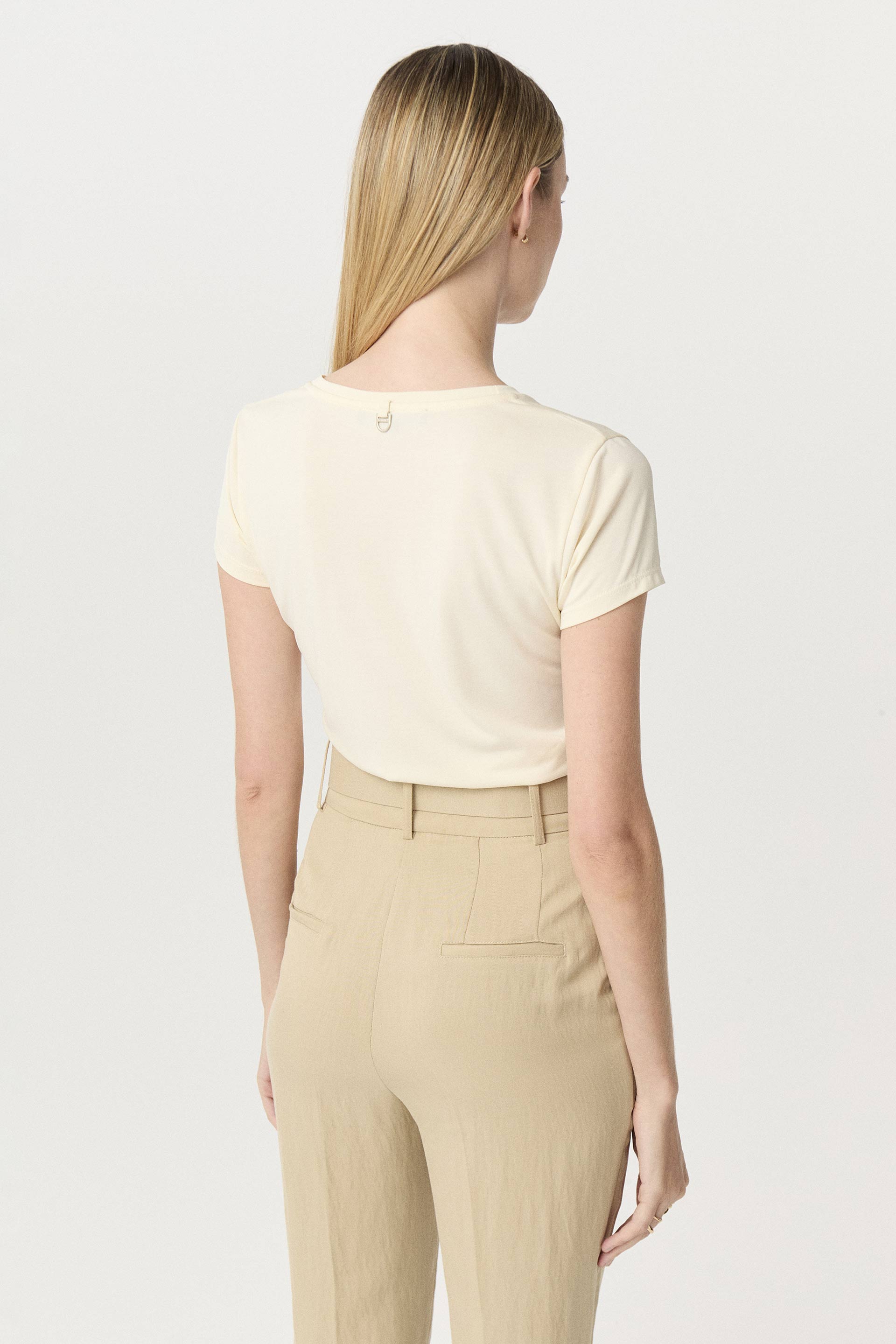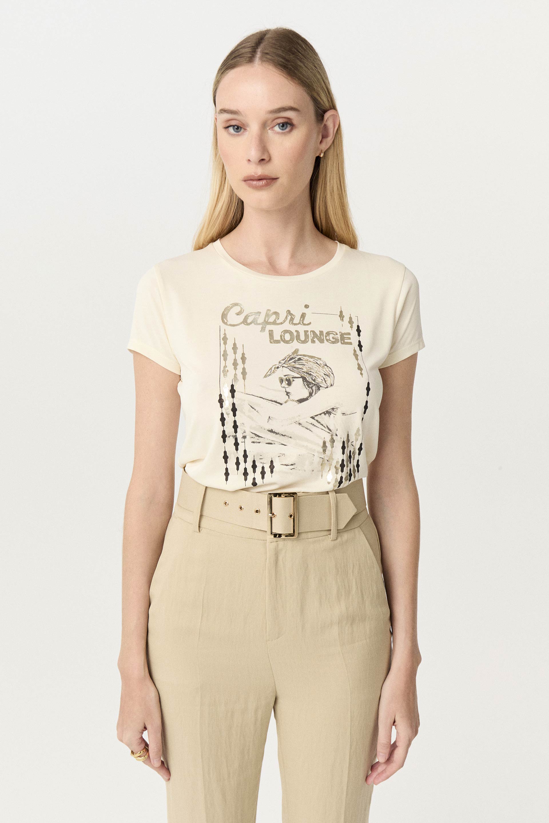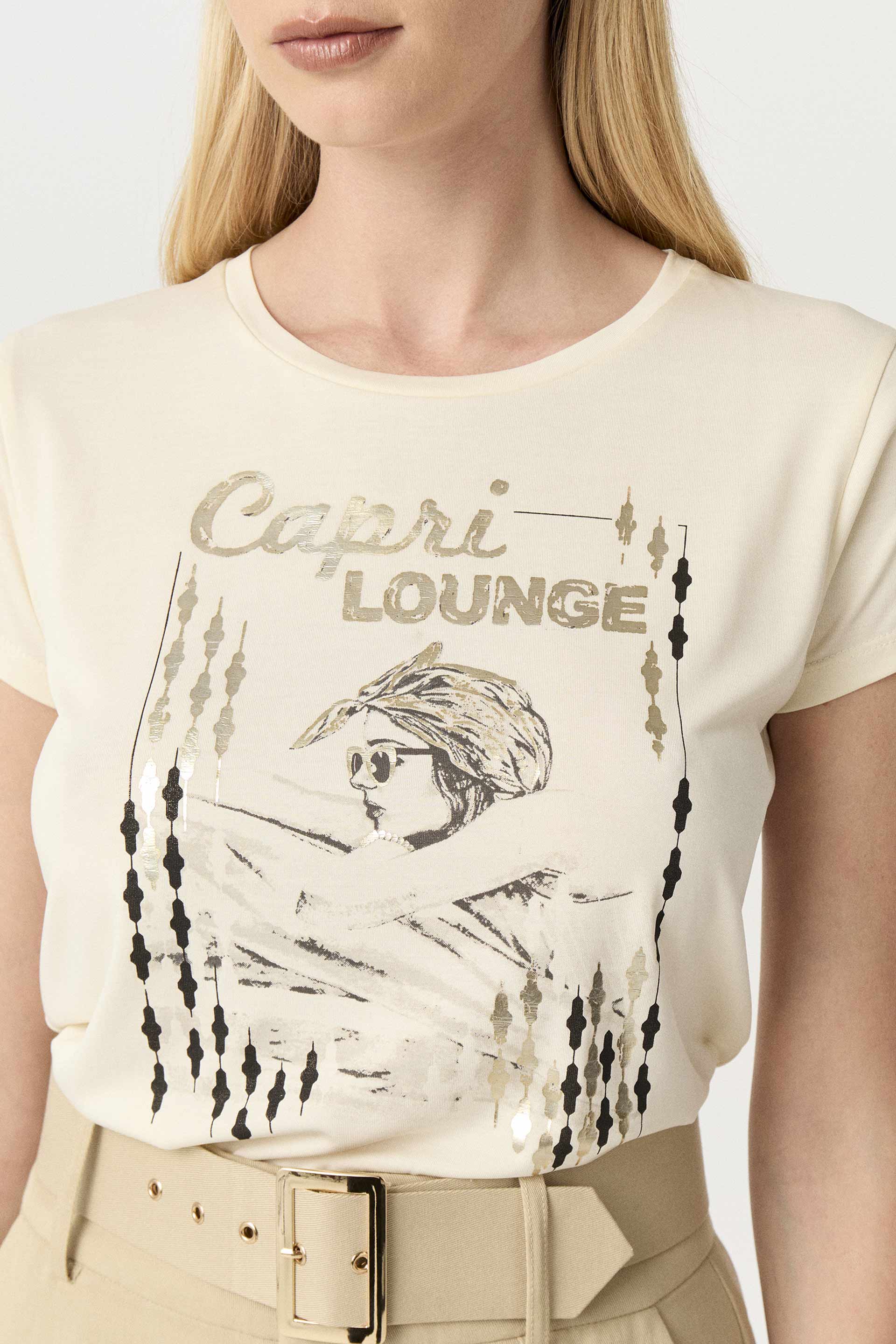 Remera de símil cupro, de calce al cuerpo y manga corta. Escote redondo a la base y estampa central con foil. Agregá un toque original a cualquier look sastrero con esta remera.
