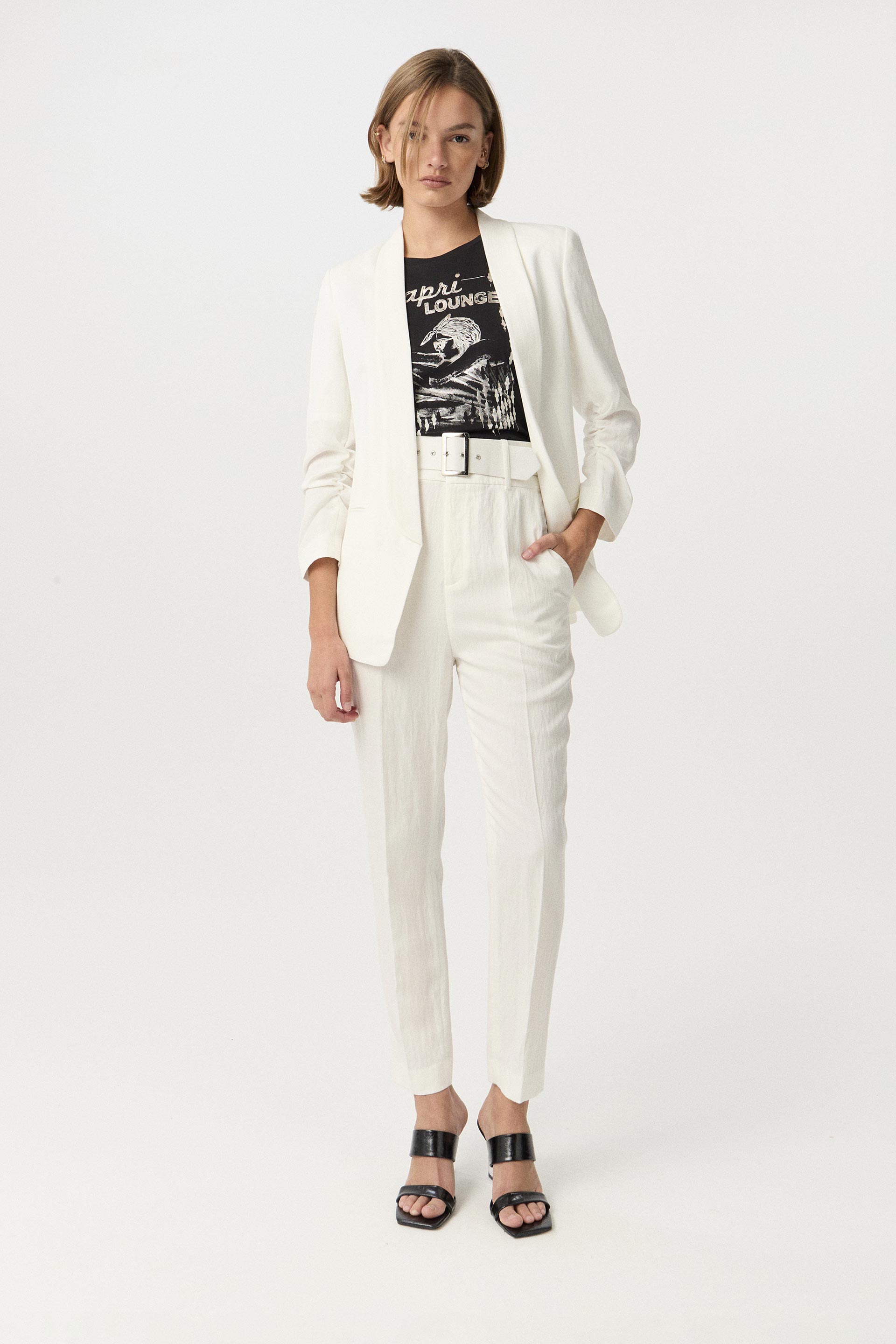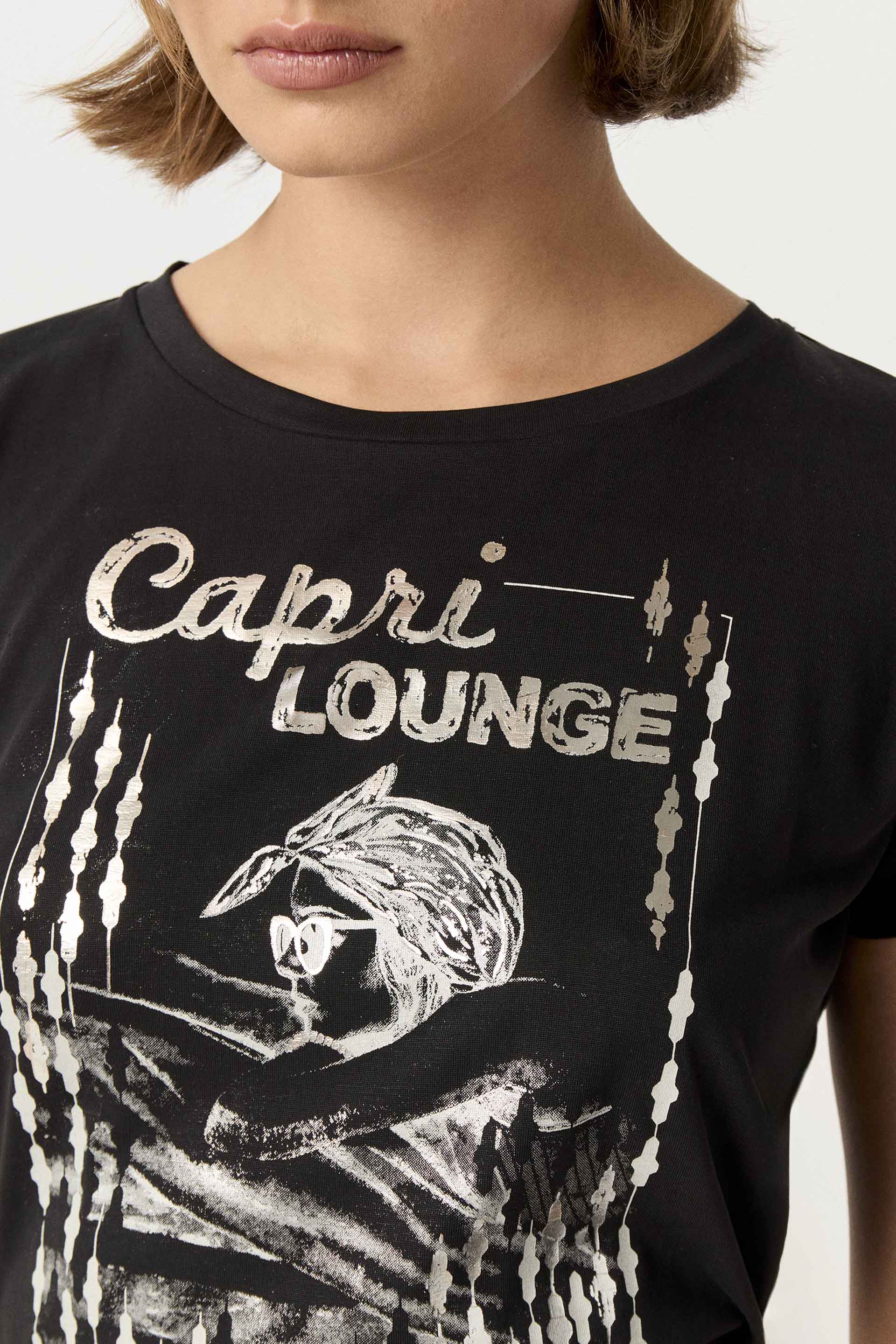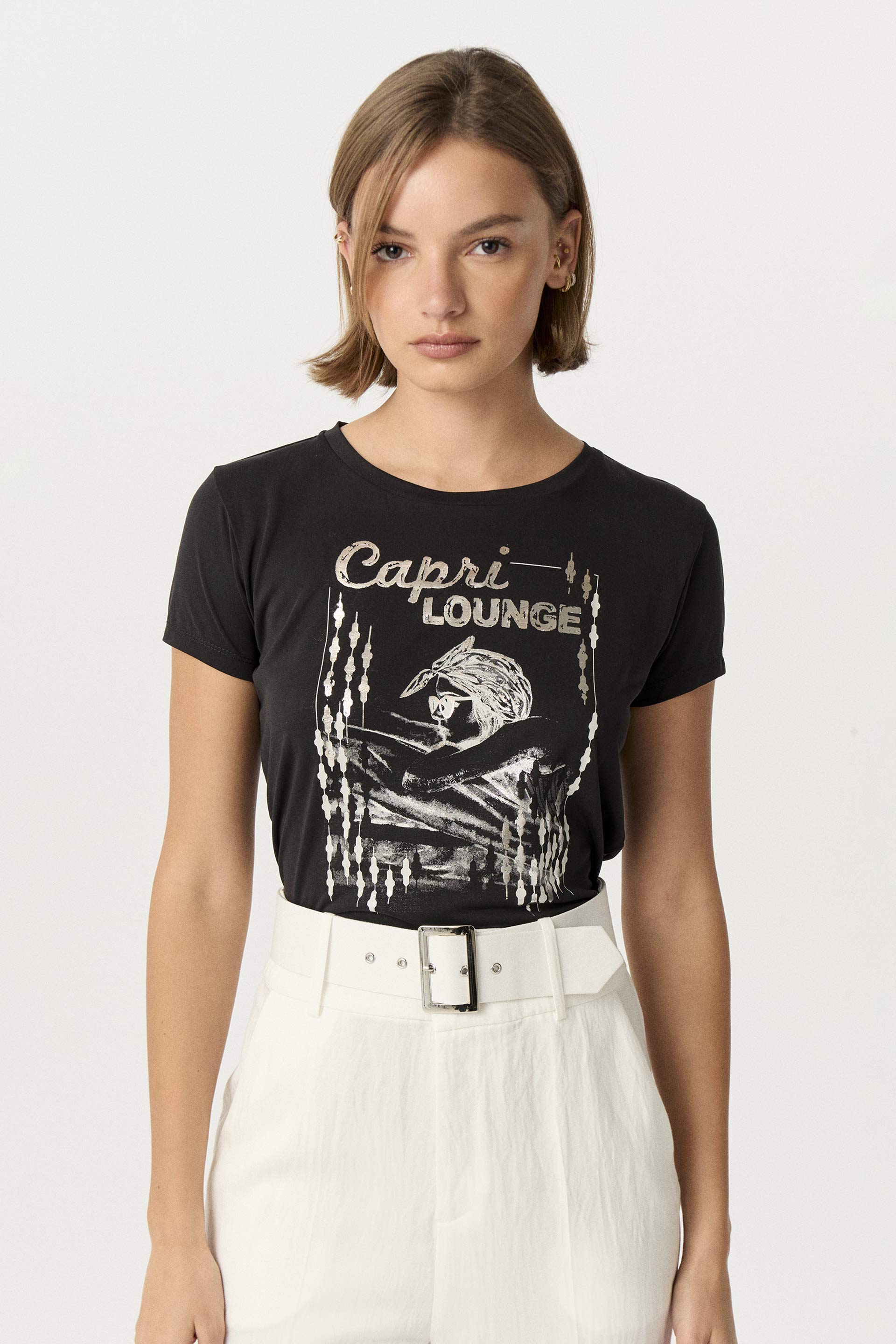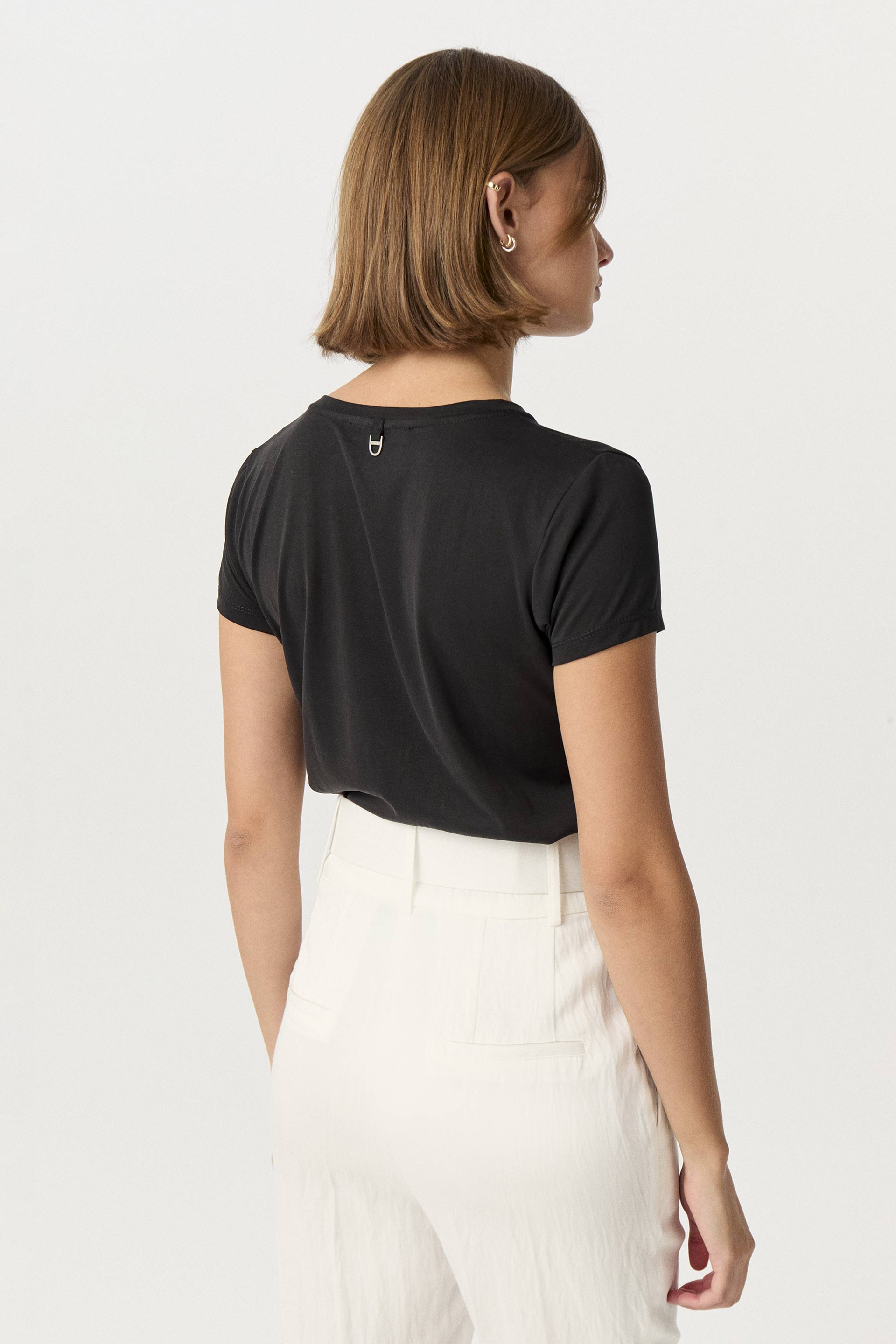 Remera de símil cupro, de calce al cuerpo y manga corta. Escote redondo a la base y estampa central con foil. Agregá un toque original a cualquier look sastrero con esta remera.