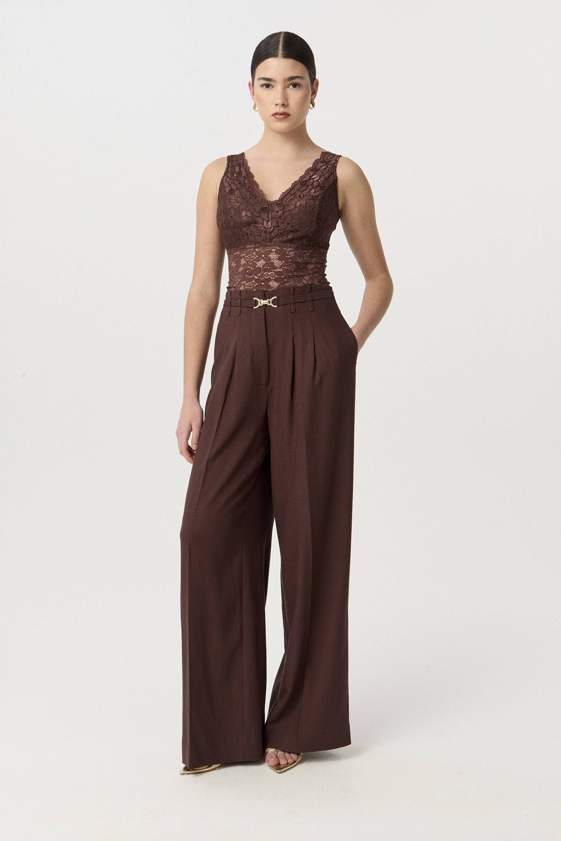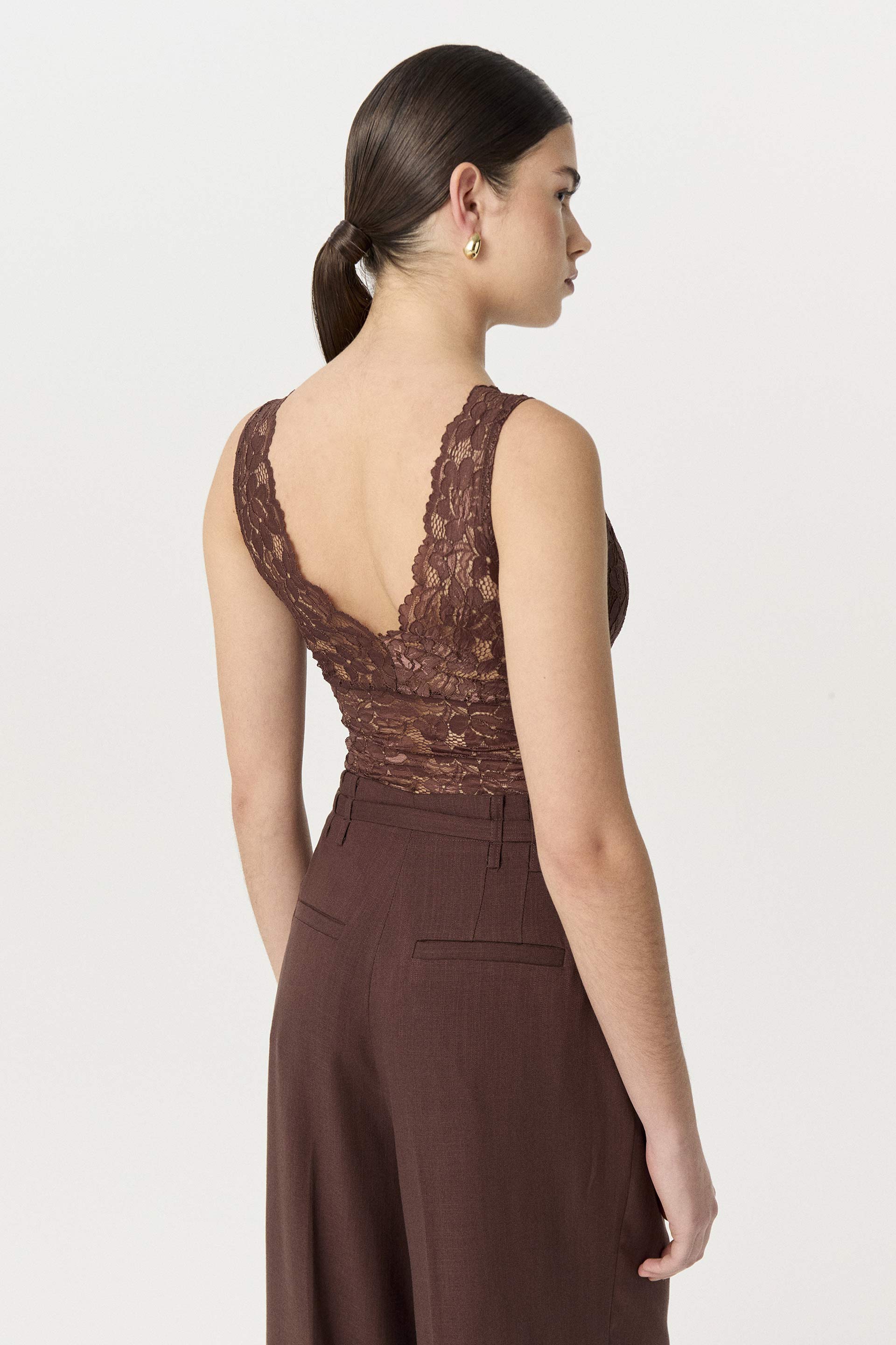 Crop top de encaje elastizado de calce anatómico, con escote en V delantero y espalda. Detalles de puntilla en escote y ruedo. Combinalo con sastrería para darle un toque sensual y sofisticado a tu look.