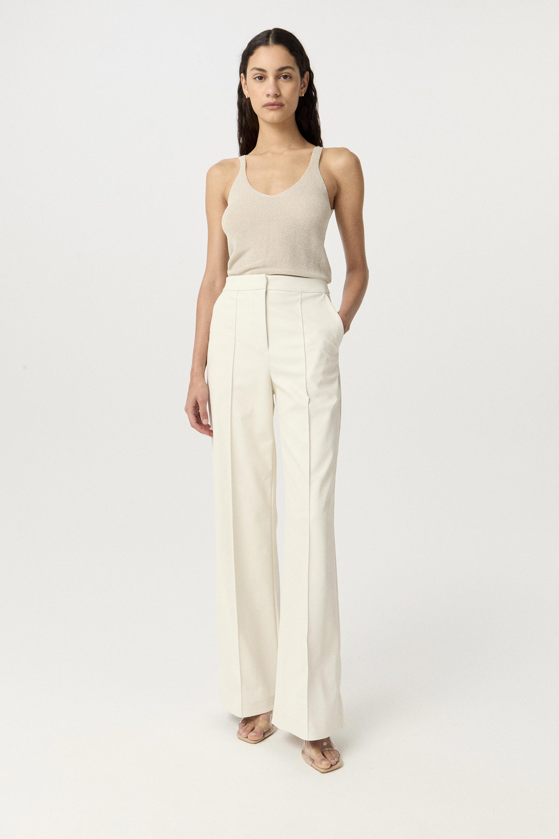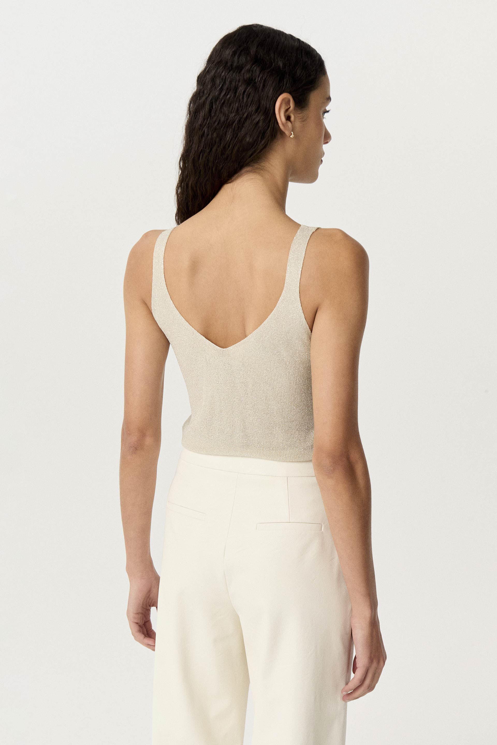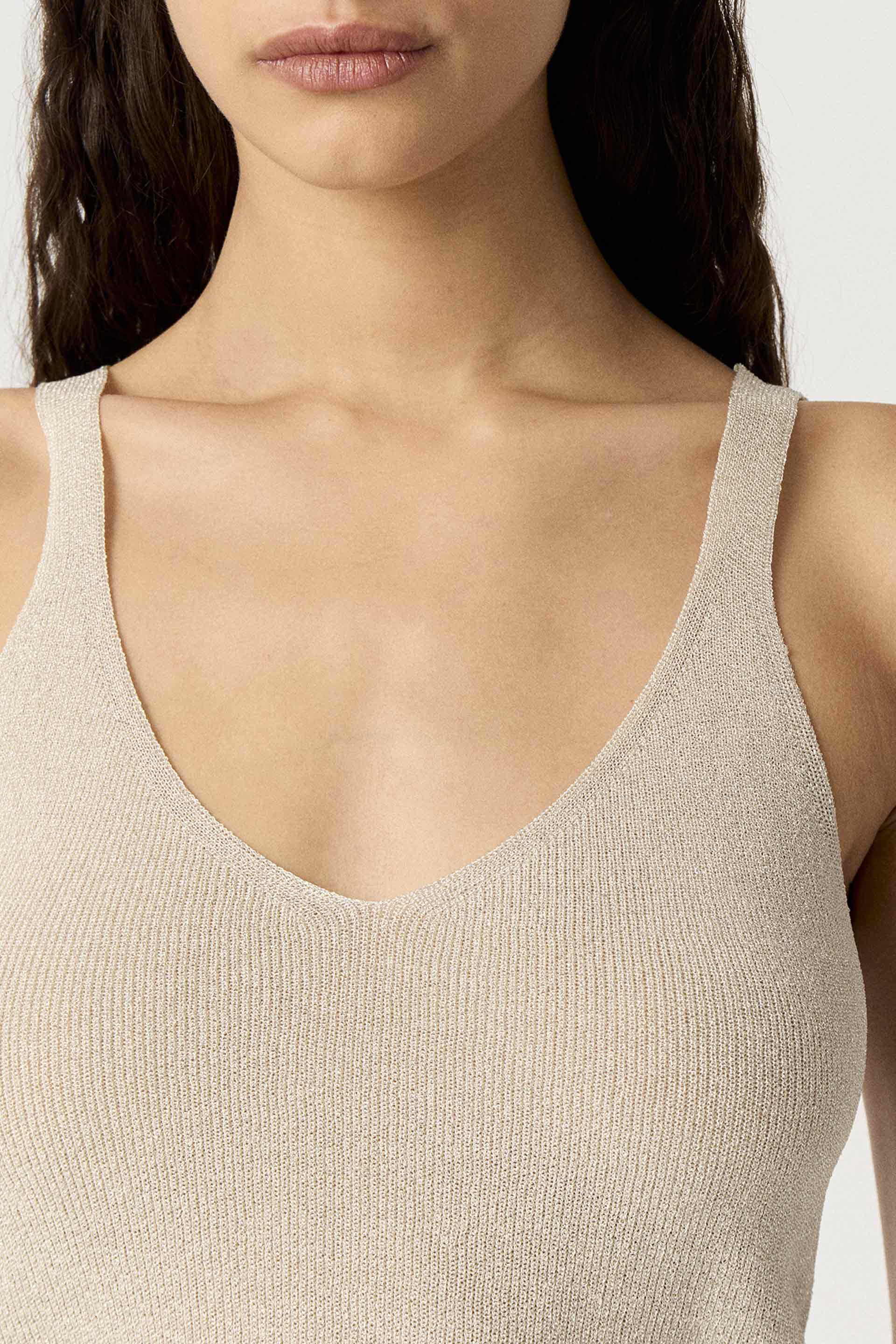 Top tejido en punto liso con lúrex, de calce al cuerpo. Doble escote en V con breteles finos. Liviano, suave y con un brillo sutil, un comodín infaltable para el verano.