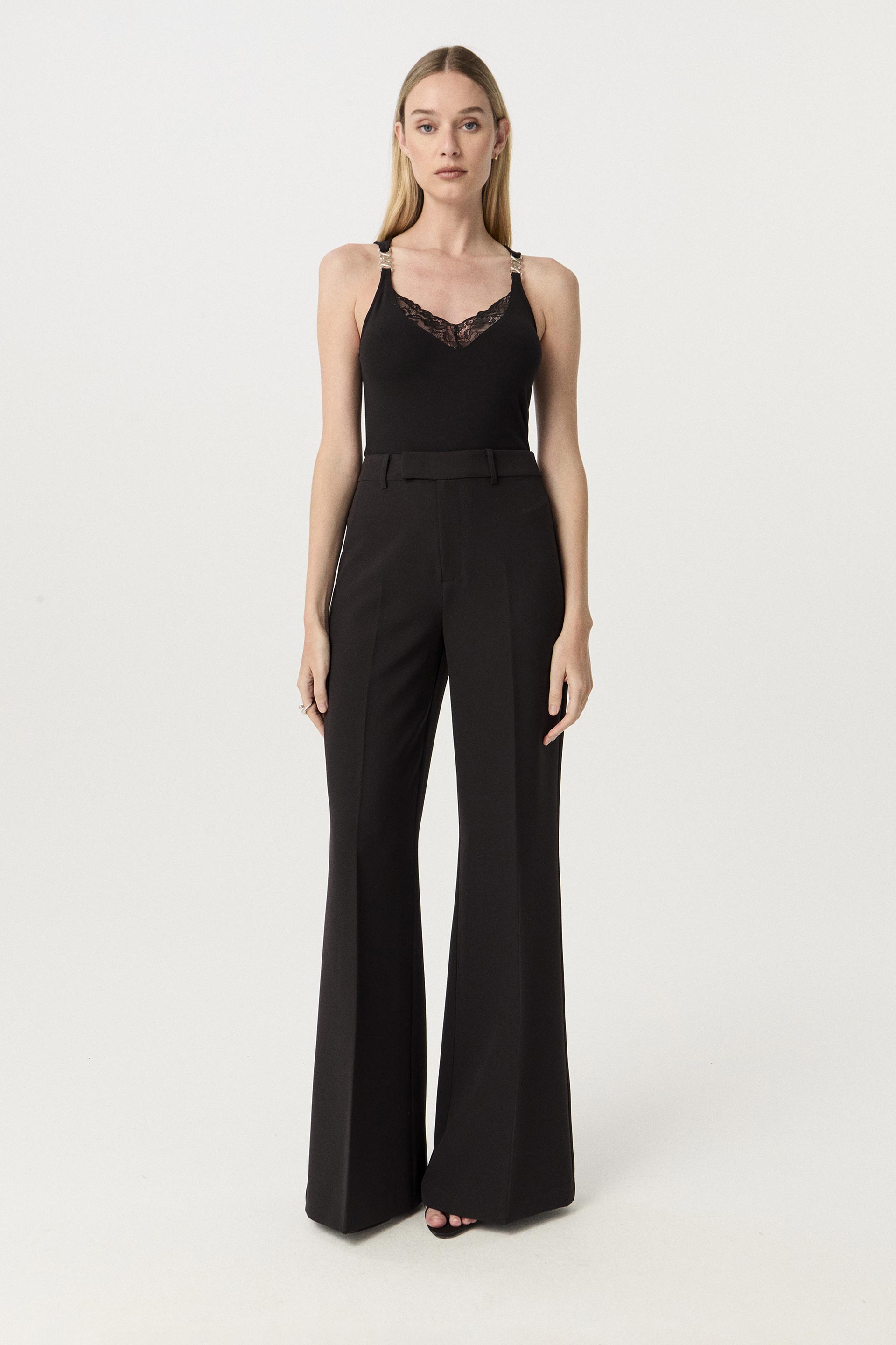 Top de punto tramado de calce anatómico. Escote en V con puntilla a tono y breteles con avío metálico. Un ítem versátil para componer outfits de oficina o para salir.