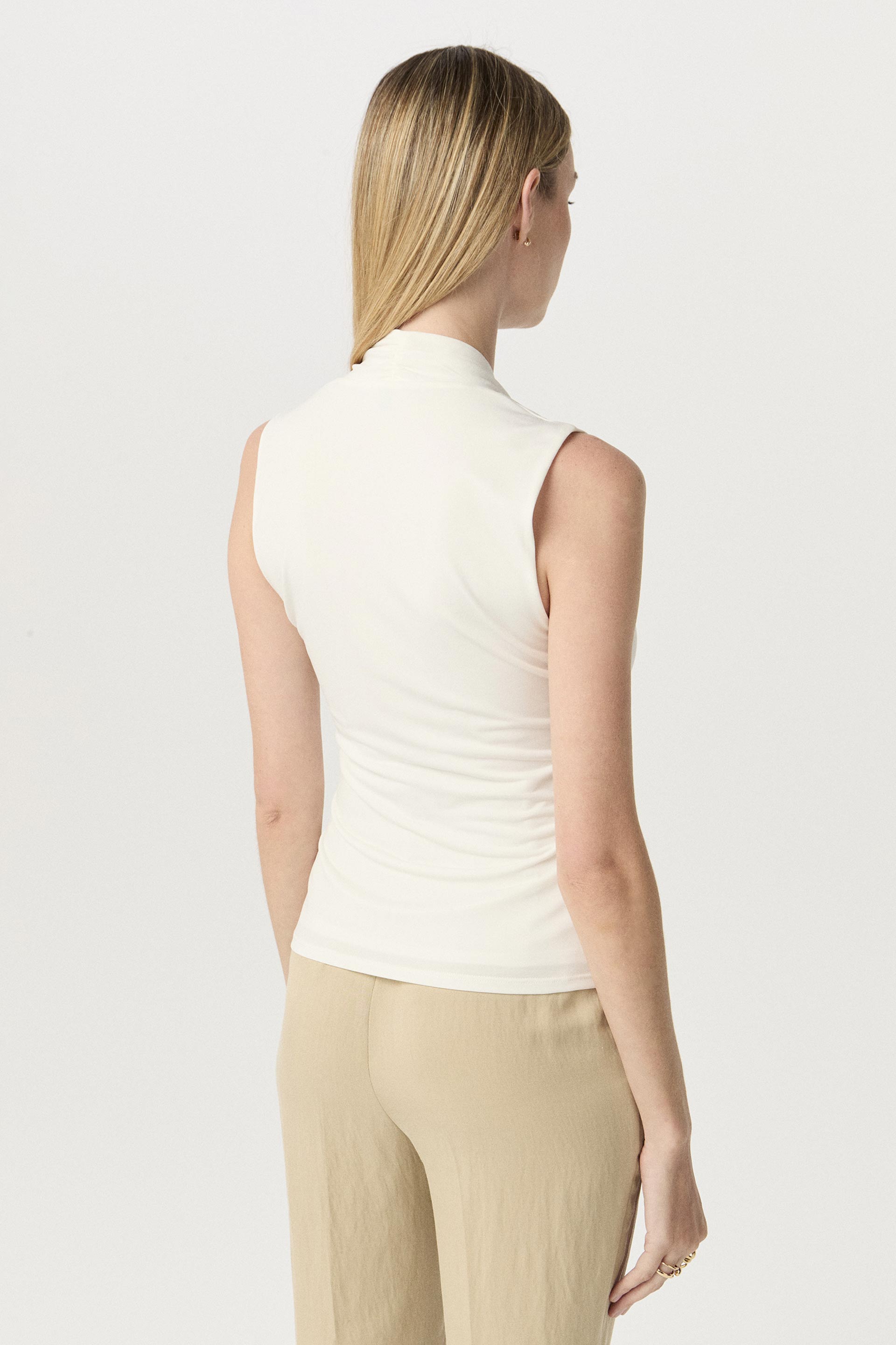 Remera de microfibra de alta torsión y calce al cuerpo. Sin mangas, con delantero cruzado que forma un escote en V y lingote metálico lateral. El ruedo con desnivel suma un detalle distintivo. Una opción original y versátil, ideal tanto para el ámbito profesional como para una salida de noche.