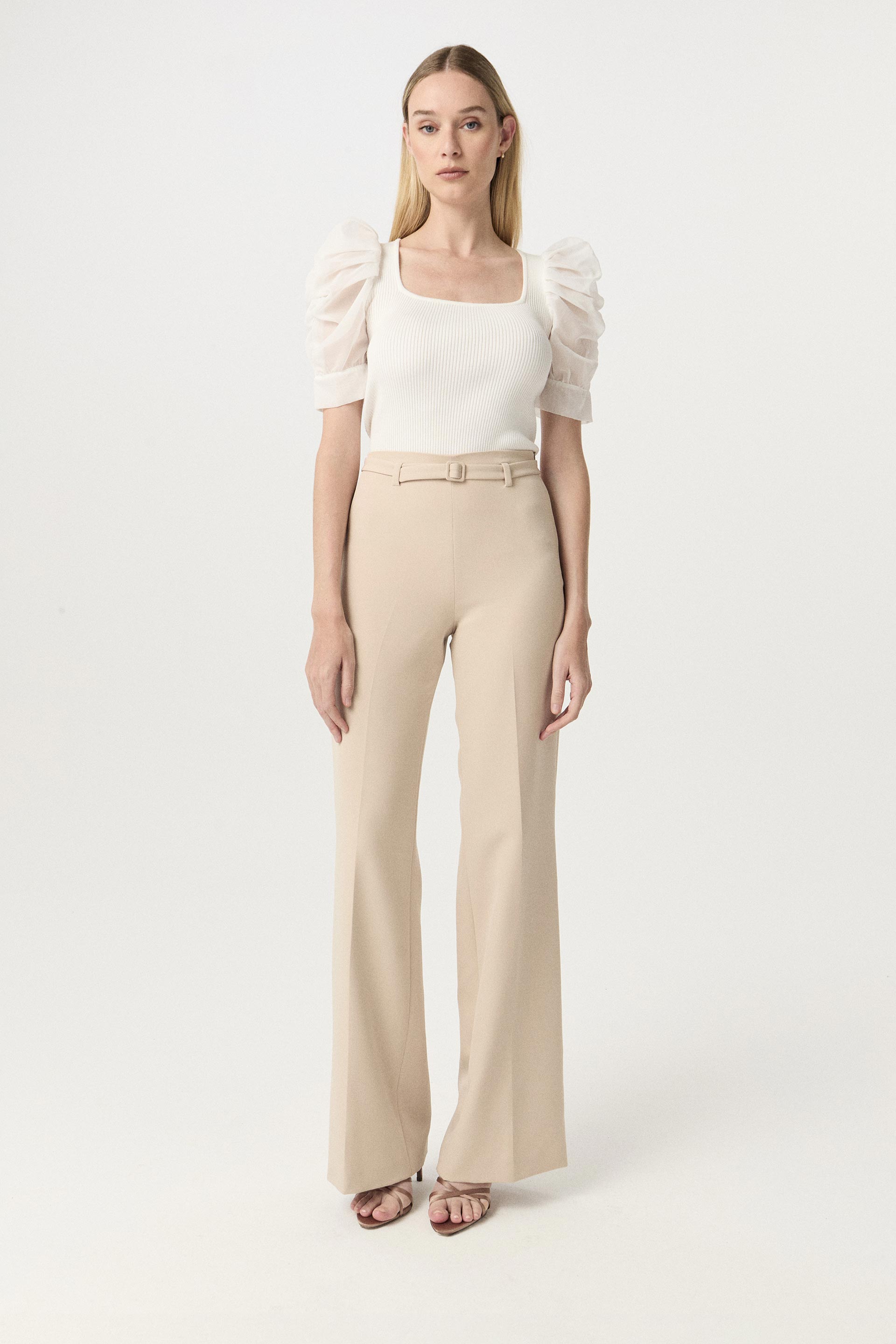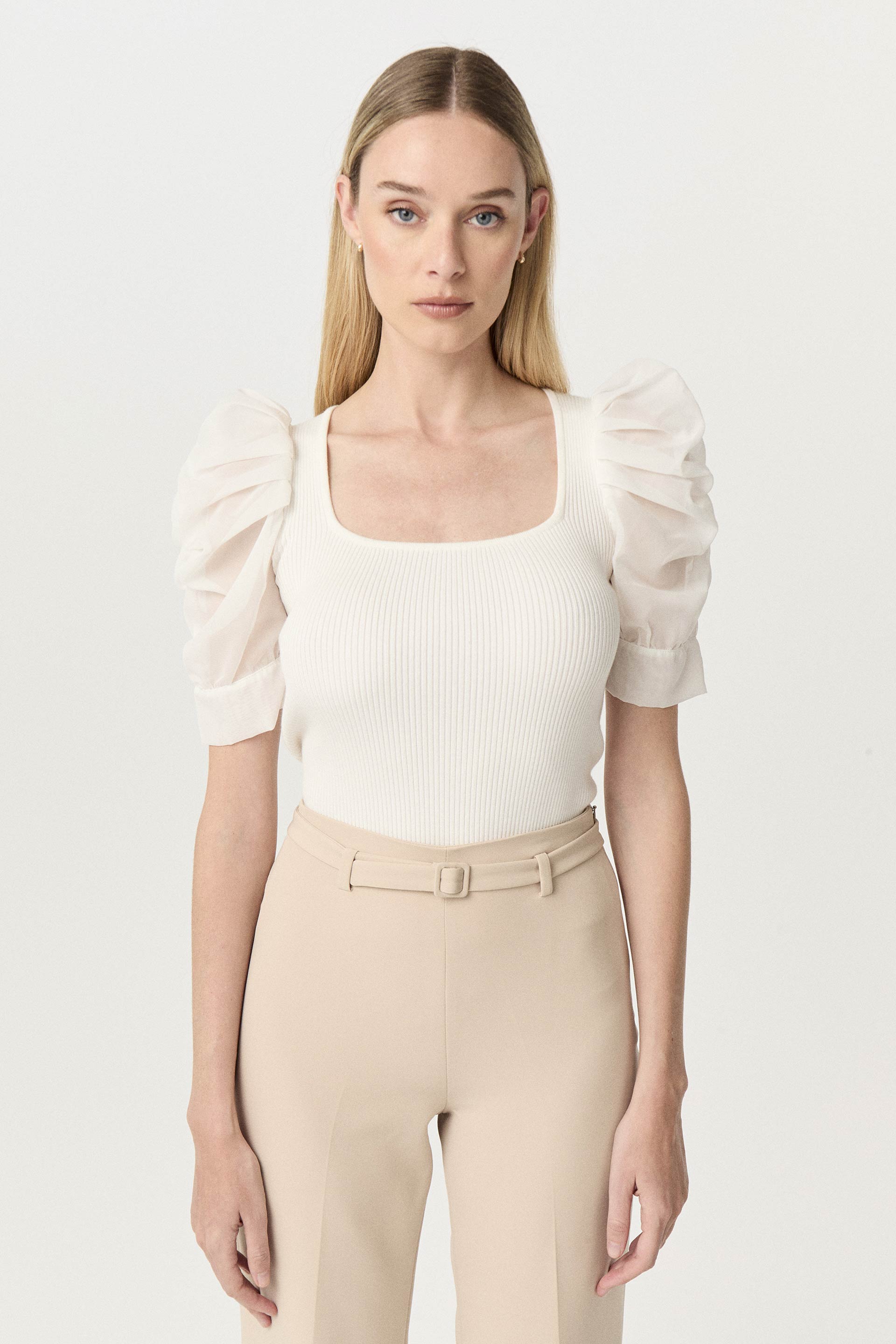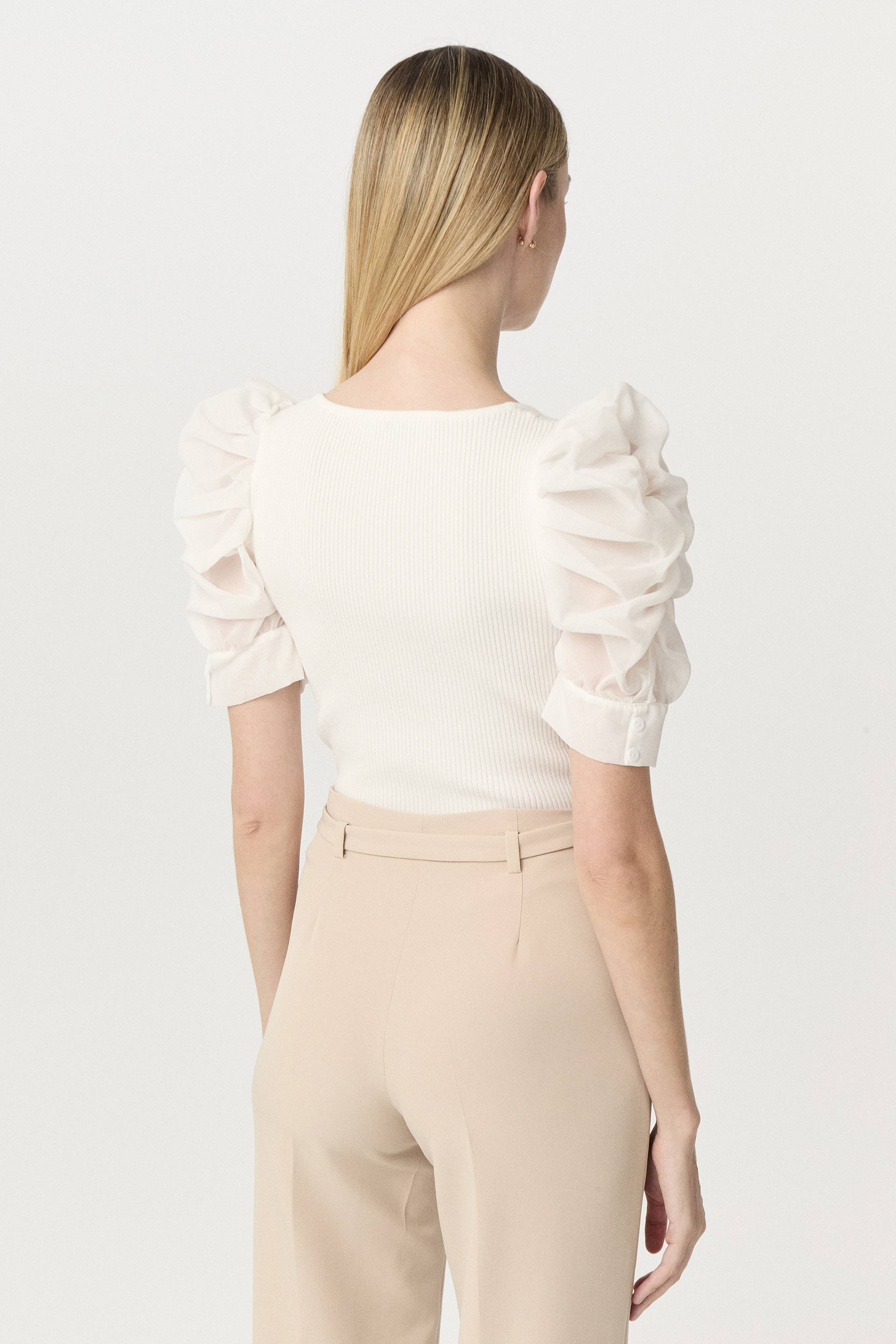 Remera tejida de punto acanalado con combinación de gasa a tono en mangas. De calce al cuerpo, posee escote cuadrado y mangas al codo con puff y puños. Una opción tan urbana como femenina.