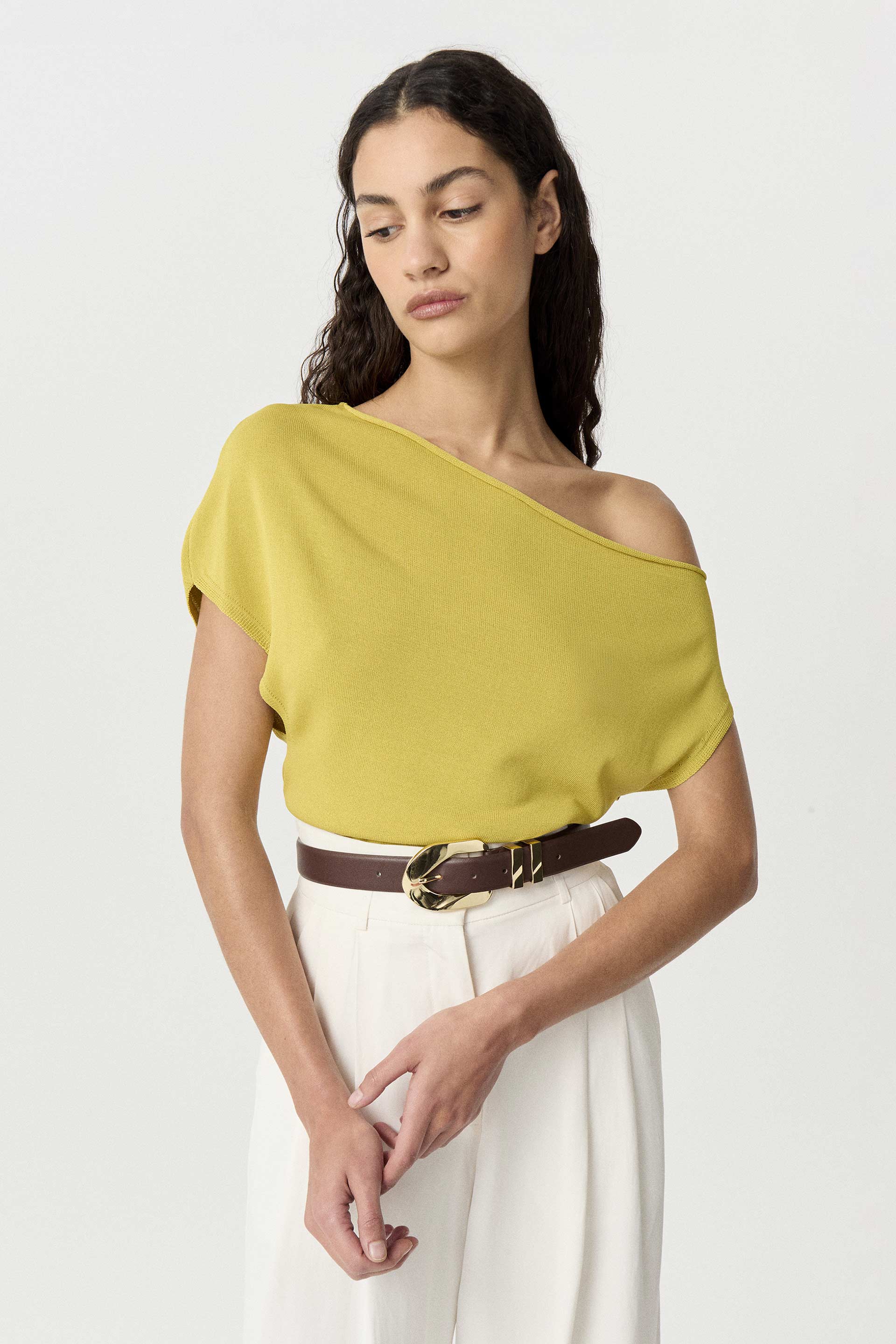 Remera tejida en punto liso de calce relajado. Diseño asimétrico de manga corta con hombro caído. Posee un escote diagonal ideal para mostrar piel, que brinda un toque sofisticado y descontracturado a la vez. Su silueta relajada la convierte en el ítem ideal para elevar tus básicos con un aire fresco y actual.