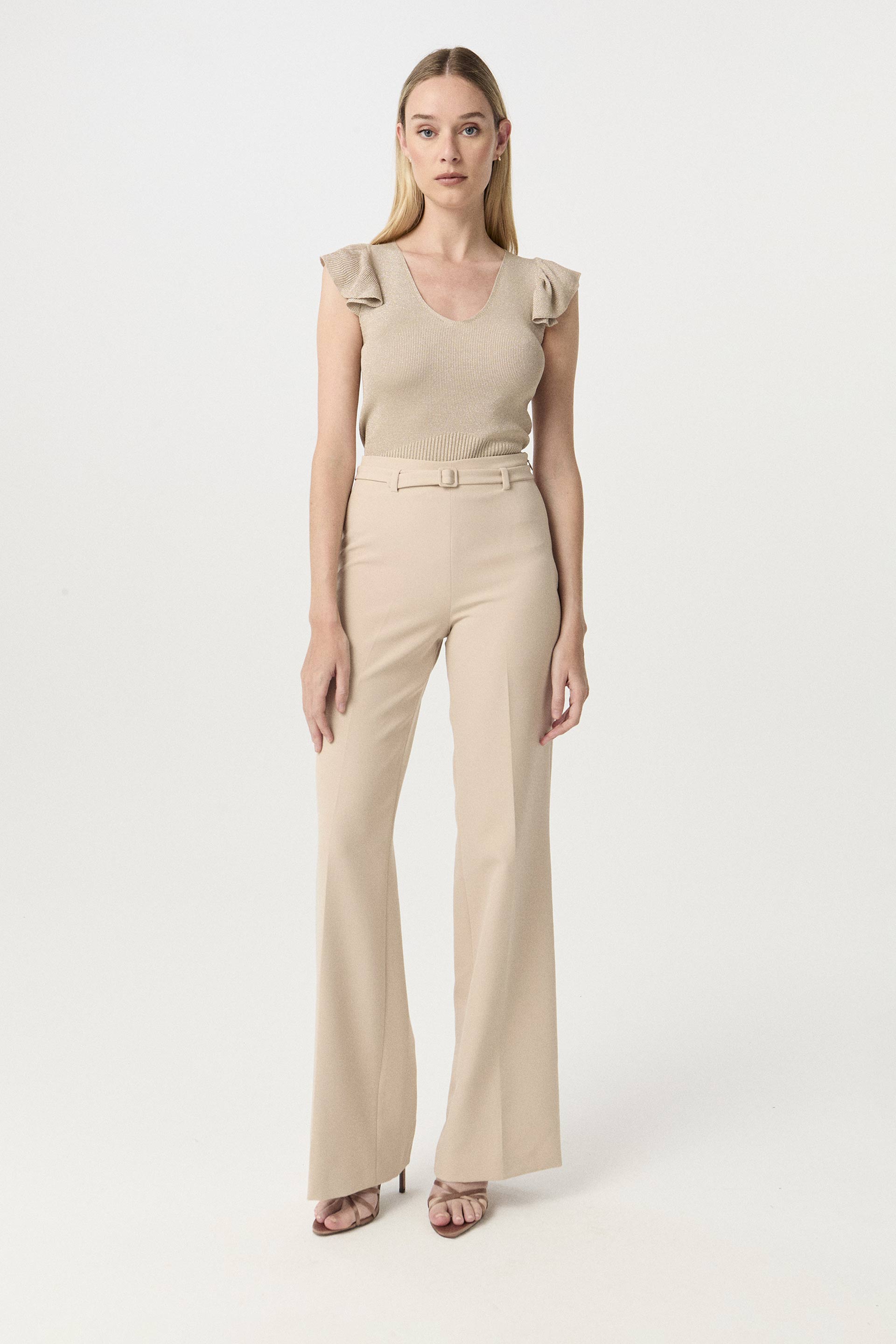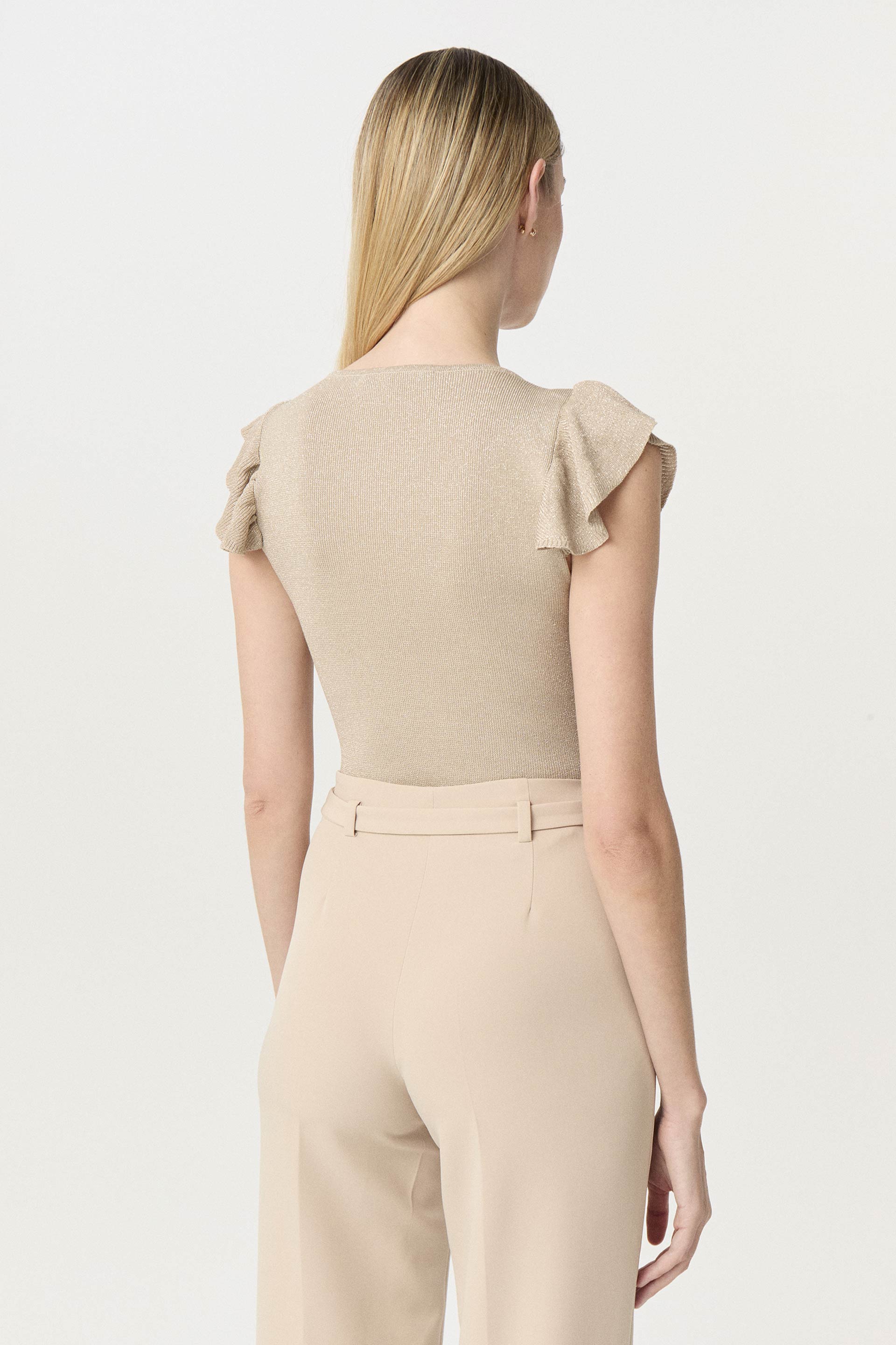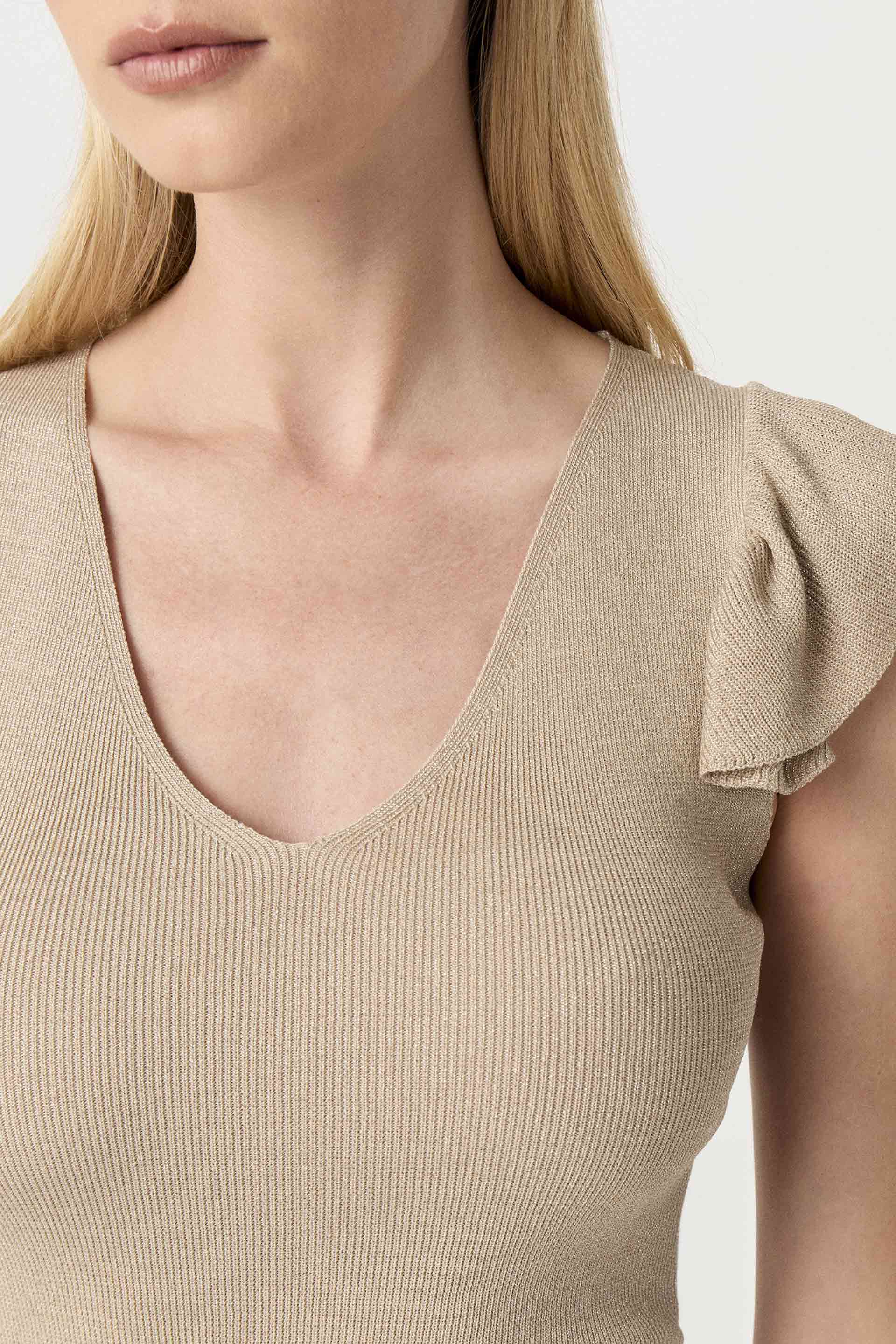 Remera tejida con lurex de calce al cuerpo. Los volados en sisas le añaden un toque romántico que, combinadas con su escote delantero en V, conforman un ítem versátil para destacar en todos tus eventos.