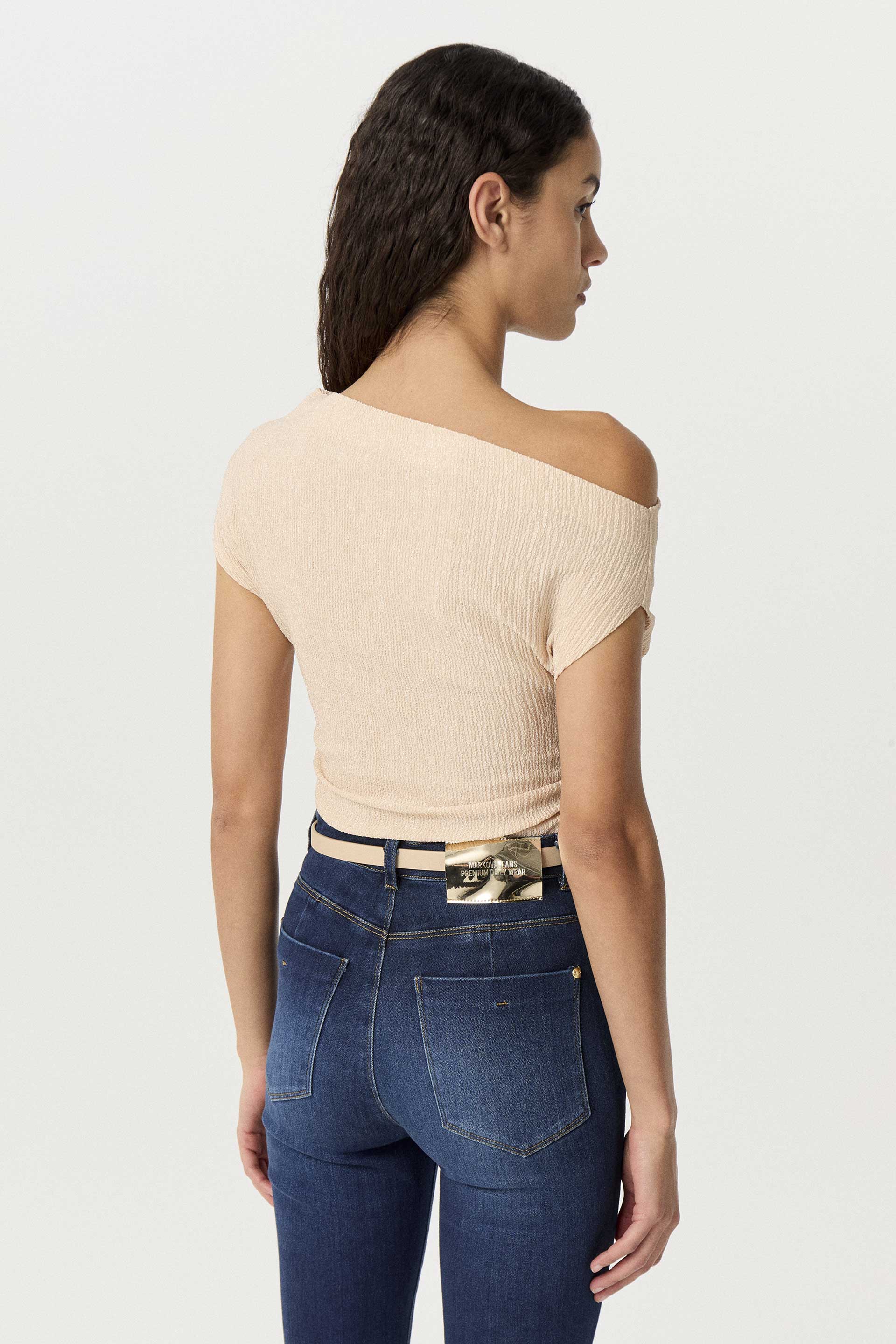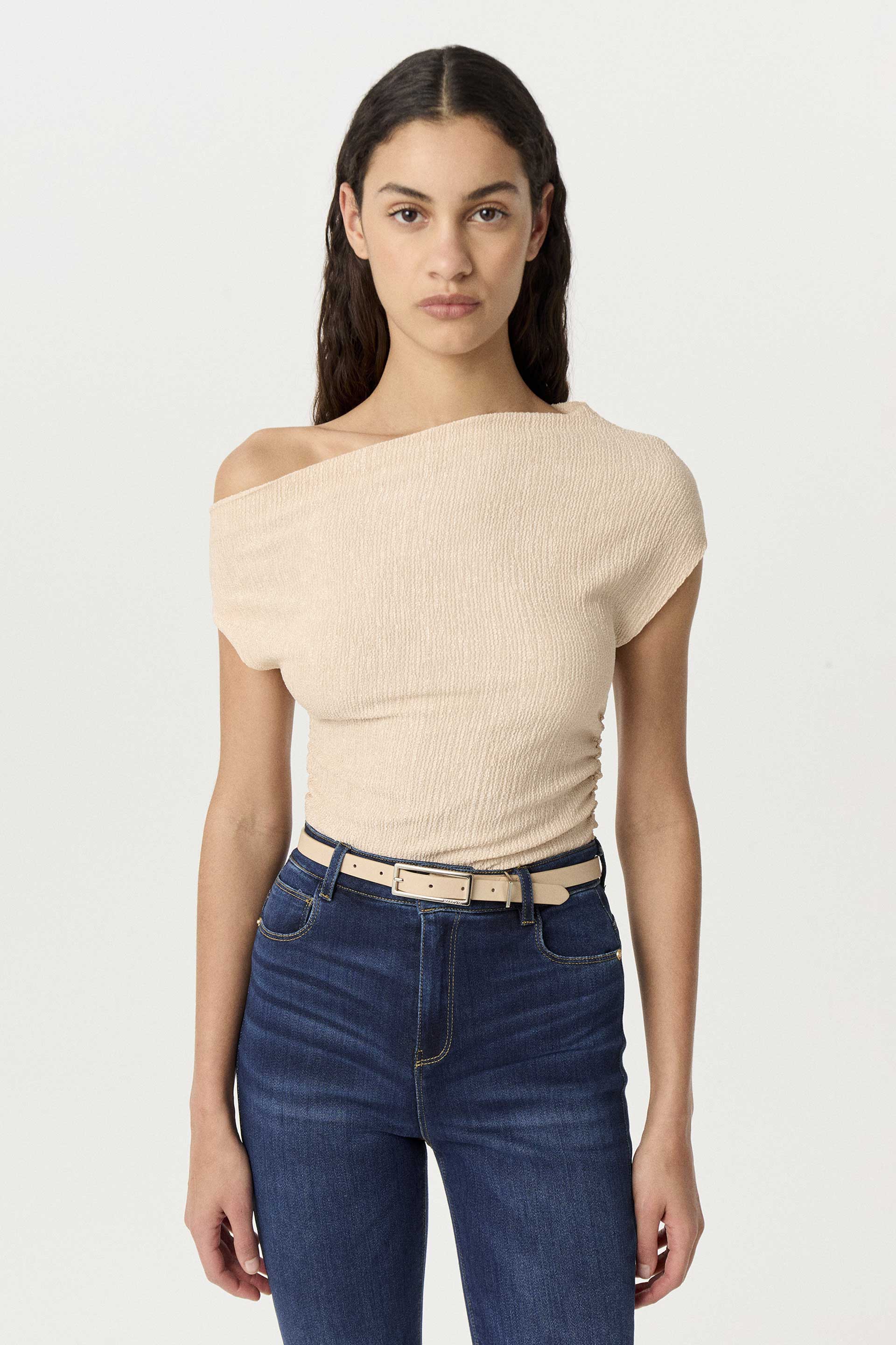 Remera de punto fantasía 3D, de calce al cuerpo. Mangas cortas y corte asimétrico, con escote diagonal. Perfecta para sumar textura a tus looks.