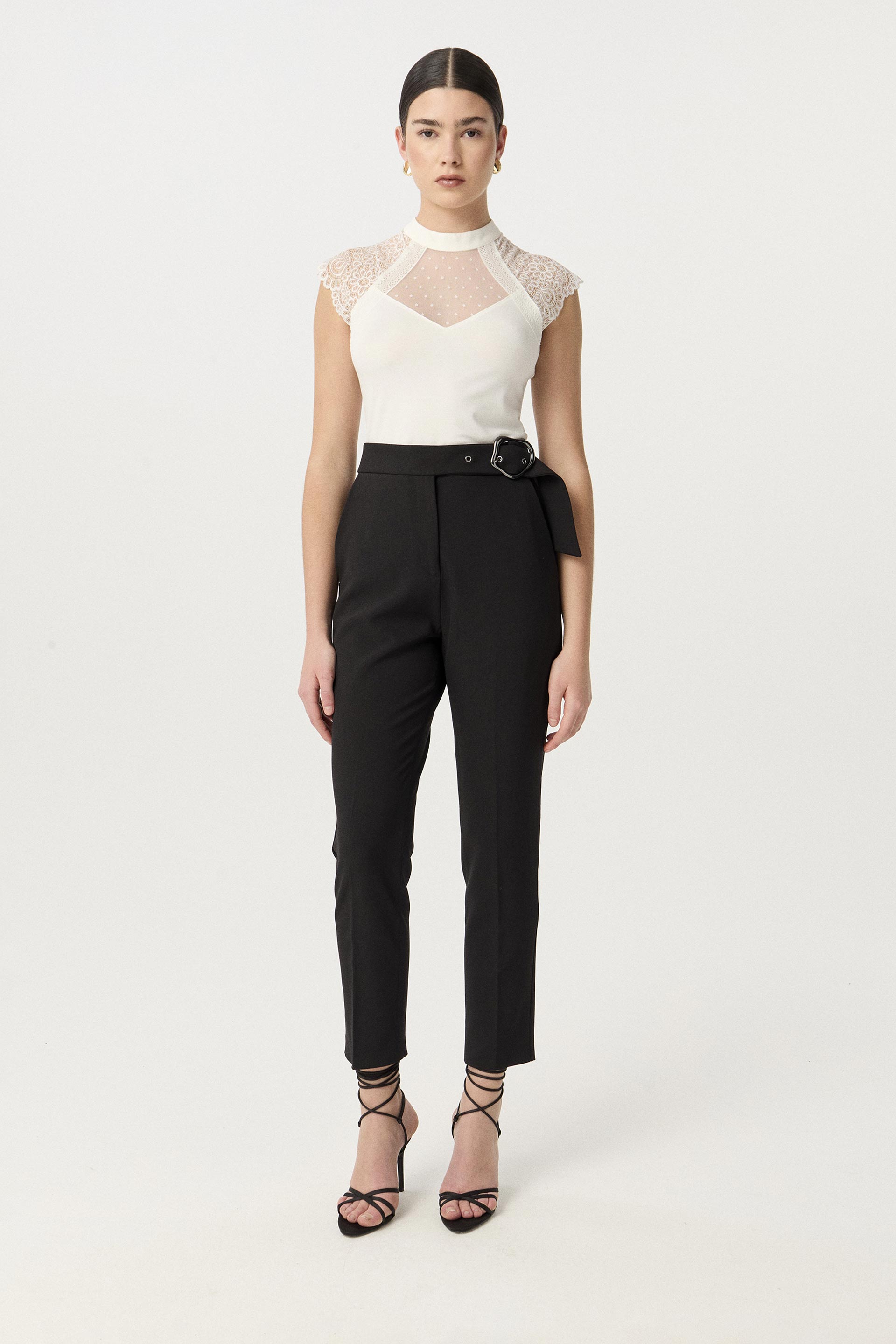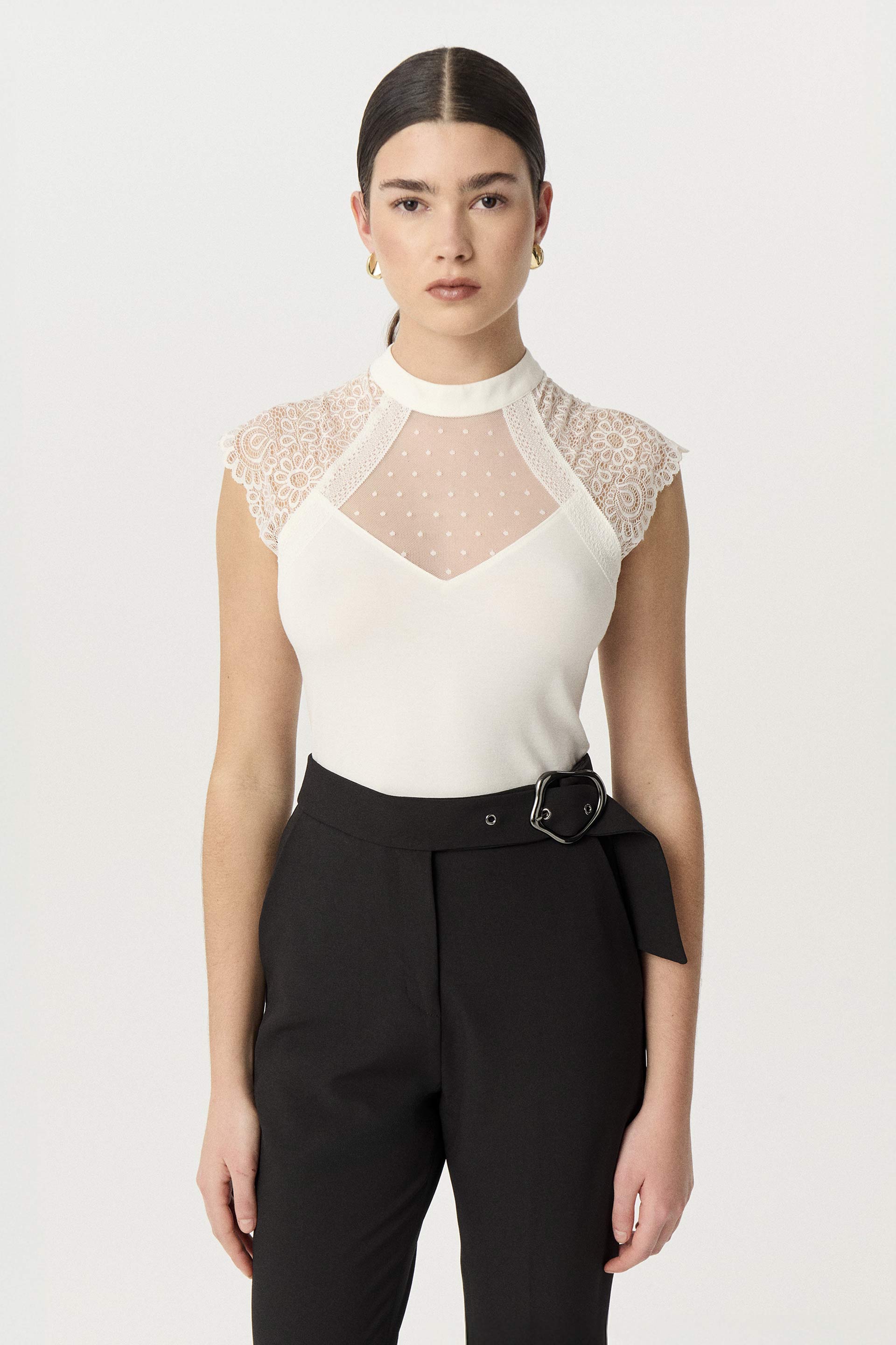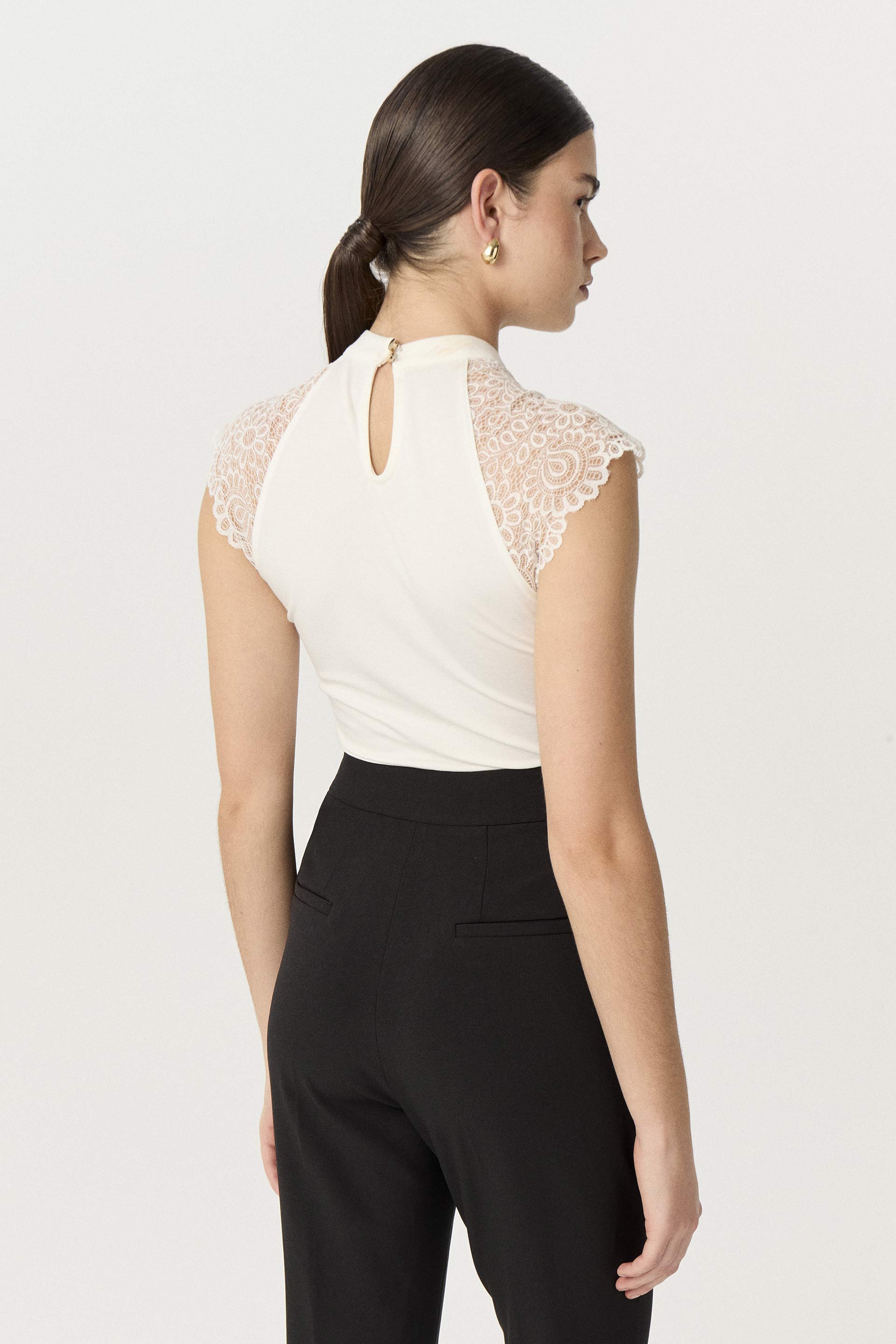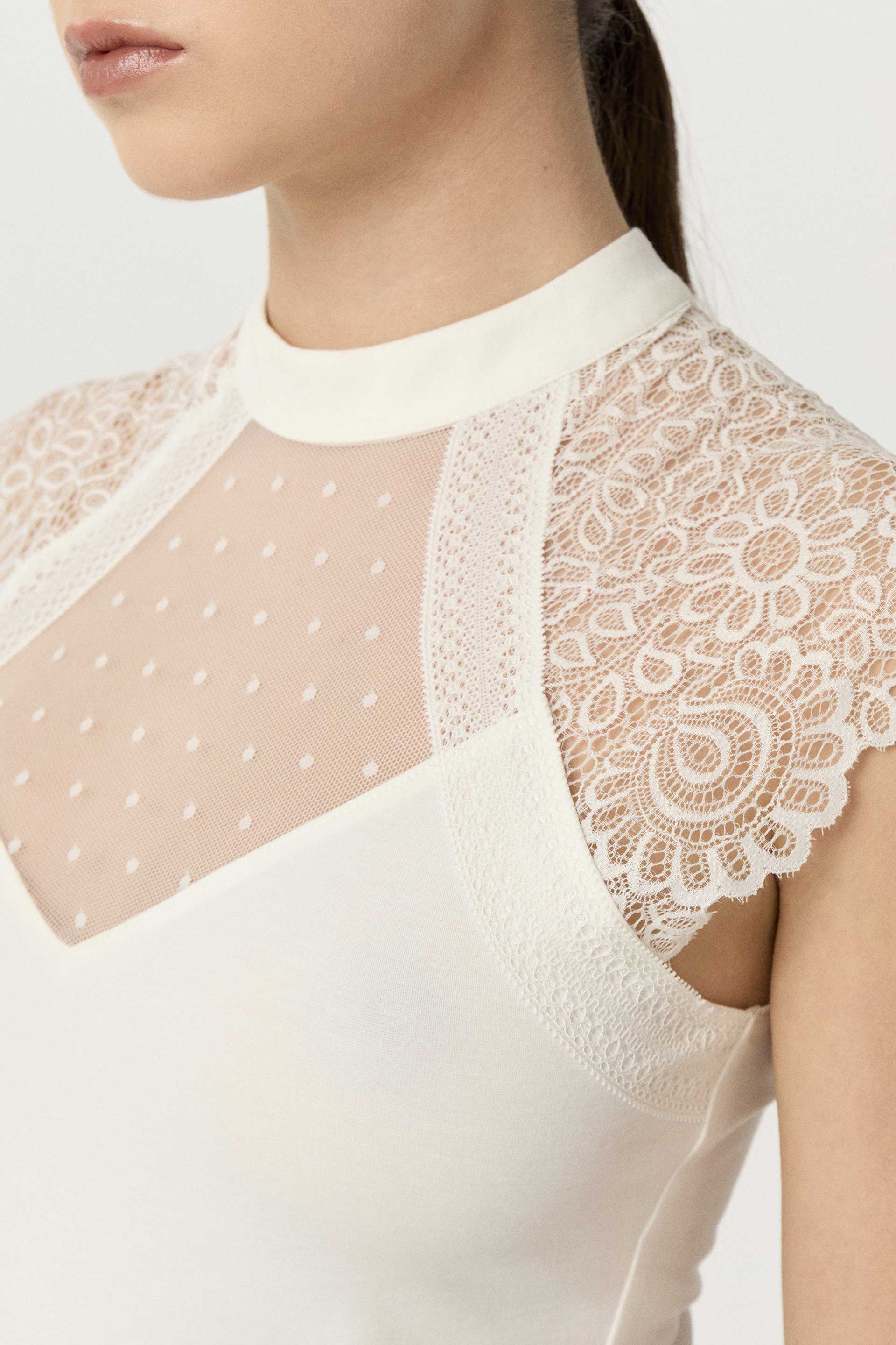 Remera de microfibra opaca combinada con microtul plumetí en escote, y encaje en hombros. De calce anatómico, posee manga ranglan, cuello semipolera, escote en V y hombro caído. Usala con tus looks de oficina o para una salida de noche.