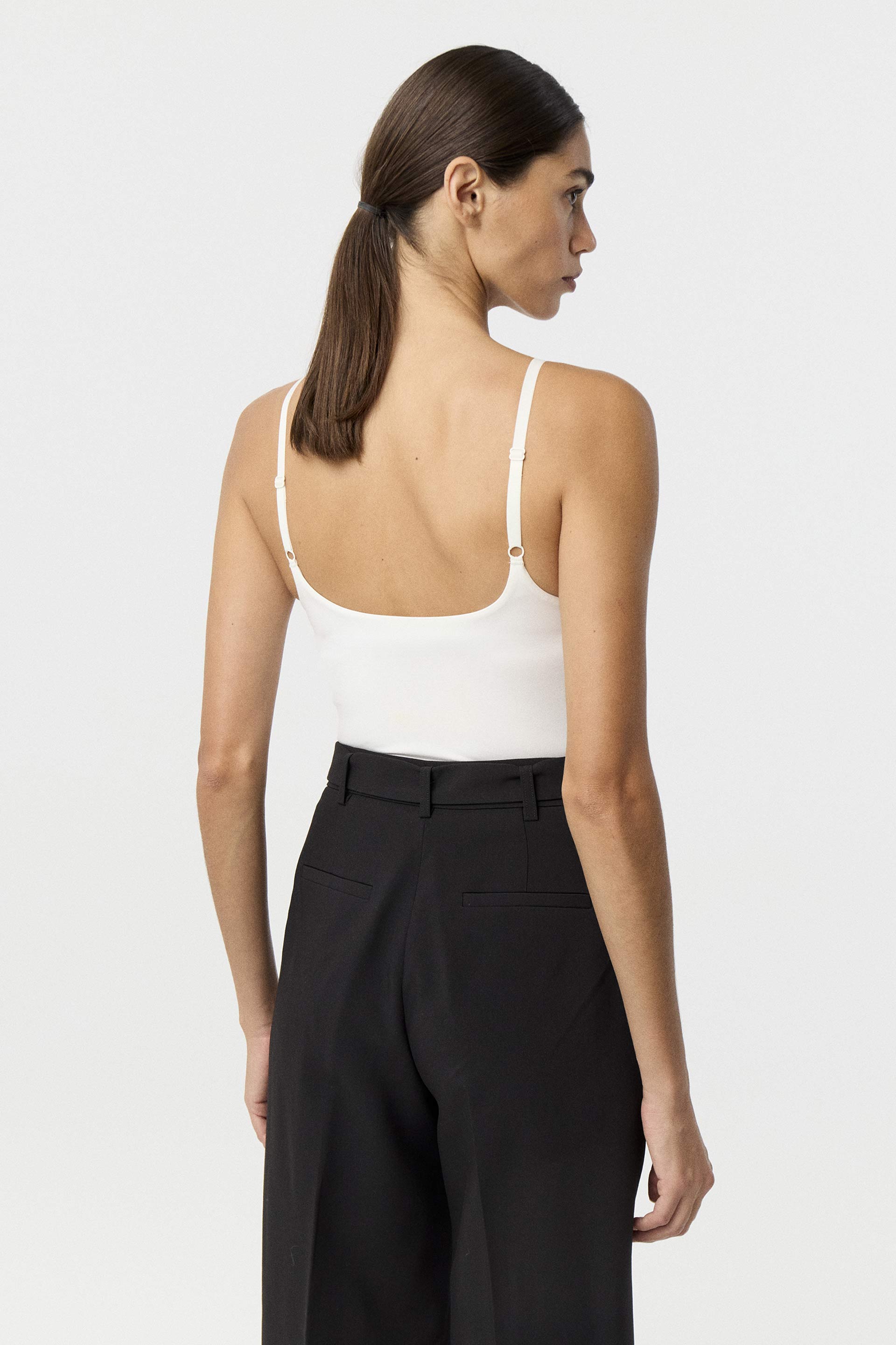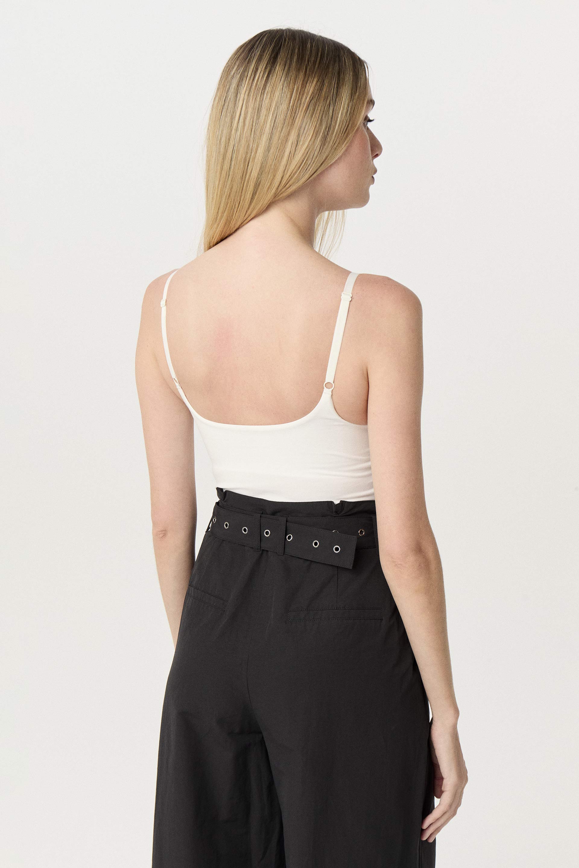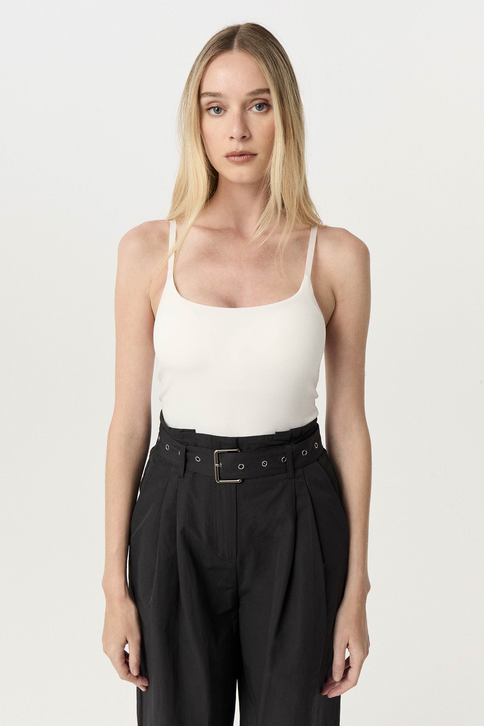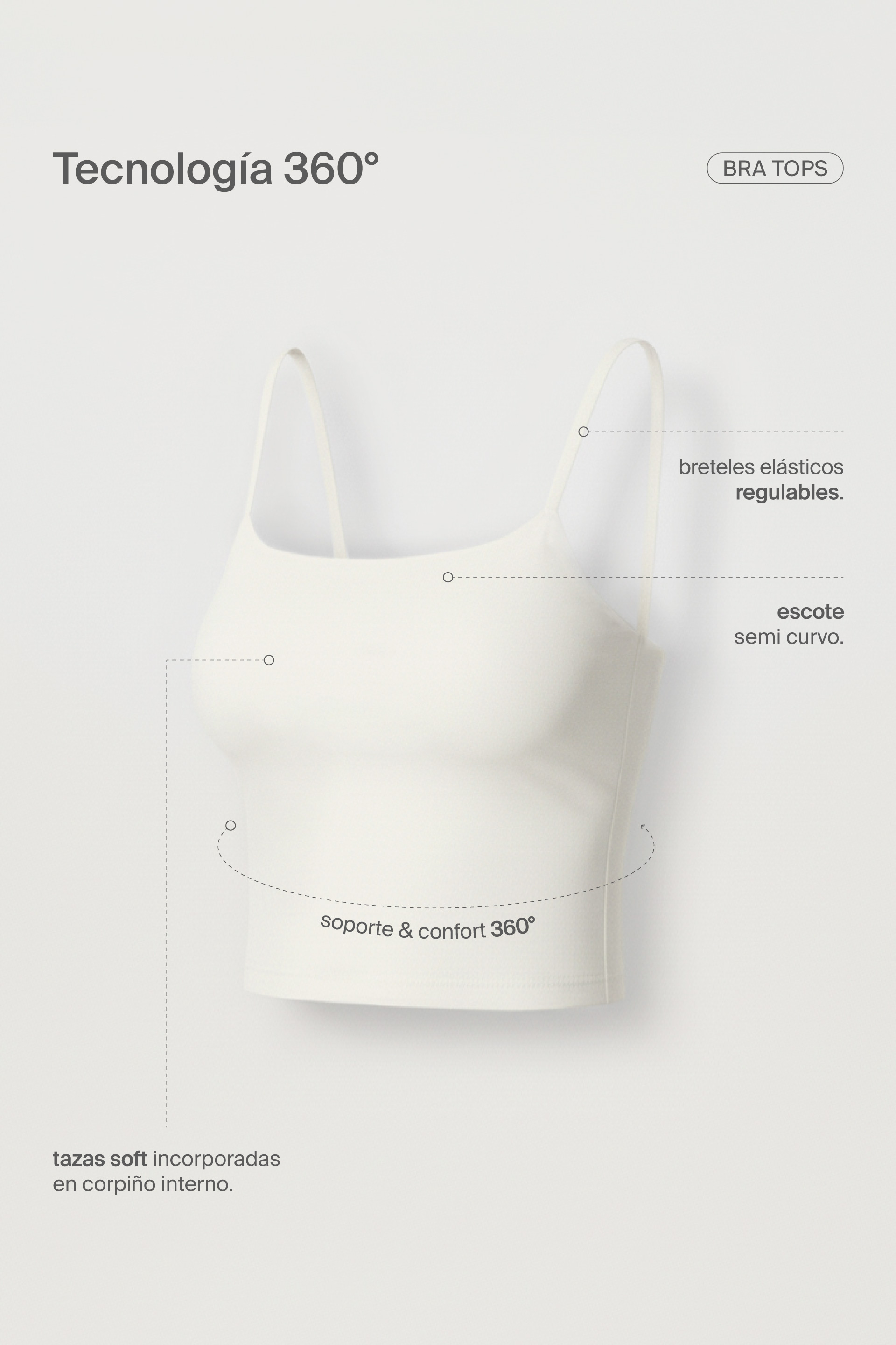 Musculosa de algodón modal con spandex de calce anatómico. Breteles elásticos regulables y escote semicurvo, con tazas soft incorporadas en corpiño interno para soporte y confort.